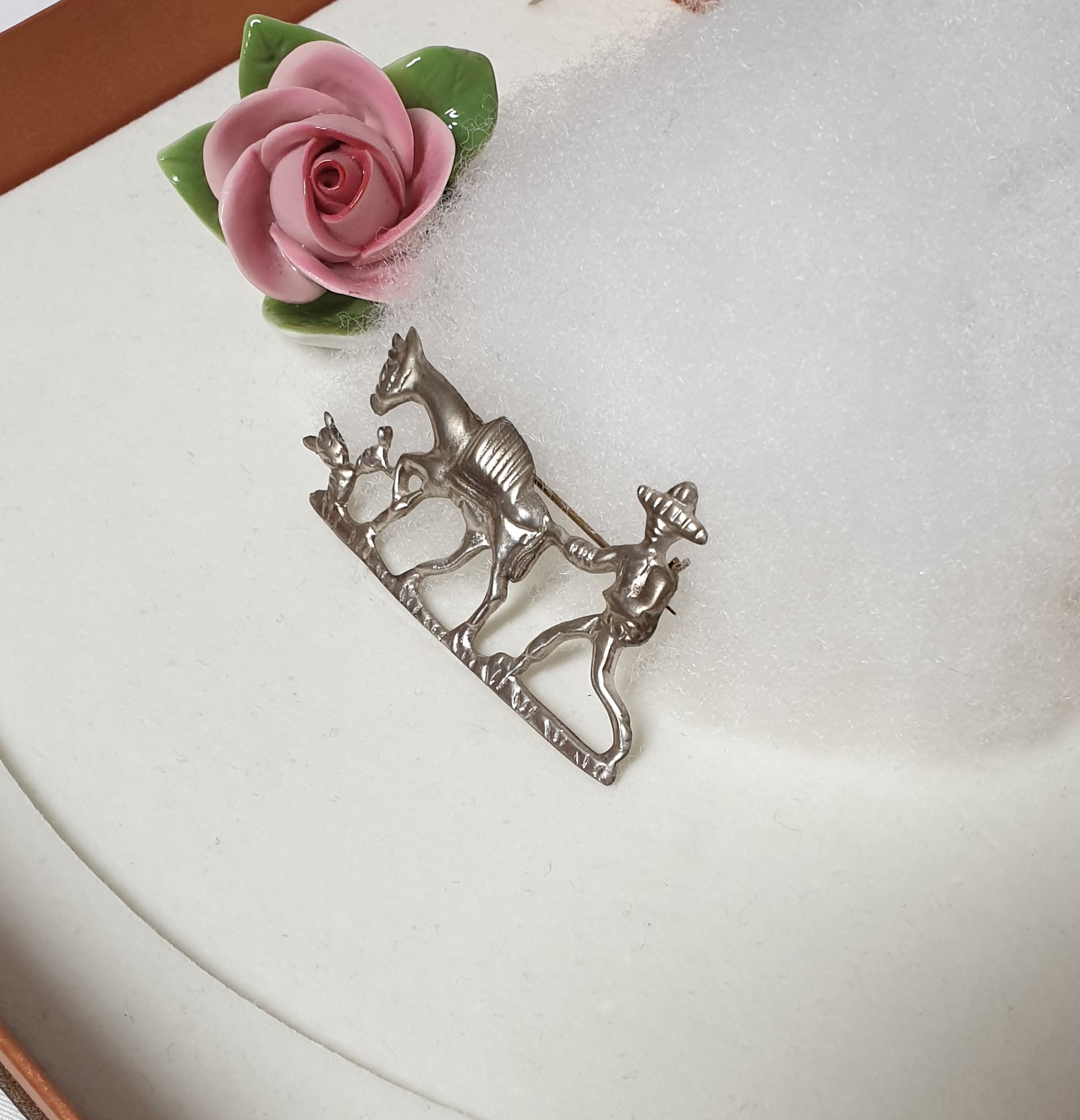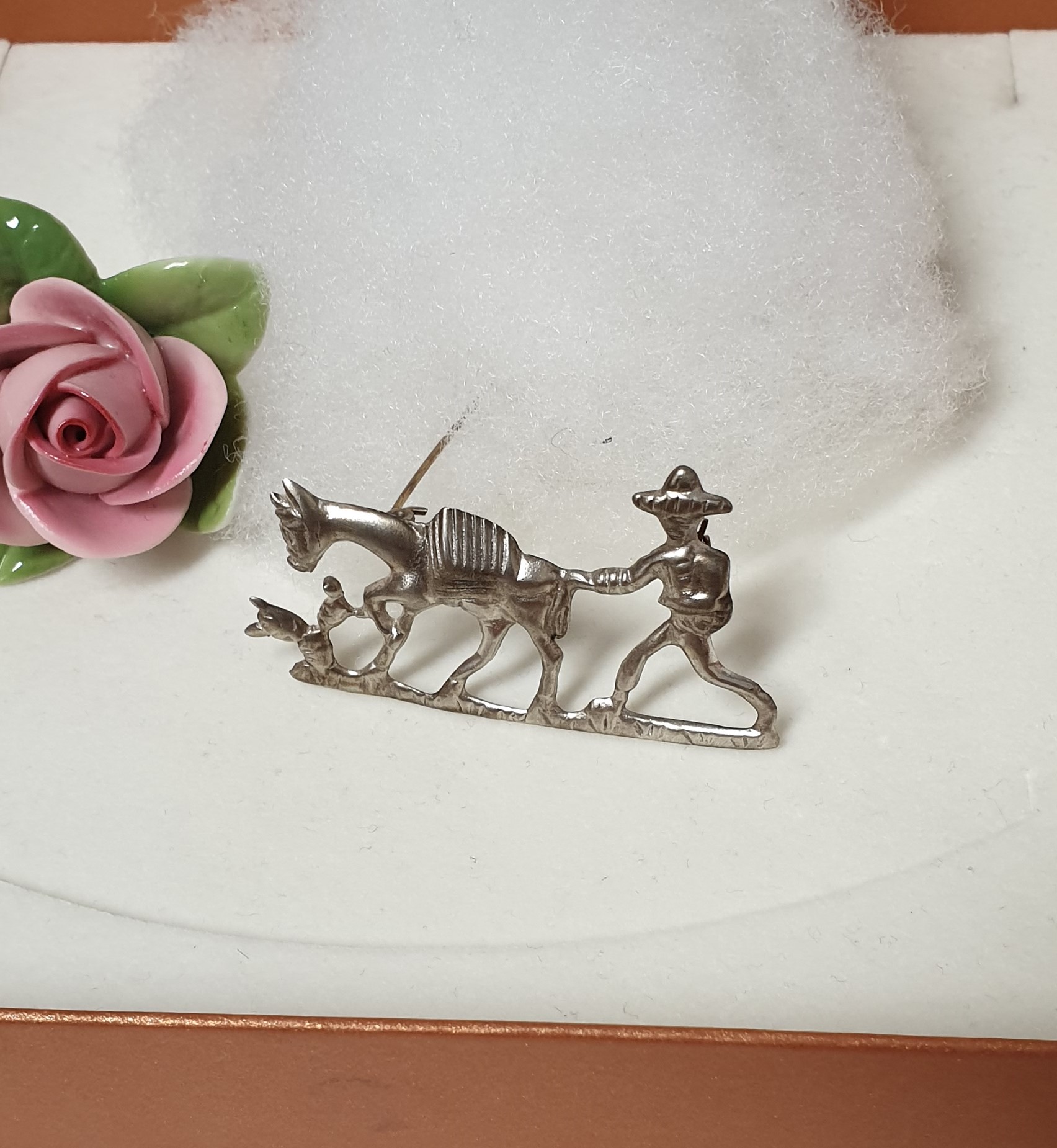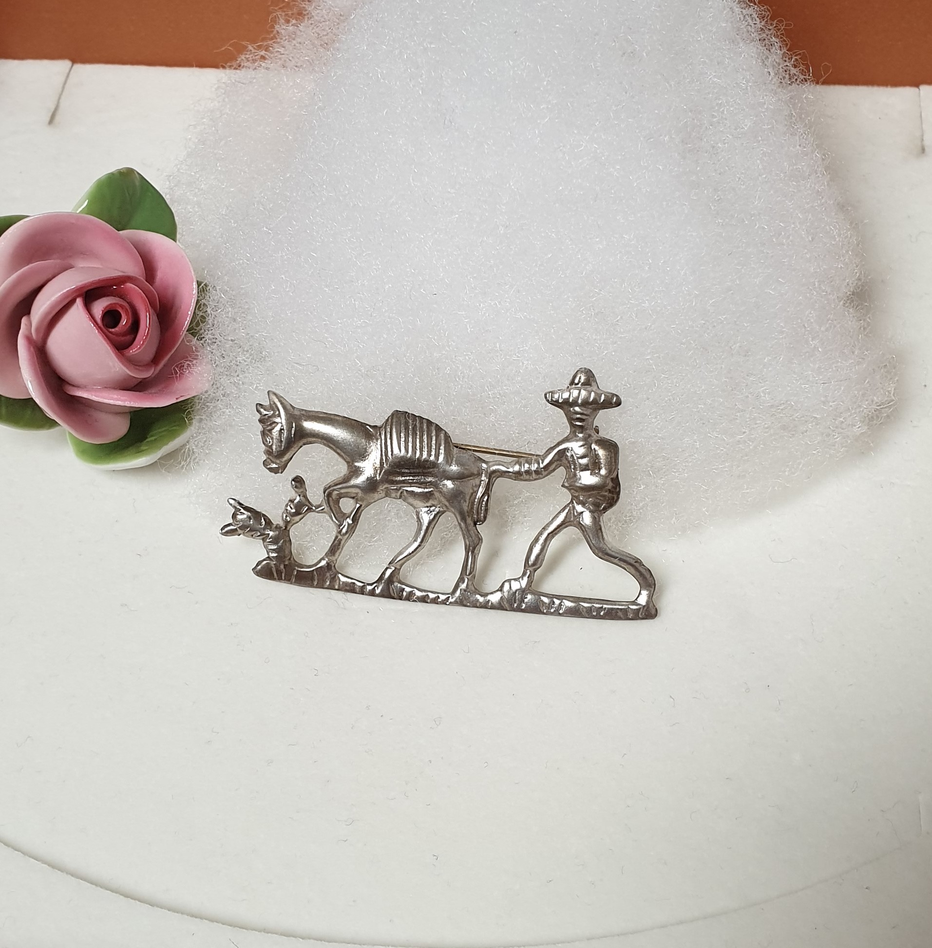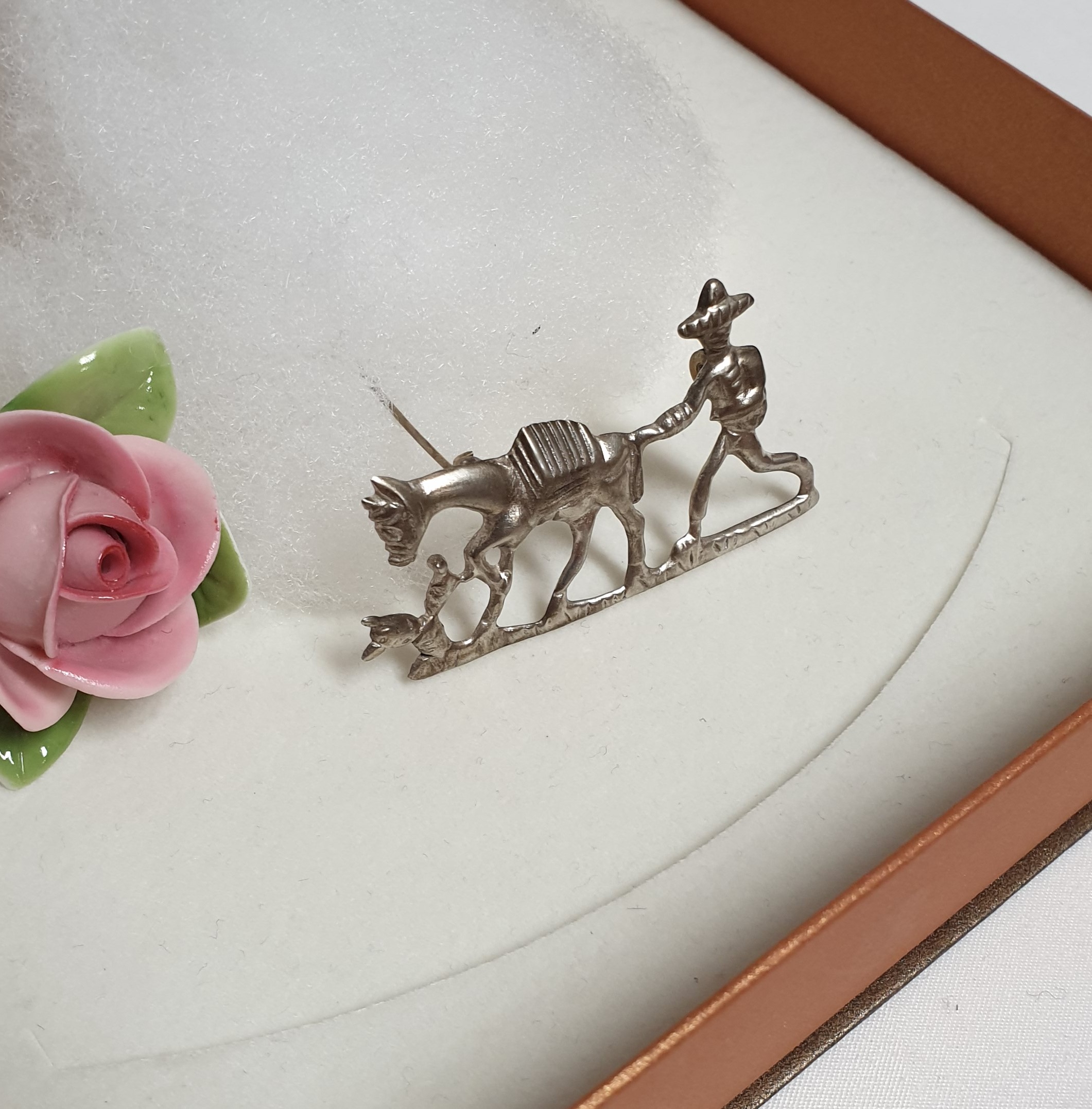 Hübsche nostalgische Brosche Mann mit Esel / Pferd. Diese handgearbeitete Silberbrosche ist aus Silber 925 gefertigt. Ein hübsches Vintage-Stück.