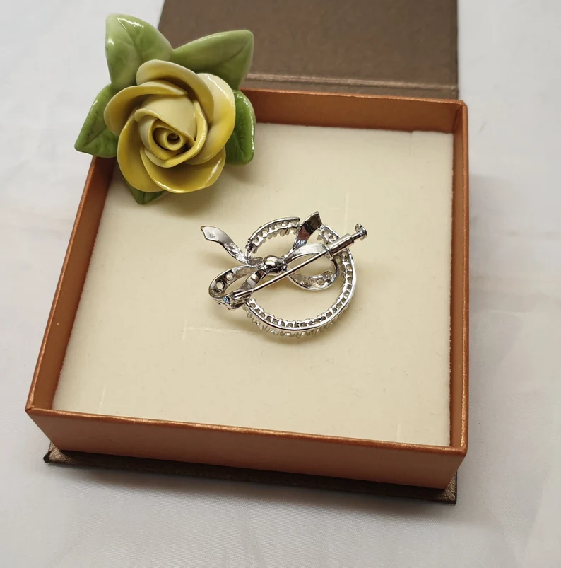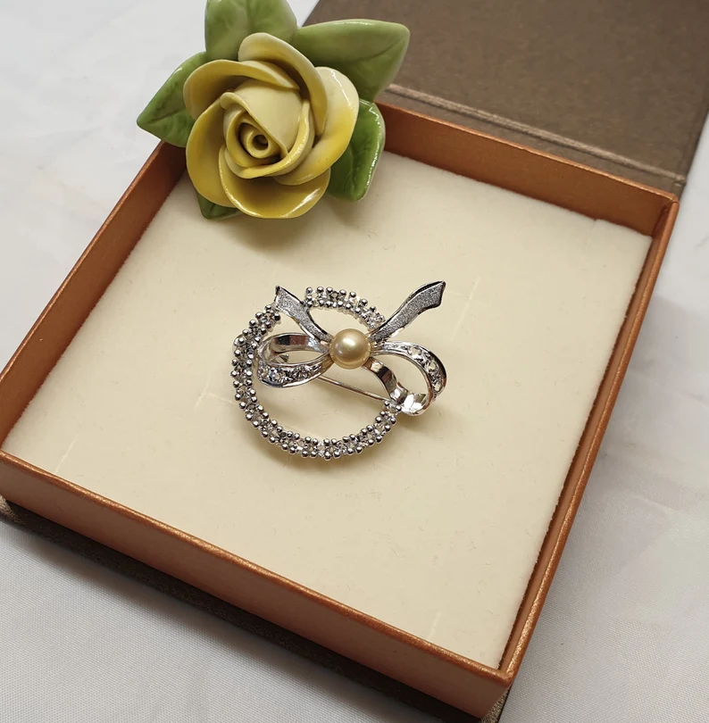 Brosche Anstecknadel Schleife Silber 915 Perle & Kristalle edel Vintage SB394