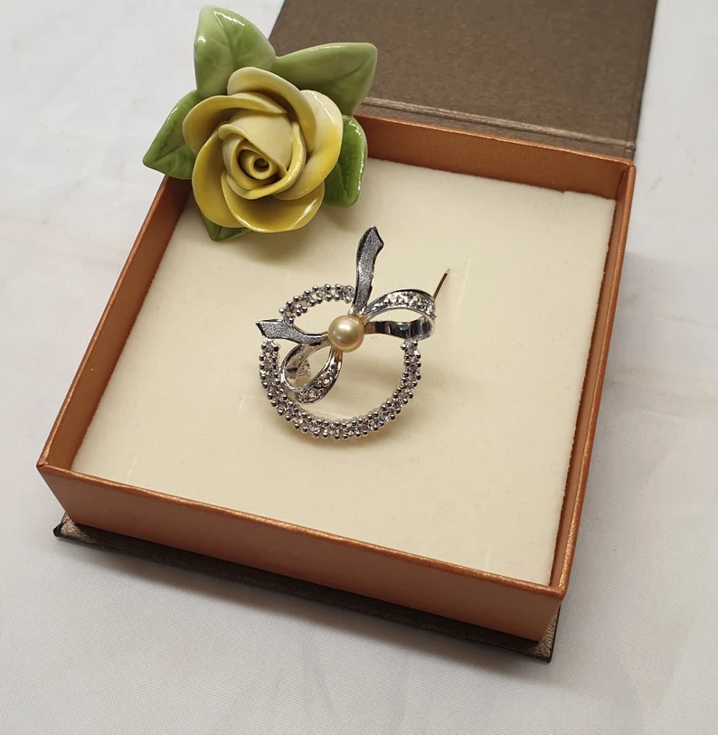 Eine bezaubernde Brosche Schleife Silber 915 mit 1 Perle und Kristallsteinen verziert.