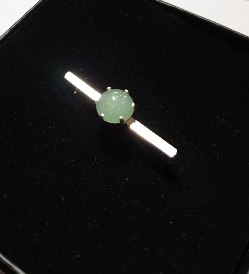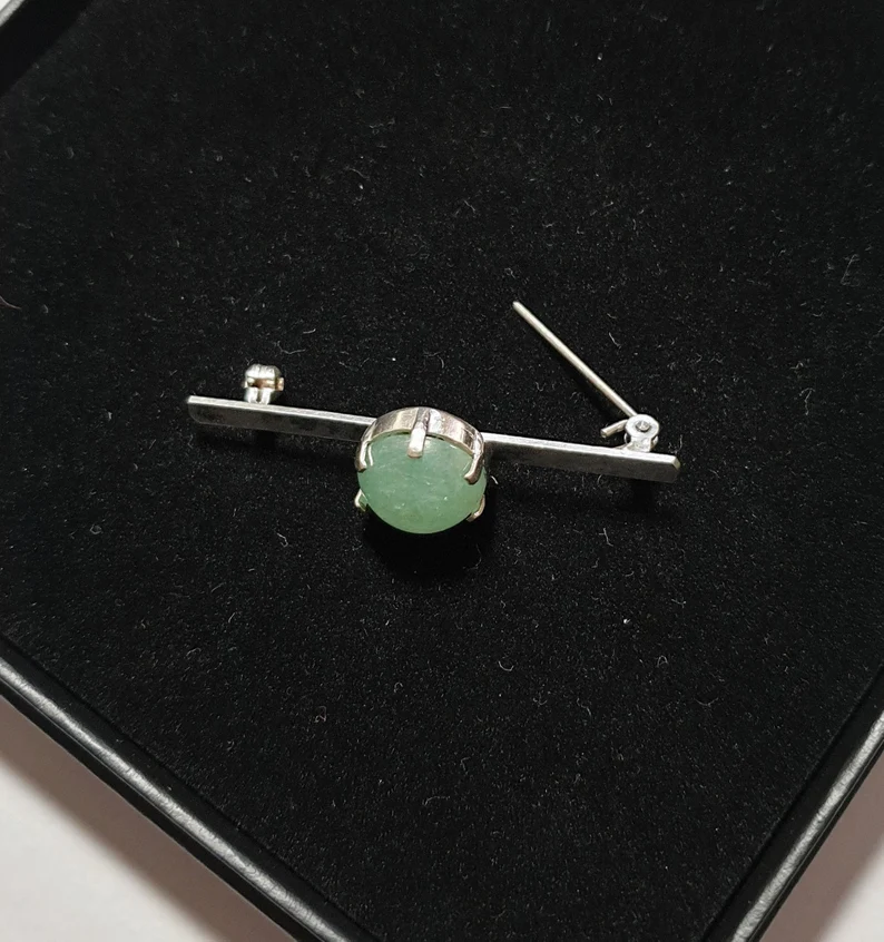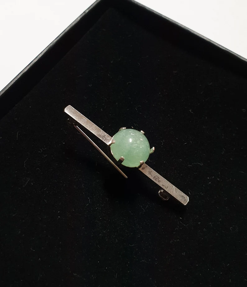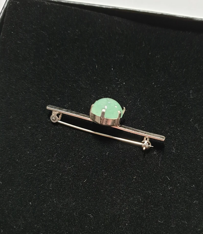 Elegante Vintage-Brosche, Silber 835 in schlichter Eleganz gearbeitet. Den besonderen Akzent setzt der tolle hellgrüne Aventurin, der mit einer Krappenfassung befestigt ist. Ein tolles Schmuckstück!