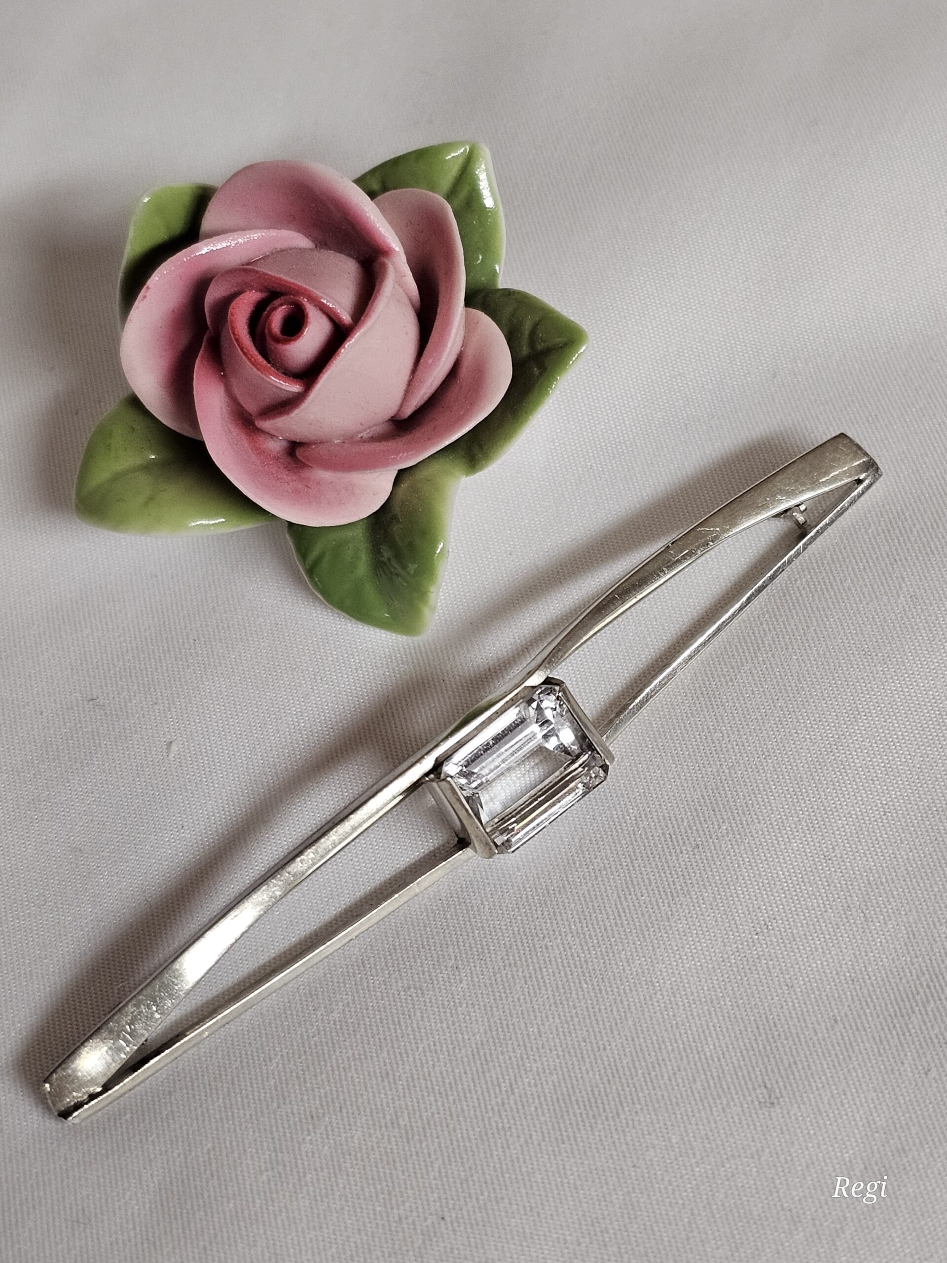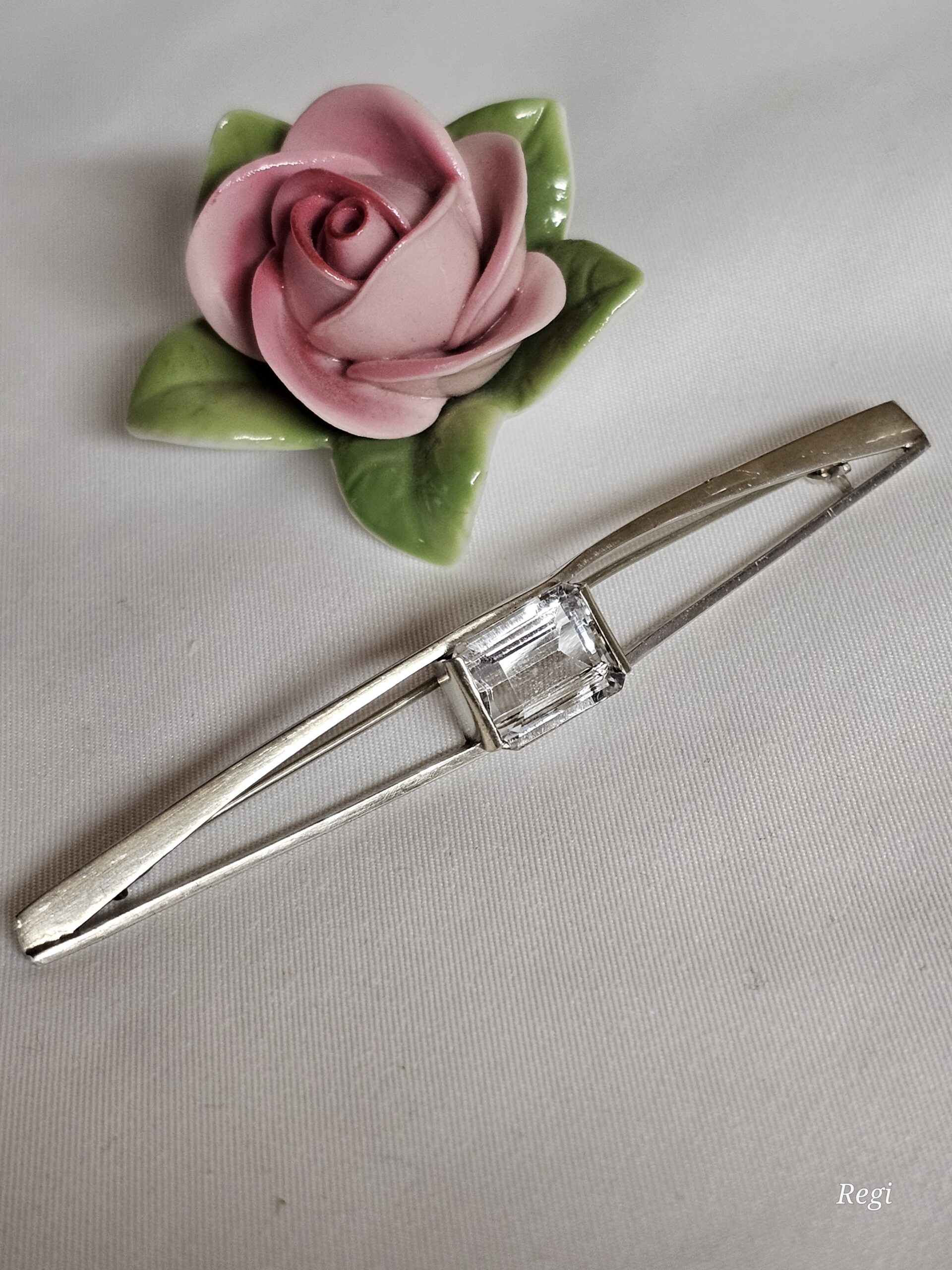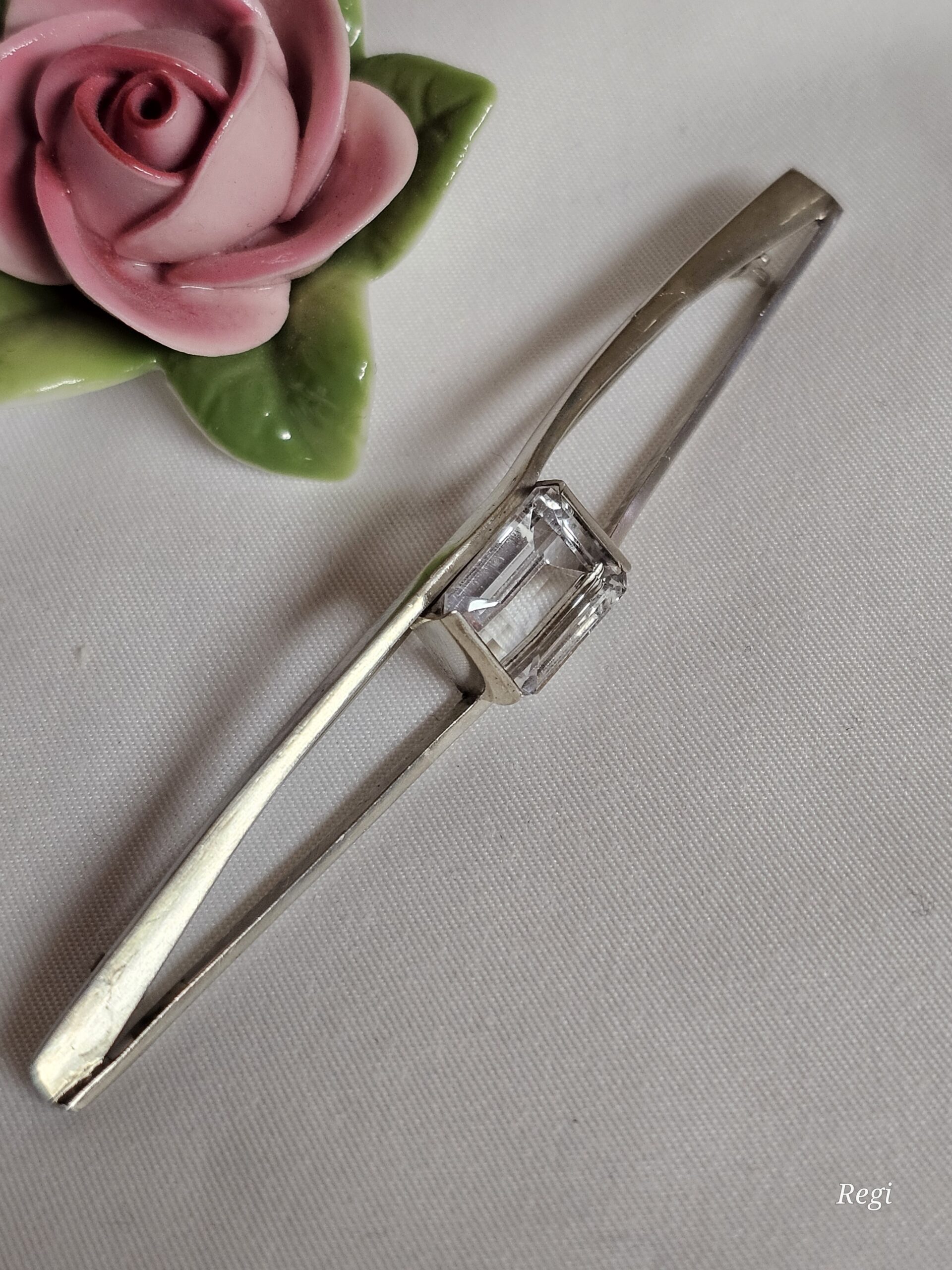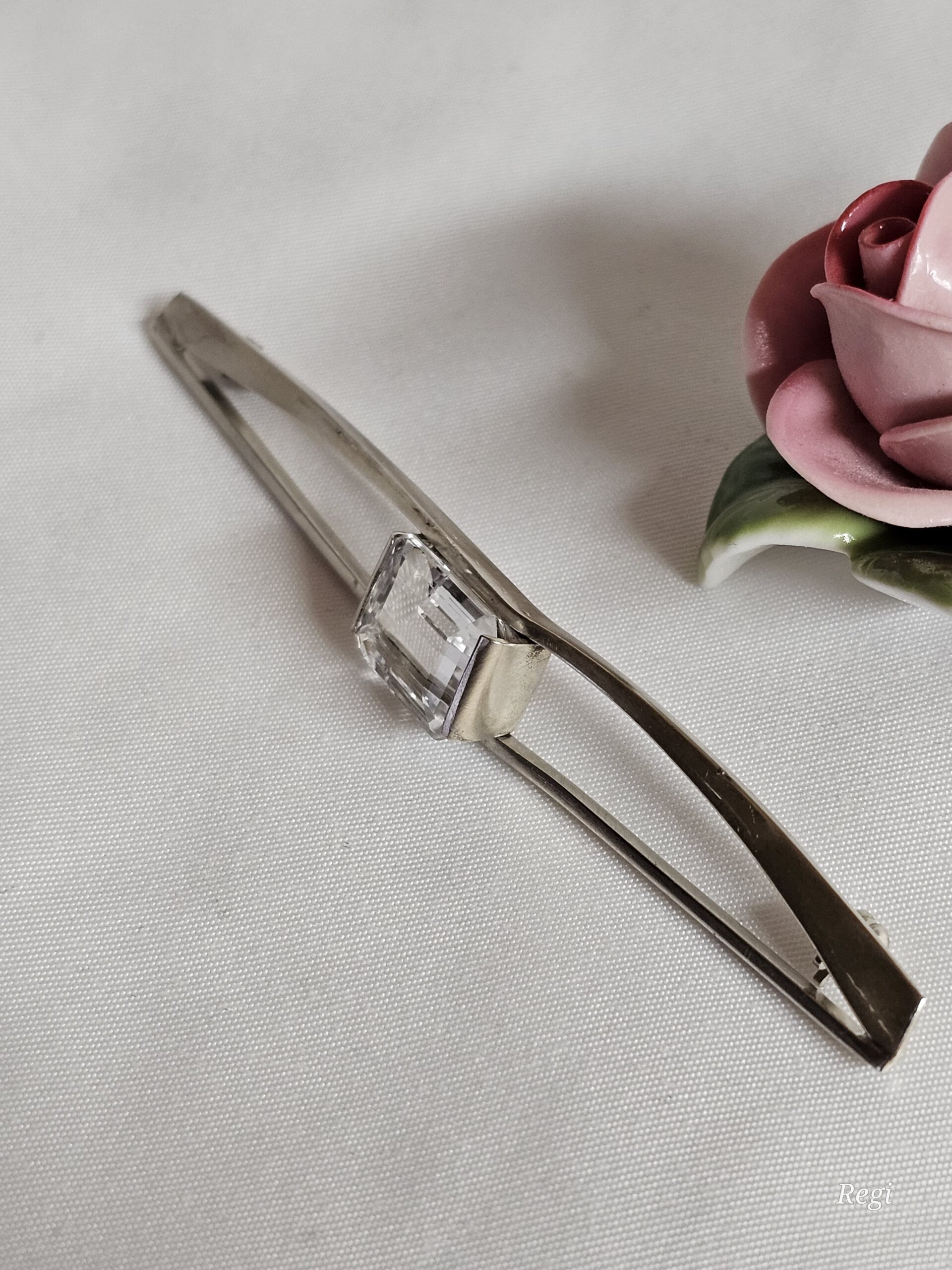 Eine stylisch extravagante Brosche Silber 925 mit einem klaren Kristallstein verziert. Ein edles Vintage-Schmuckstück – wunderschön!