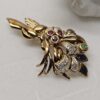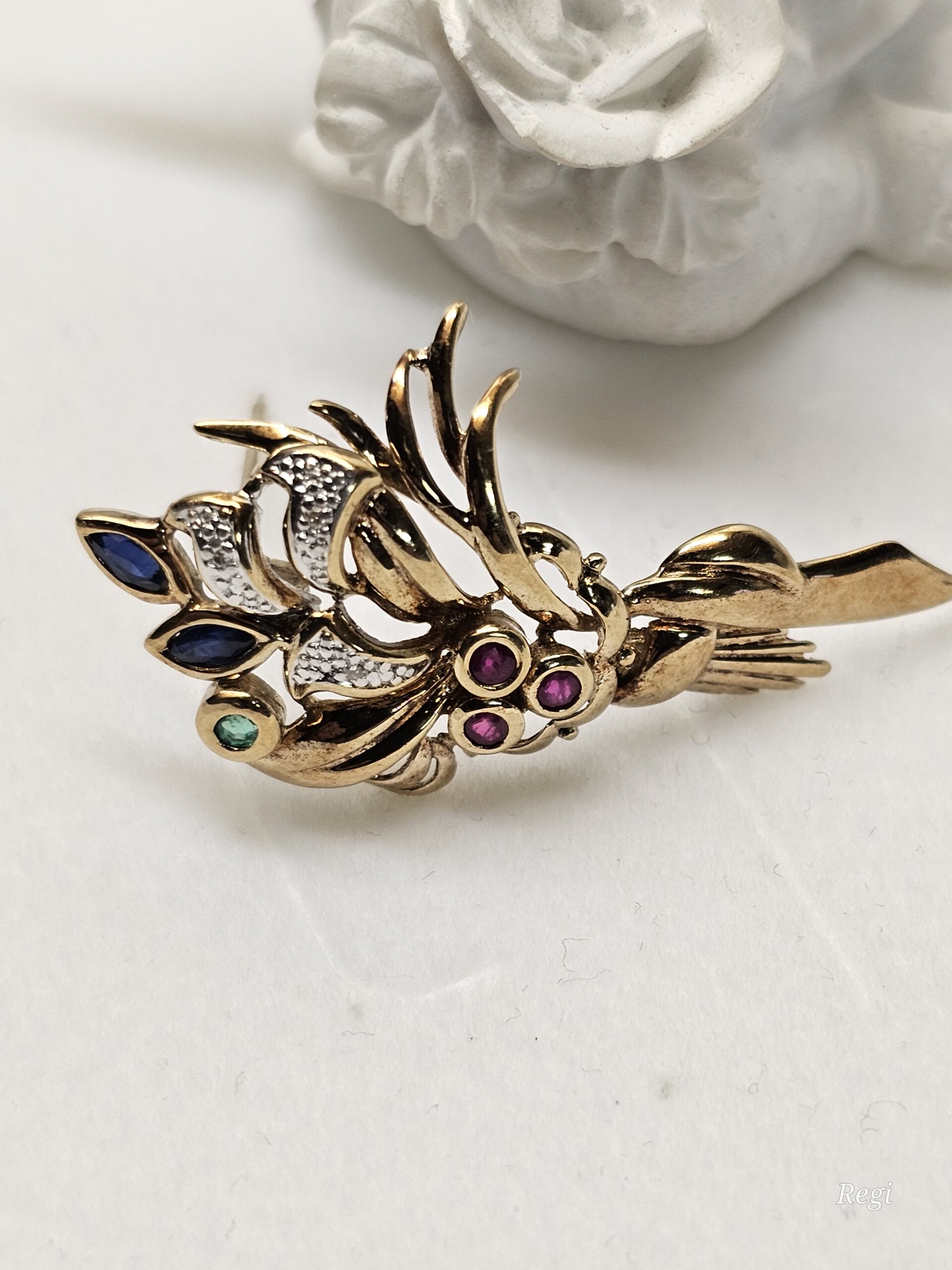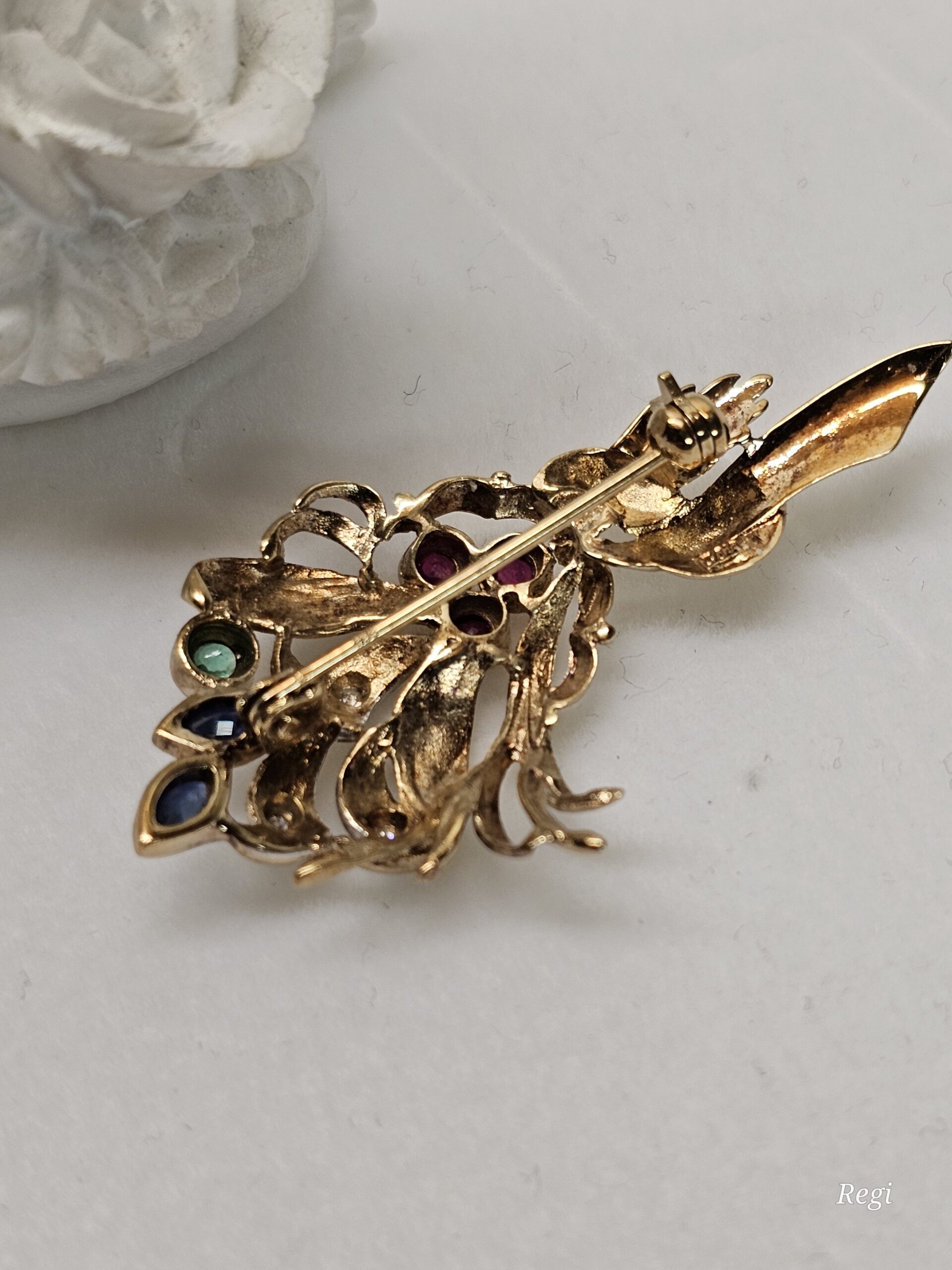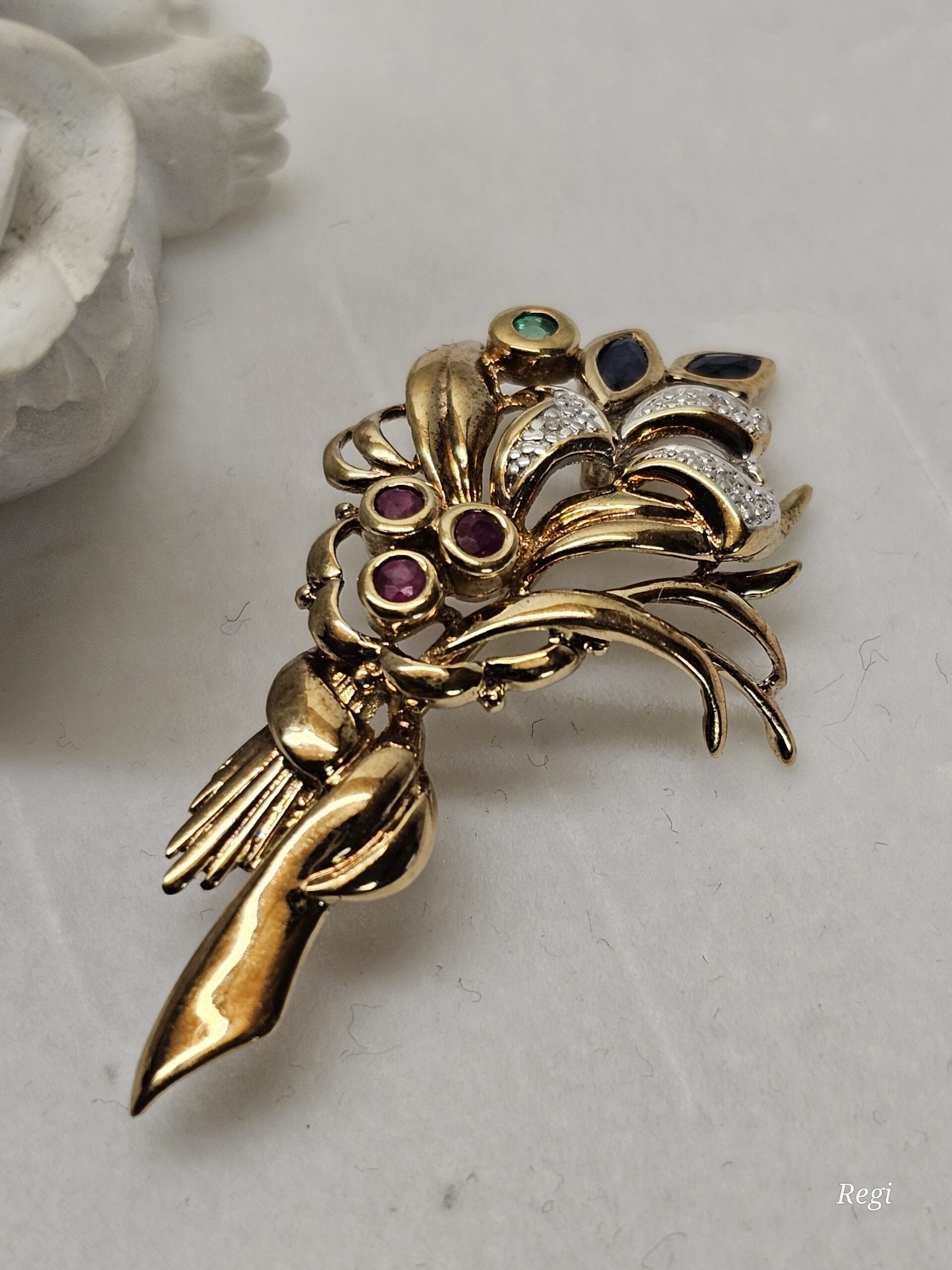 Elegante Brosche aus Gold 585. Das schöne Stück ist wunderschön als Blumenbouquet ausgearbeitet und trägt 1 Stck. Smaragd, 2 Stck. Saphire, 3 Stck. Rubine sowie 3 kleinste Diamantsteinchen auf teilplatiniertem Untergrund.
