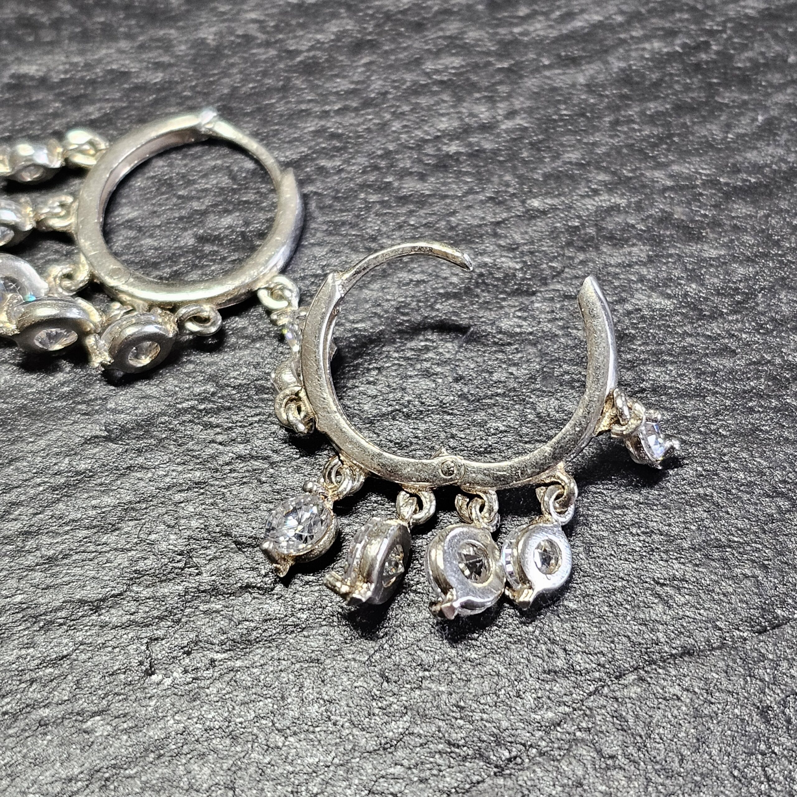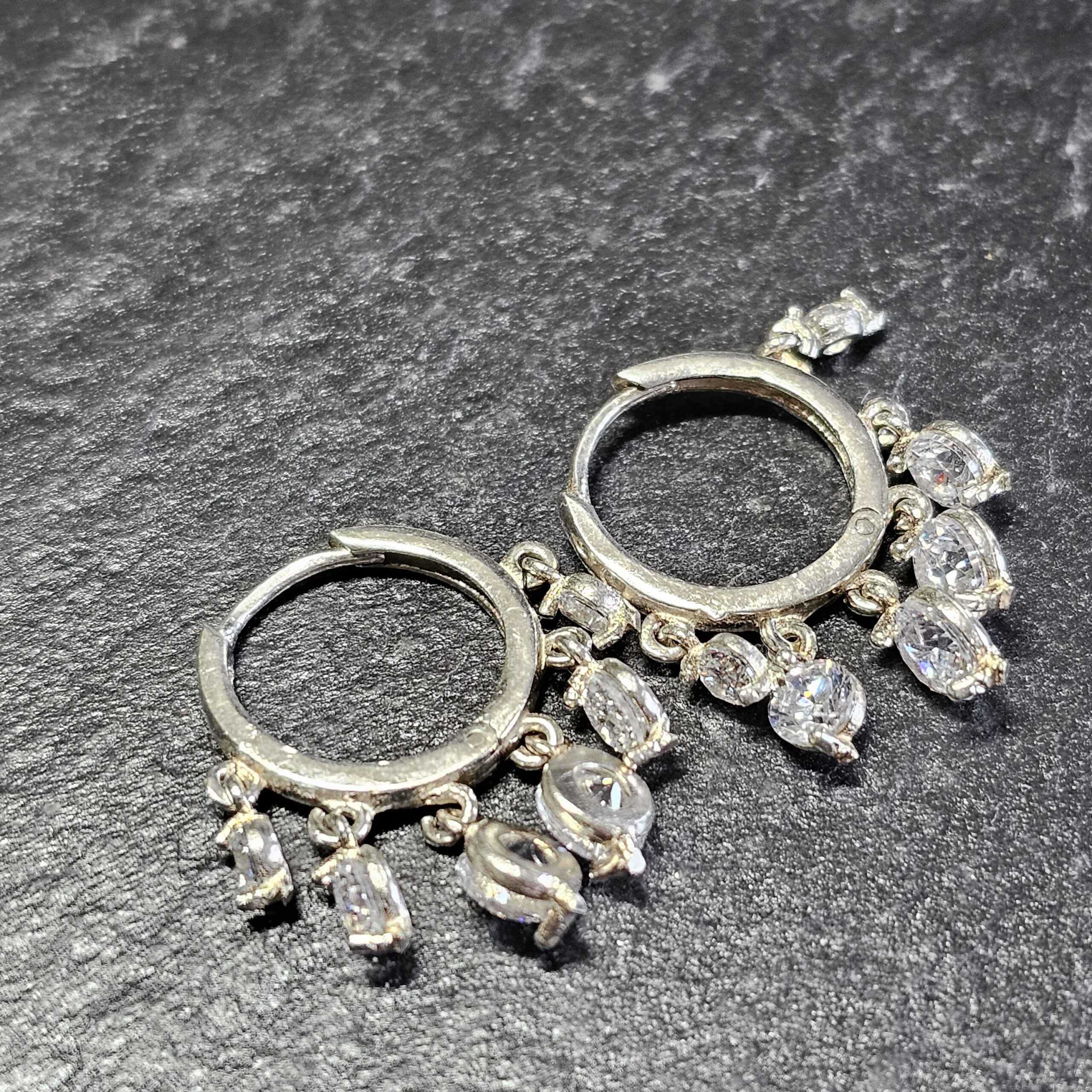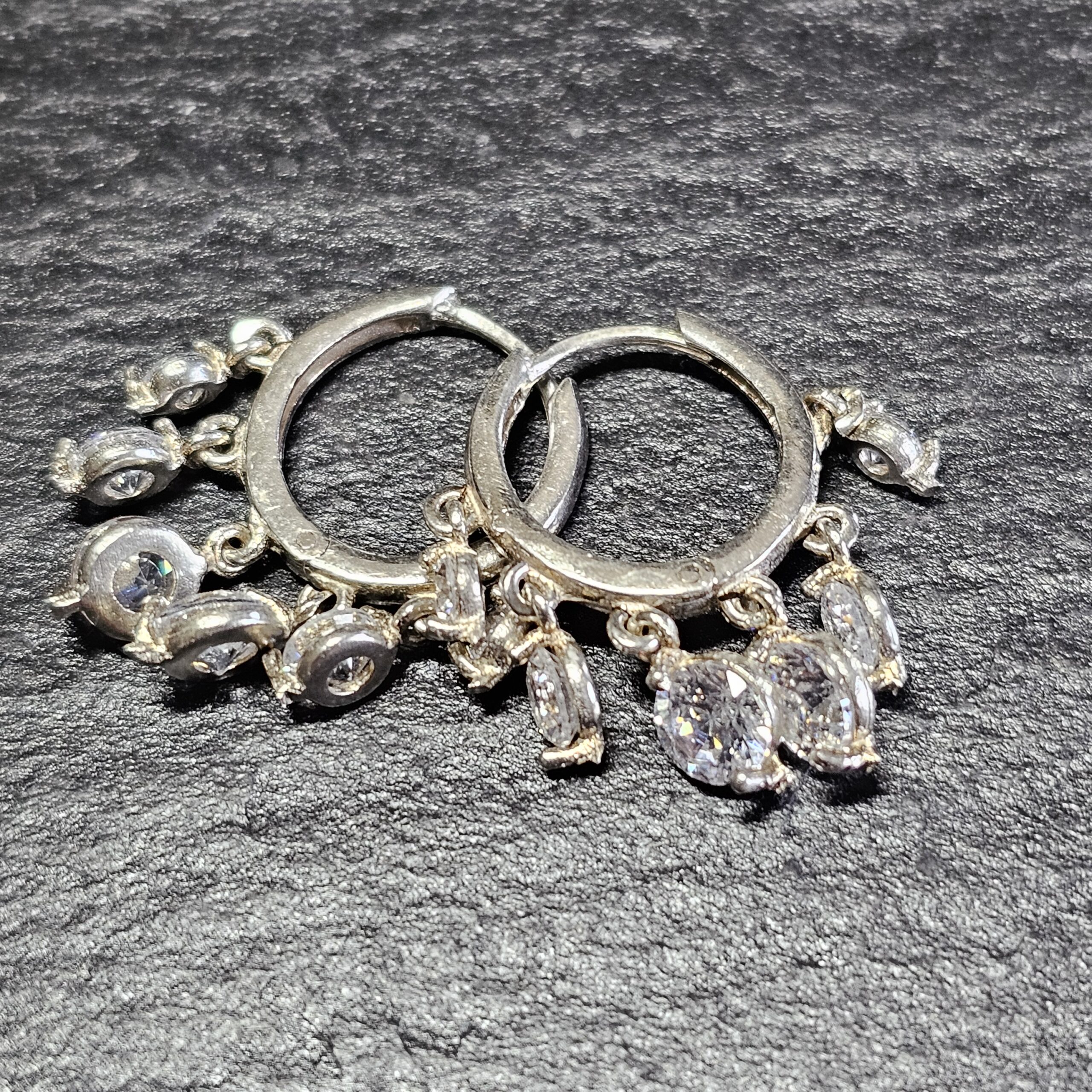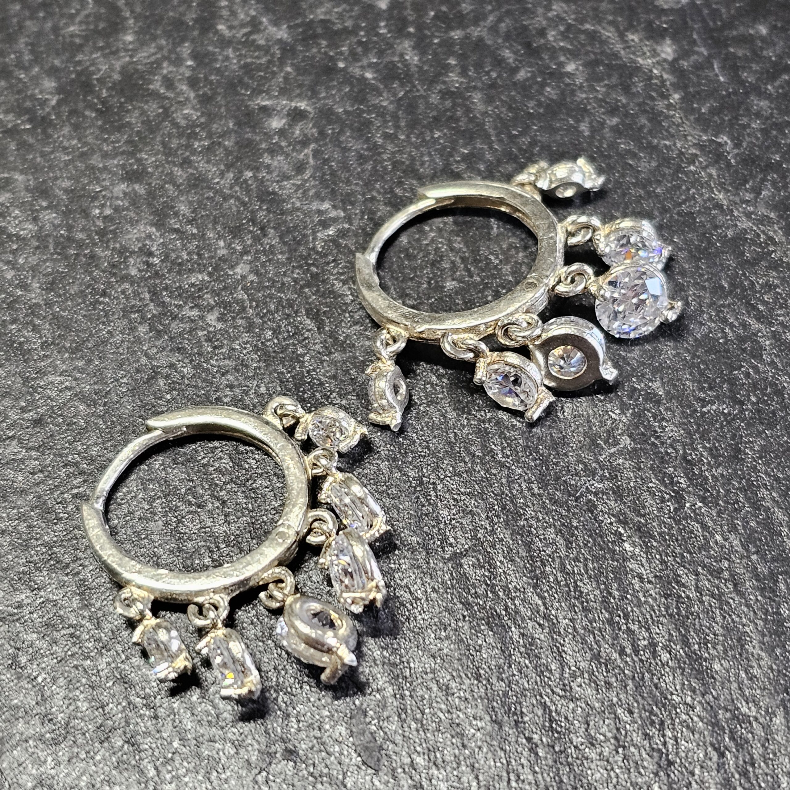 Super schöne Creolen Silber 925. An jedem Ohrring sind insgesamt 6 Stck. Anhängerchen angebracht, die mit klaren Kristallsteinchen geschmückt sind.