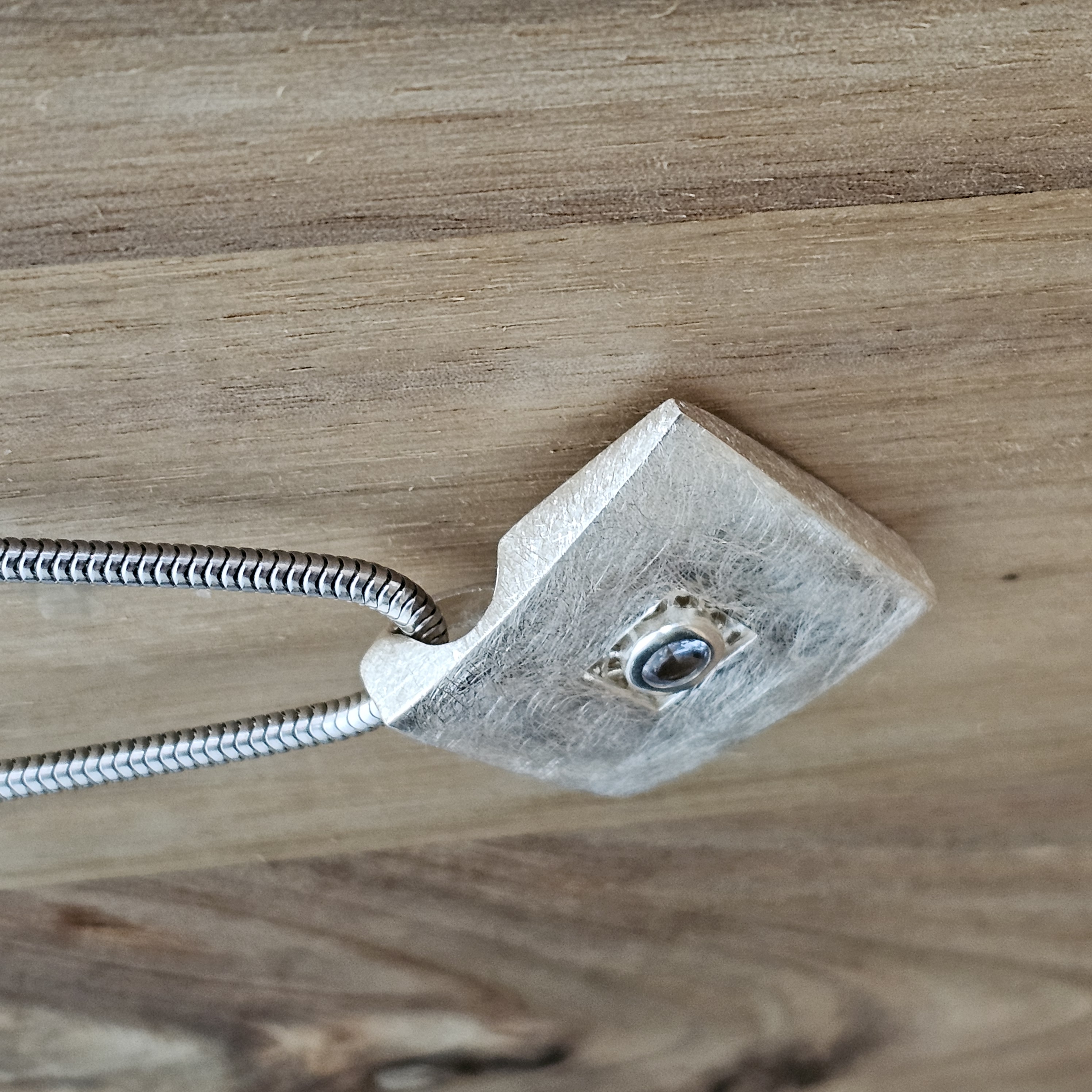 Kunstvoll Gestaltung, der Anhänger ist etwas uneben gestaltet und die Oberfläche wurde gebürstet bearbeitet. Die Öse ist hinten am Anhänger angebracht, sodass er beim Tragen wunderbar anliegt.