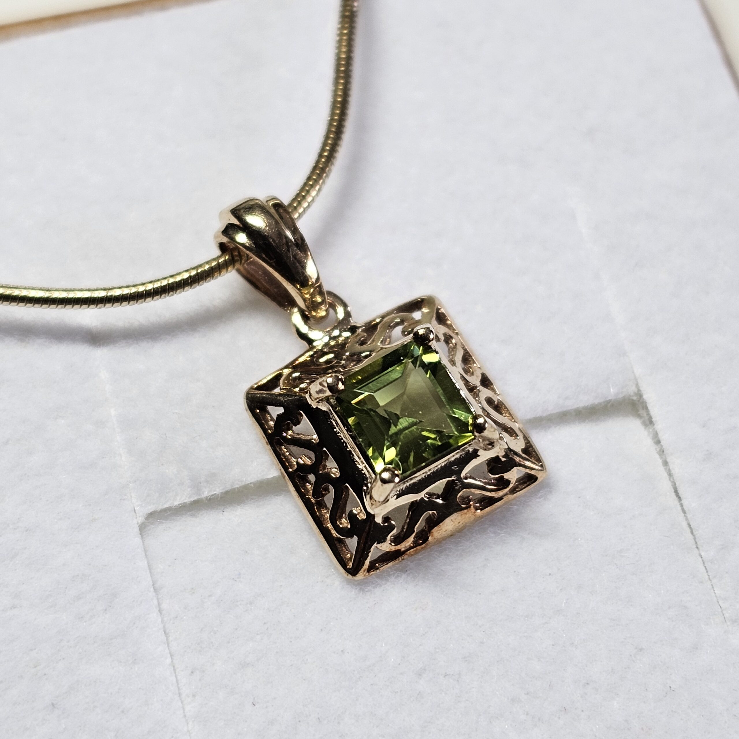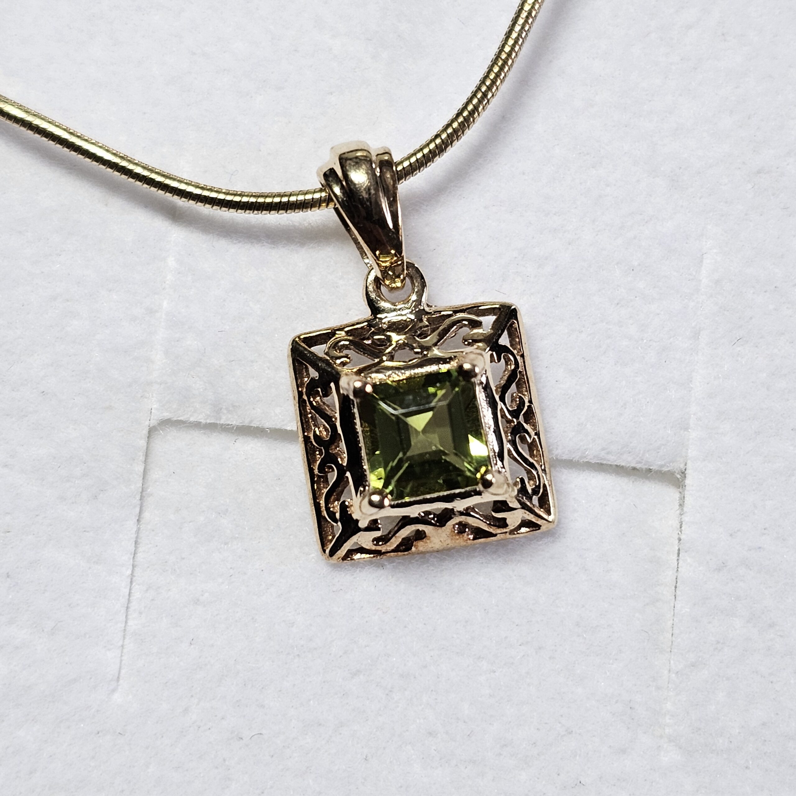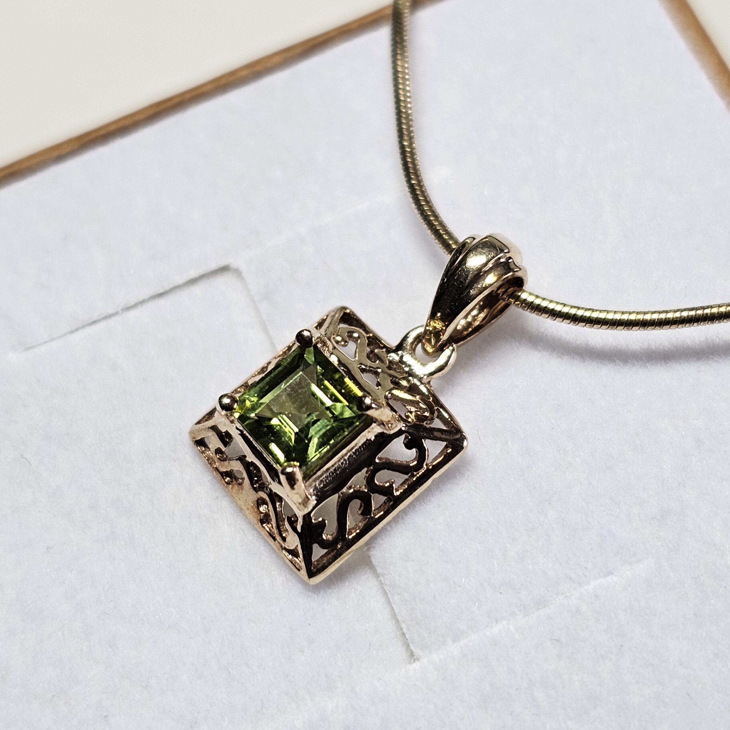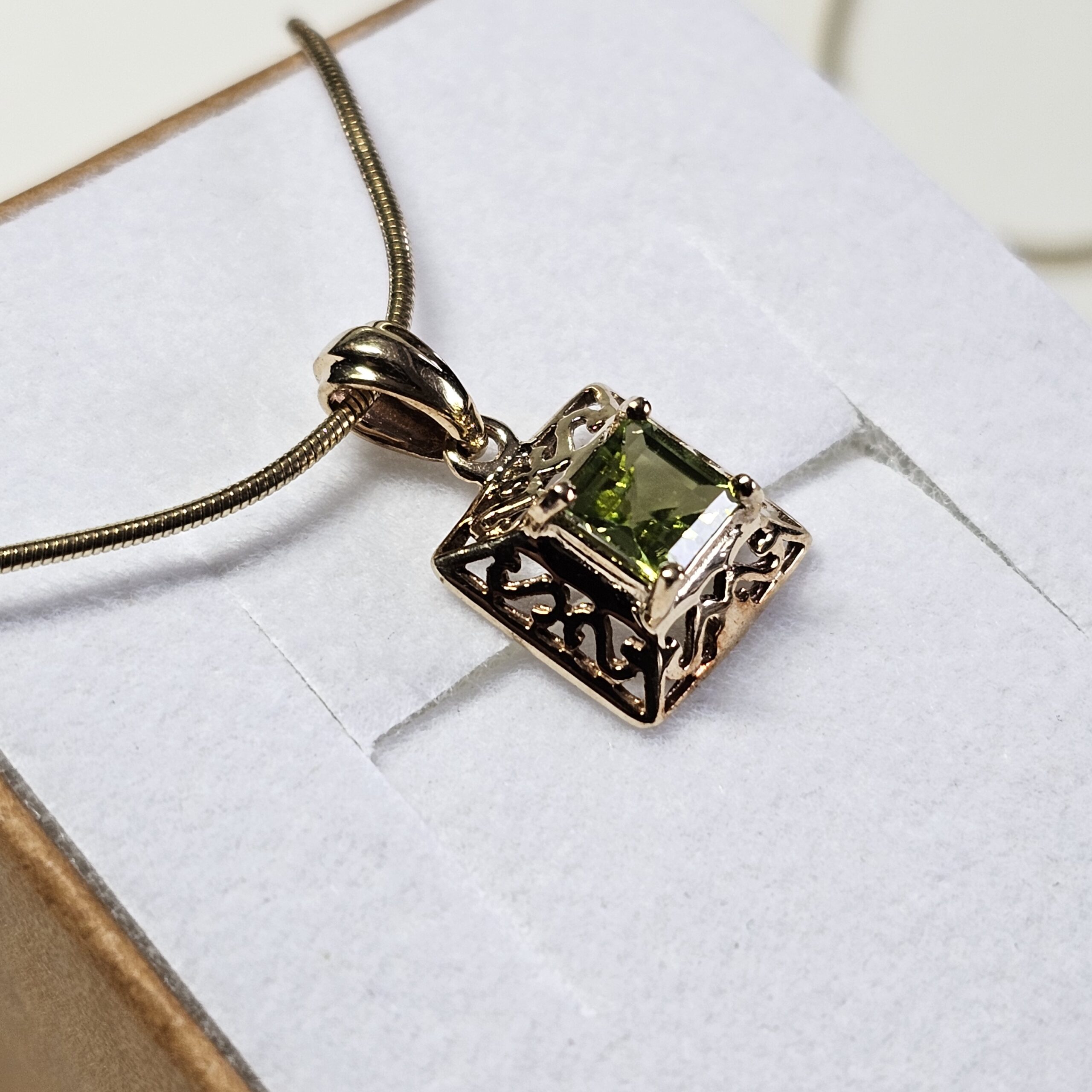 Kleiner schicker Anhänger. Kunstvolles Design. Hergestellt ist das schöne Stück aus Gold 375 und verziert mit einem Peridot Steinchen.