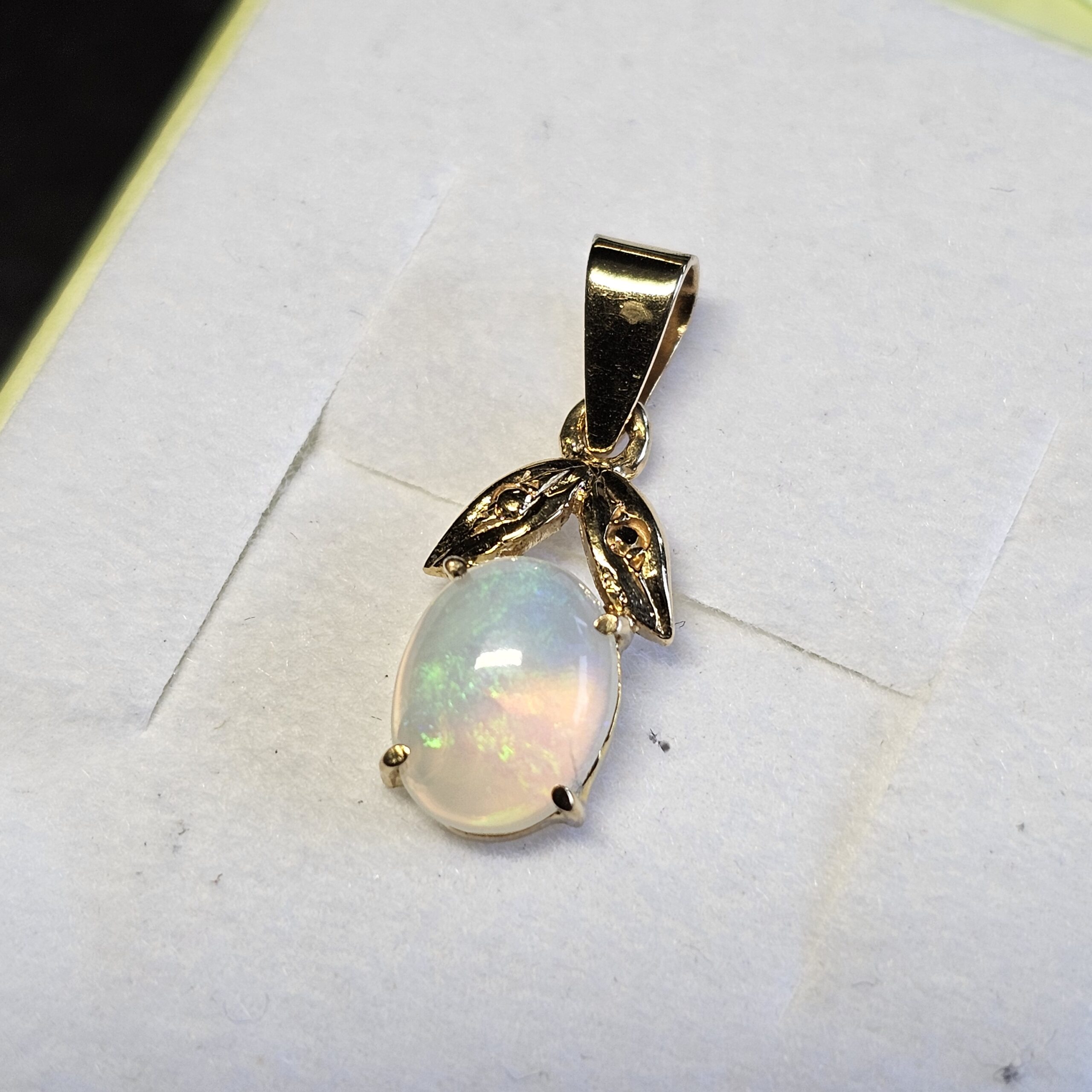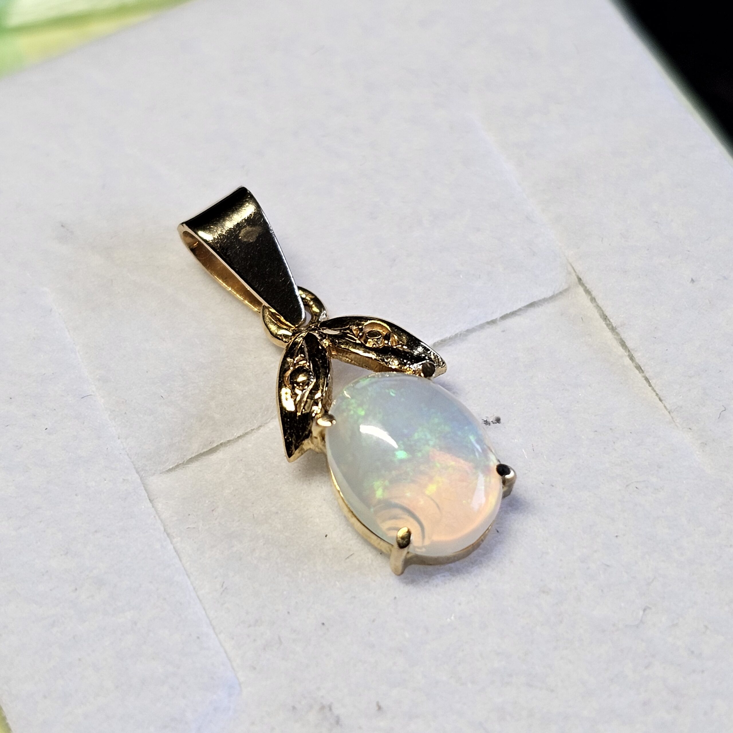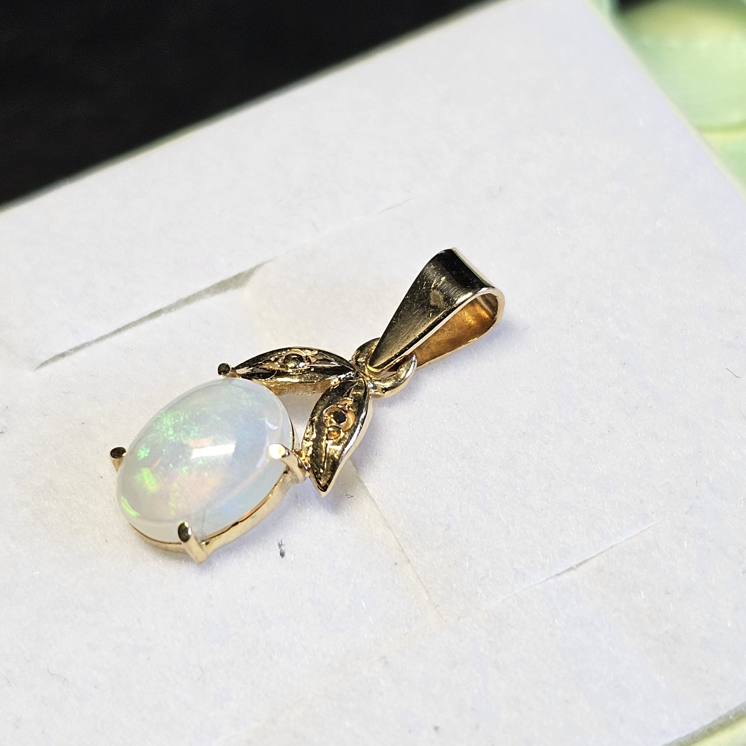 Nostalgischer Vintage-Anhänger Gold 585 mit einem tollen Opal. Super Farbeffekt. Das hübsche Blätterdesign rundet die Schönheit dieses Anhängers ab.
