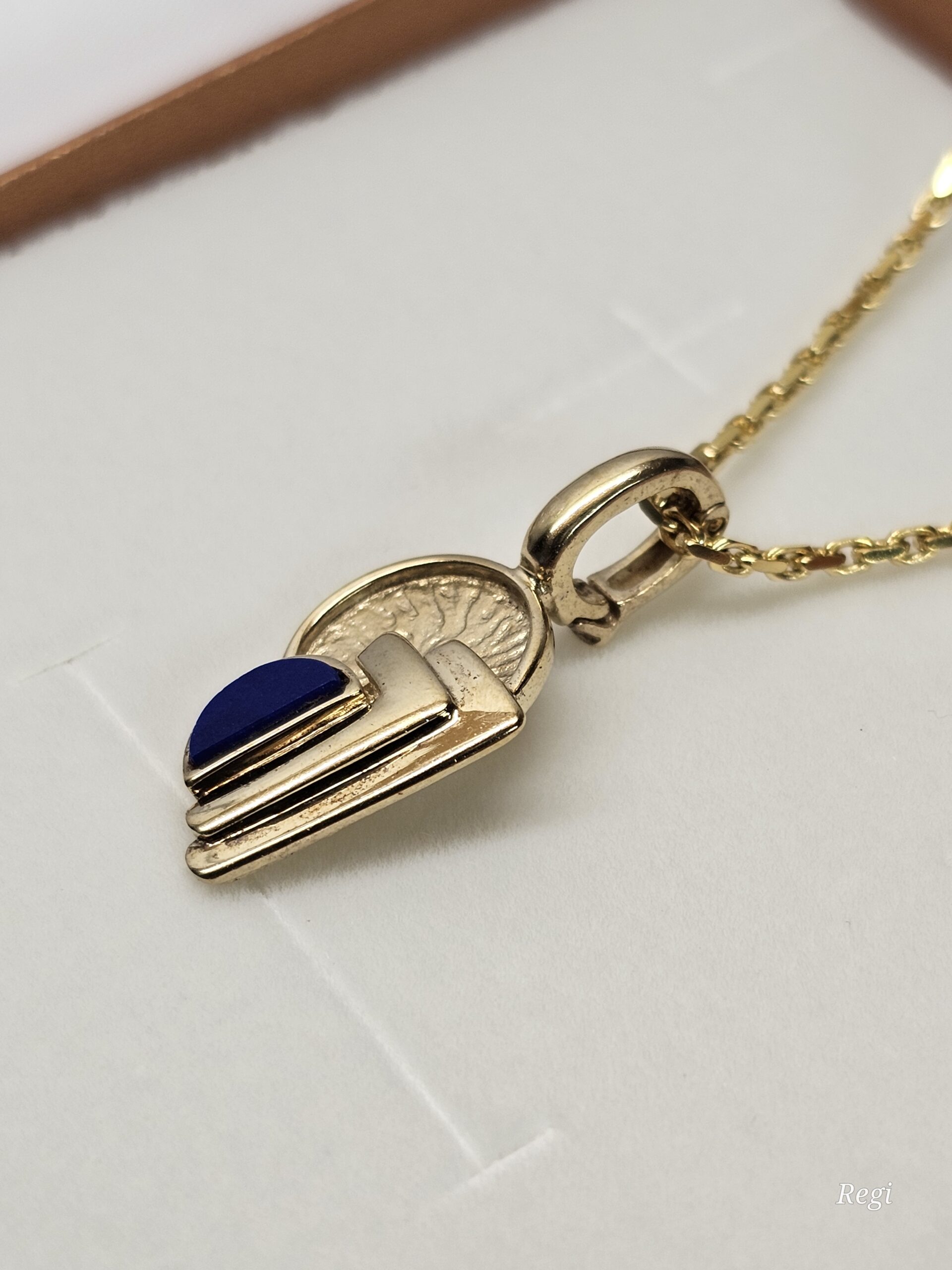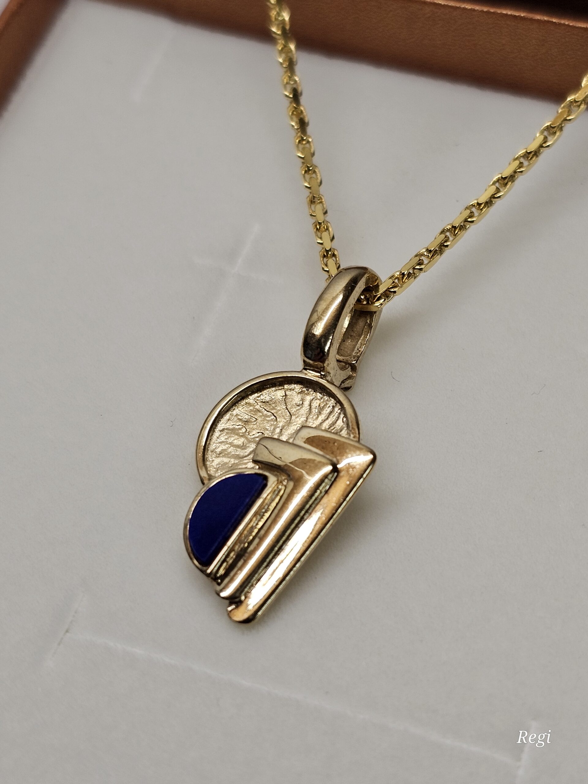Toller schicker Anhänger. Kunstvolles Design. Hergestellt ist das schöne Stück aus Gold 375 und verziert mit einem einer Lapislazuli Einlage. Die Öse kann geöffnet und verschlossen werden.
