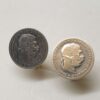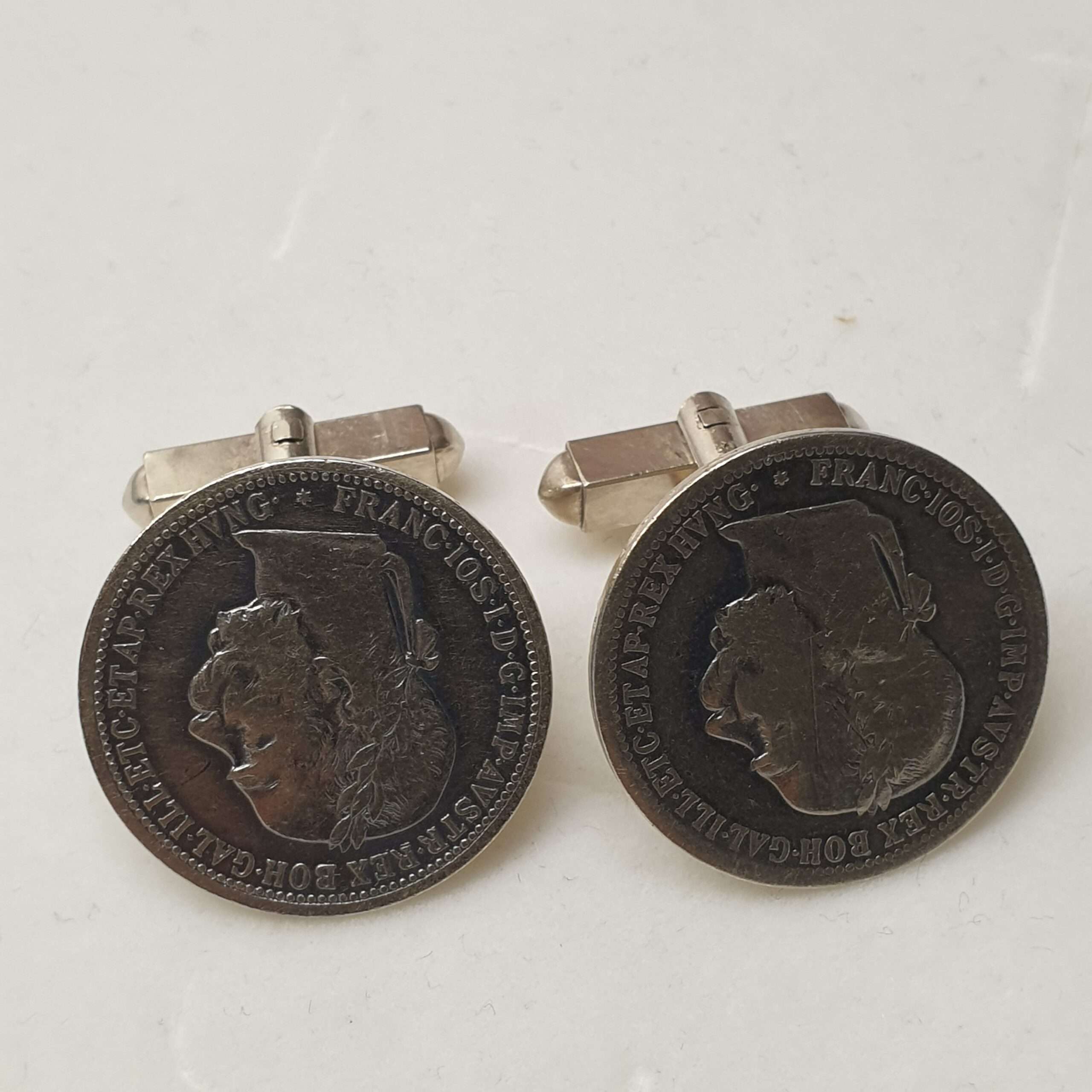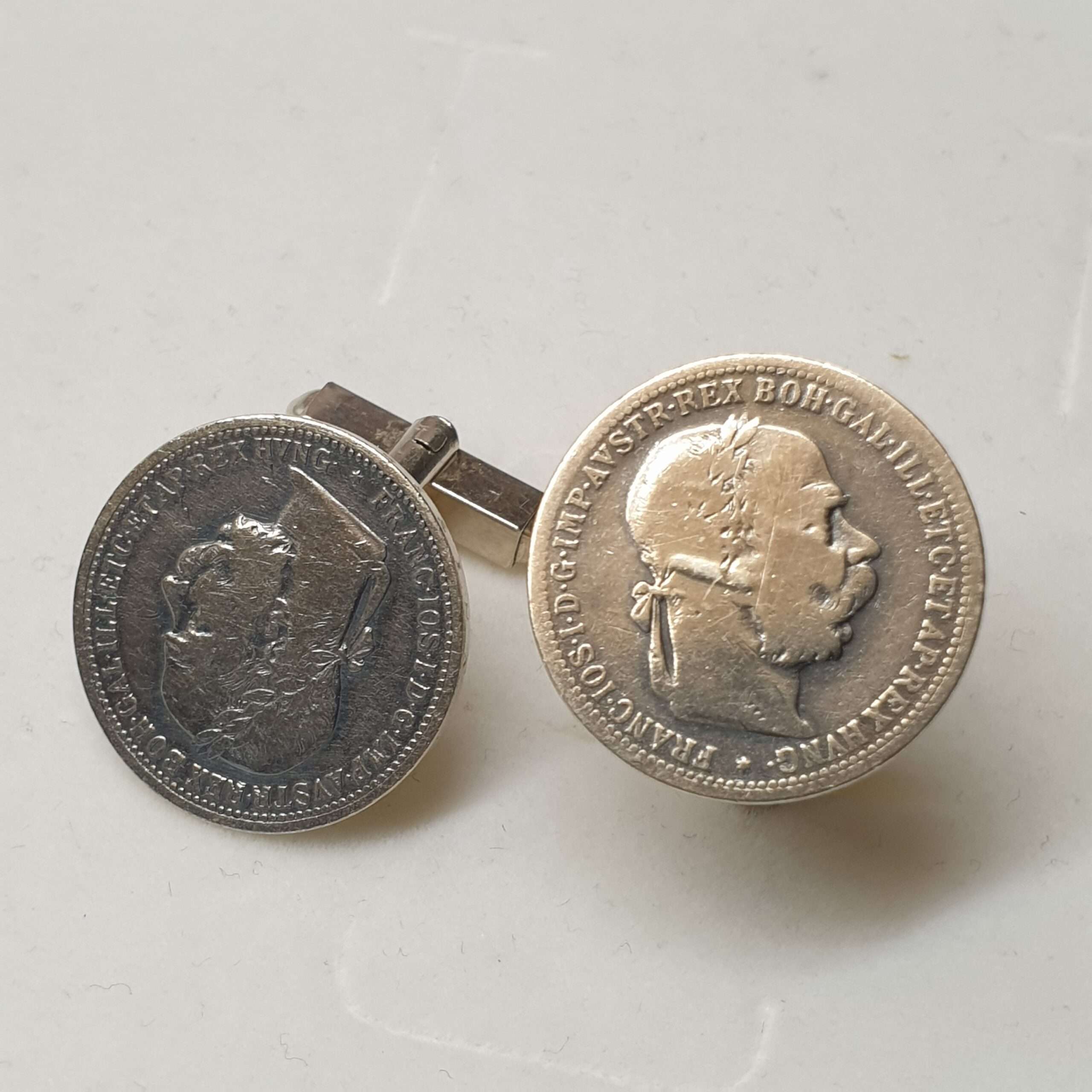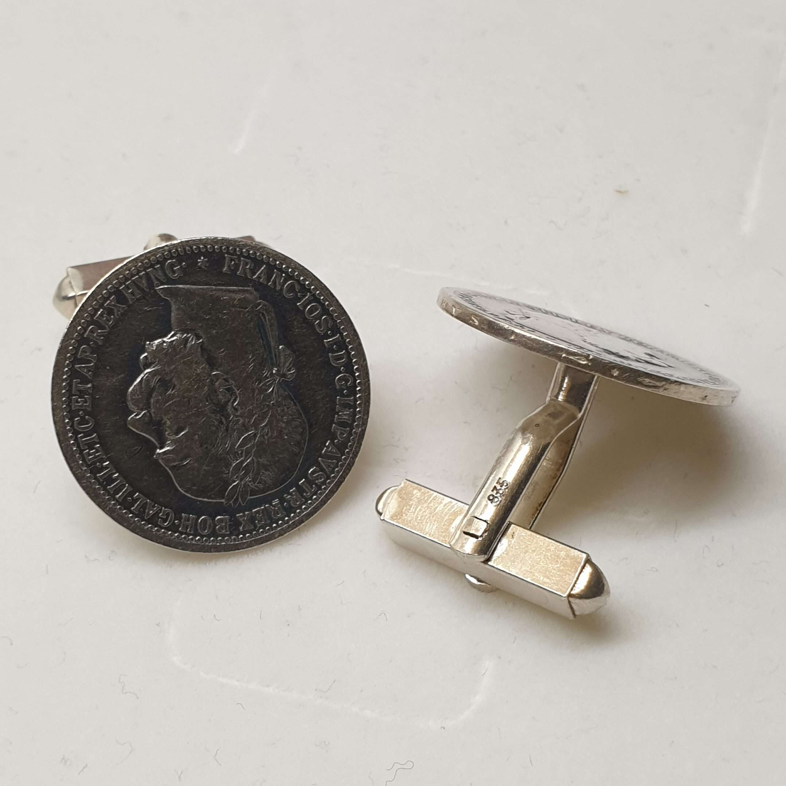 Nostalgische Trachtenschmuck Manschettenknöpfe aus Silber 835 mit je einer Münze 1 Krone Österreich-Ungarn 1896, auf der Vorderseite mit einer Abbildung von Kaiser Franz Josef I. auf der Rückseite mit der Aufschrift: FRANC • IOS • I • D • G • IMP • AVSTR • REX BOH • GAL • ILL • ETC • ET AP • REX HVNG.