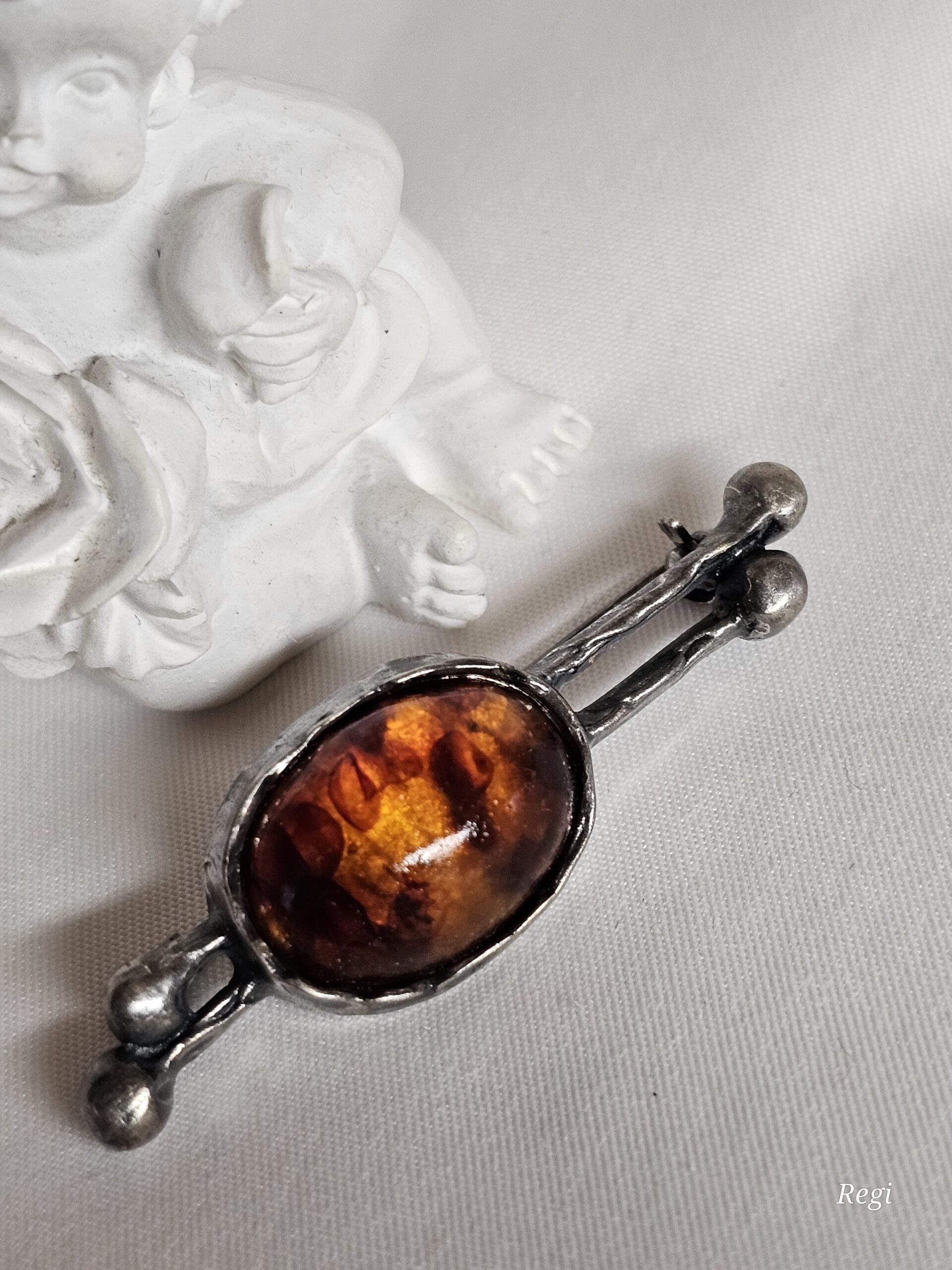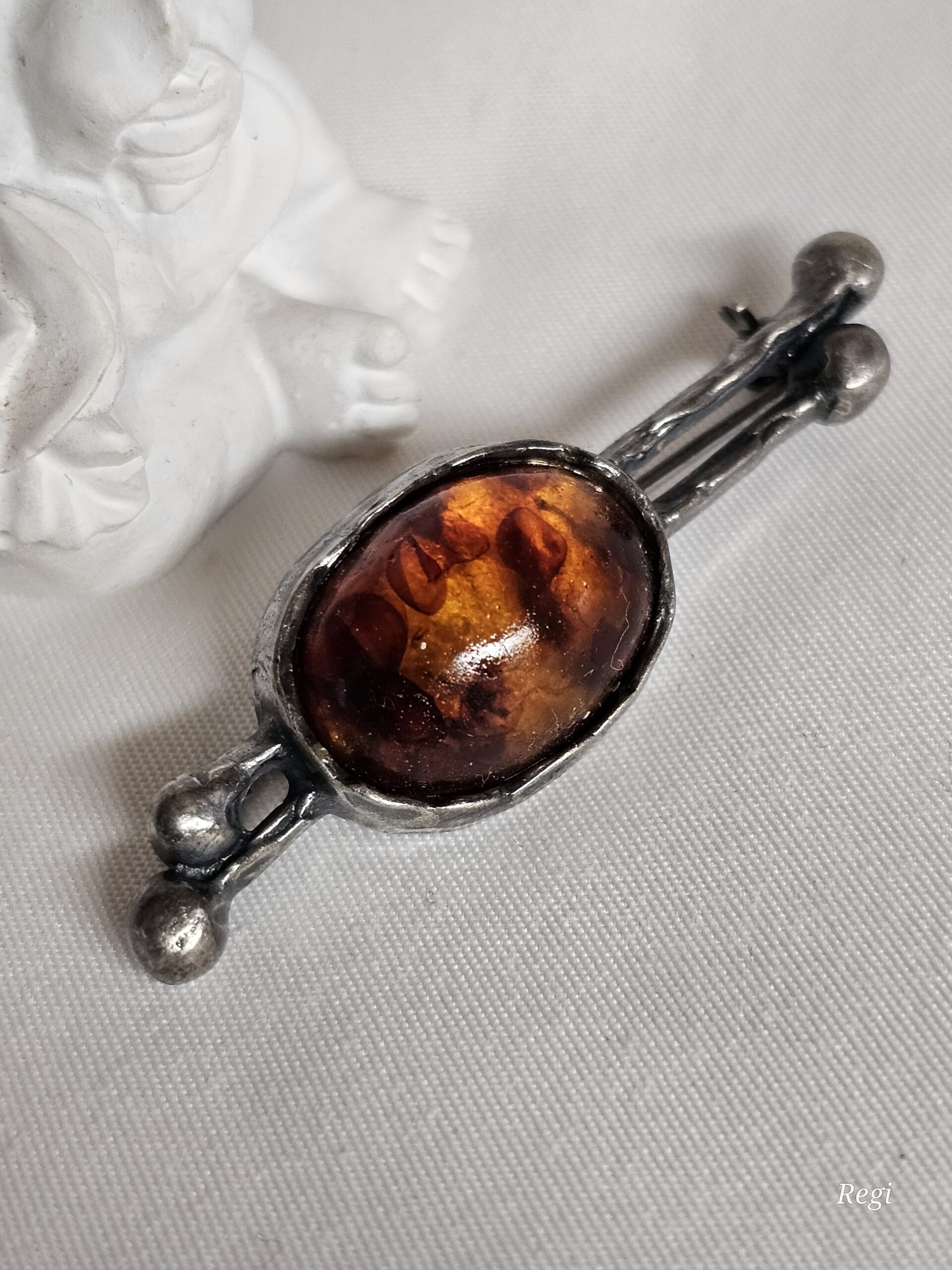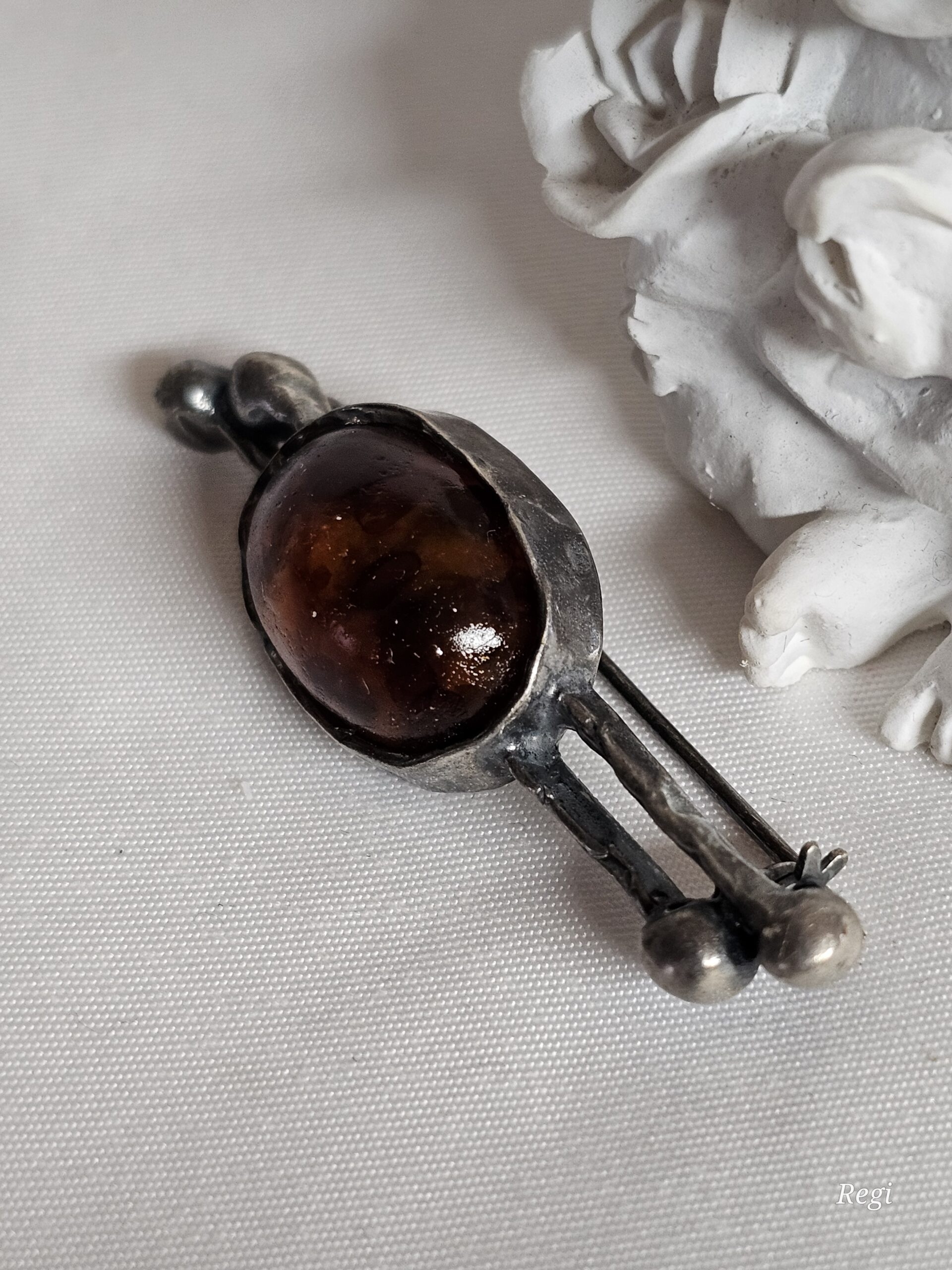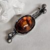 Nostalgische Brosche / Anstecknadel Silber 925 mit Bernstein und einer extravagant designten Fassung.