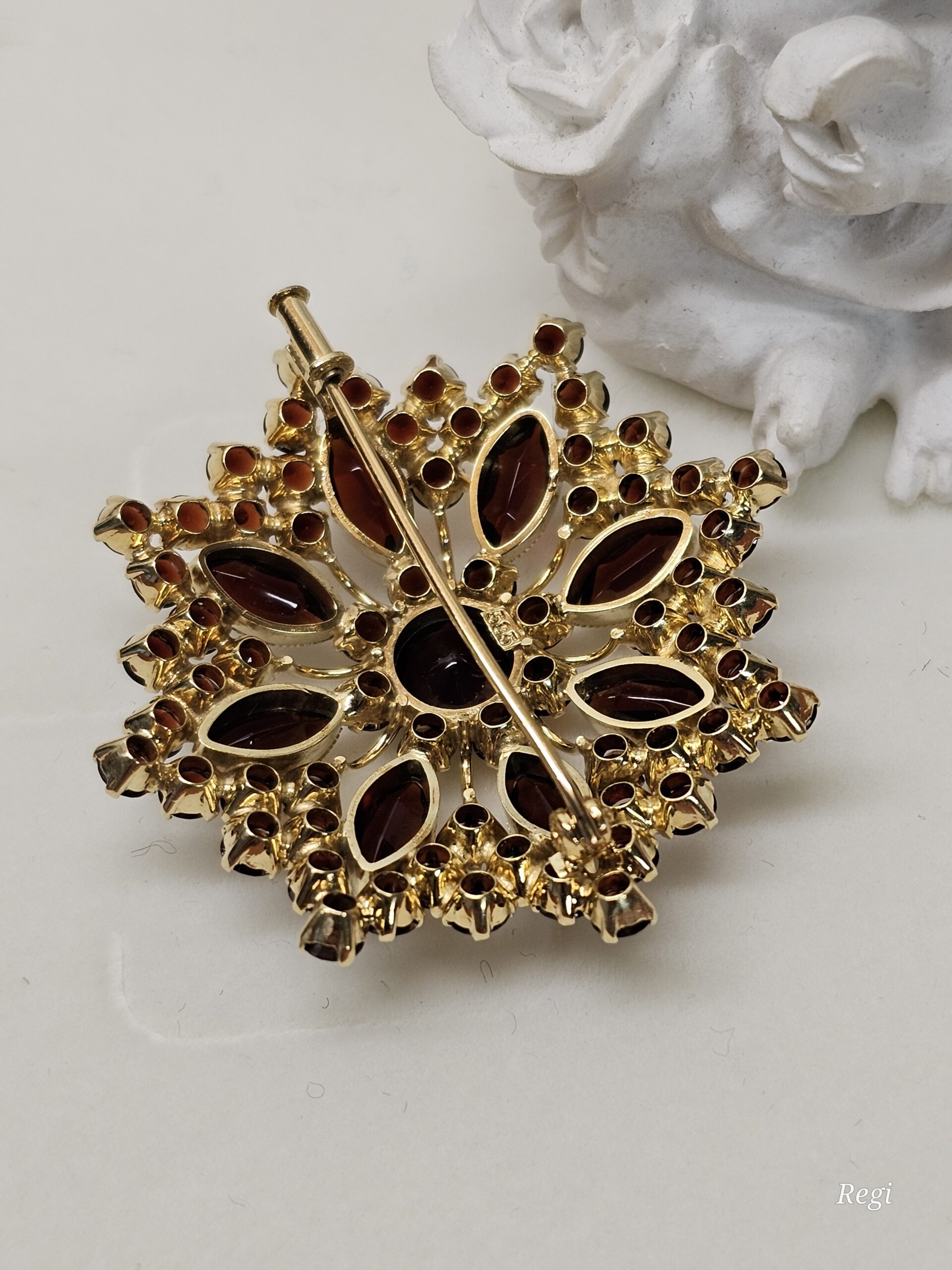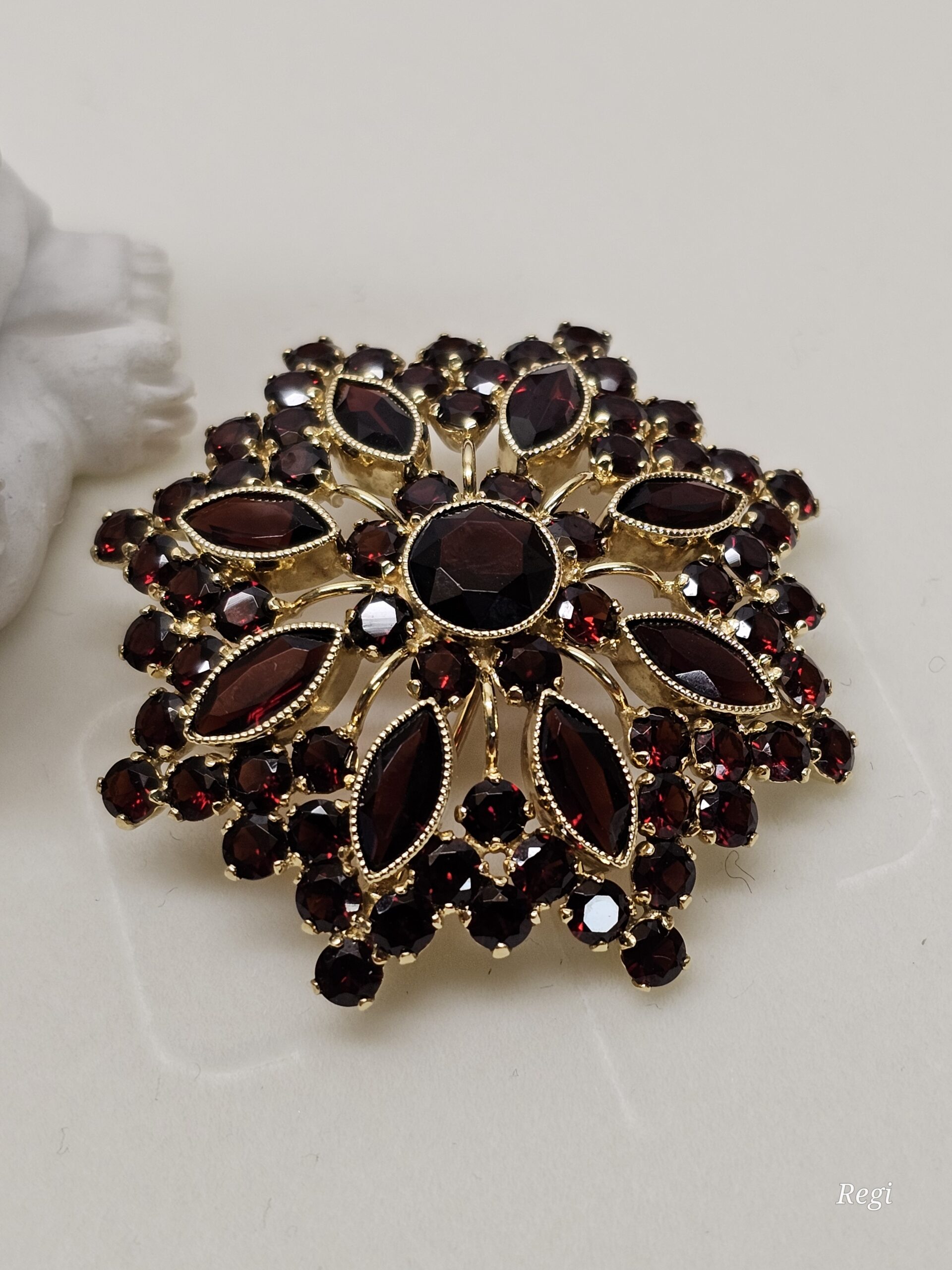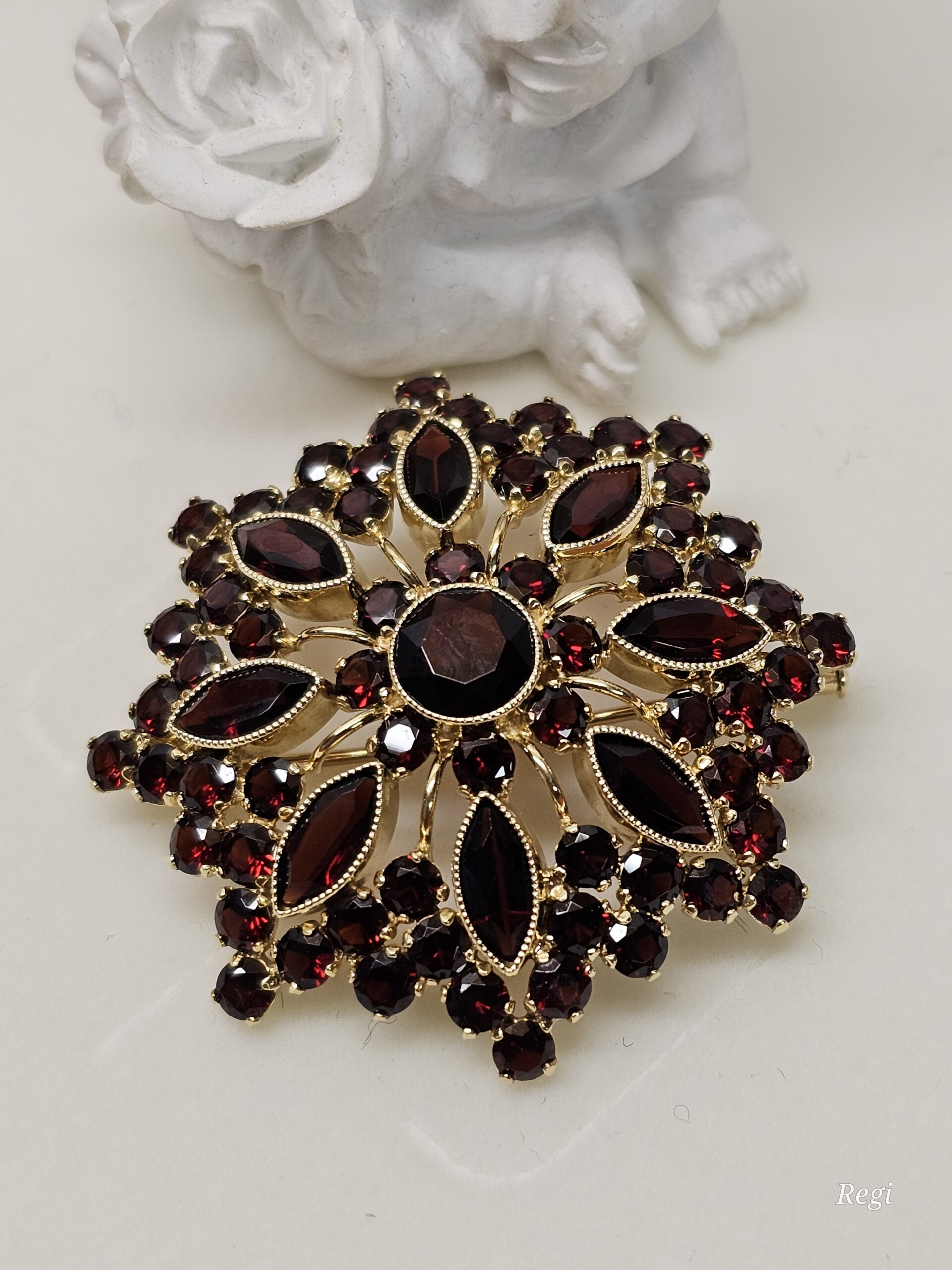 Tolle Brosche mit Granat-Steinen besetzt. Gefertigt ist das schöne Shabby Vintage Schmuckstück aus Gold 585.