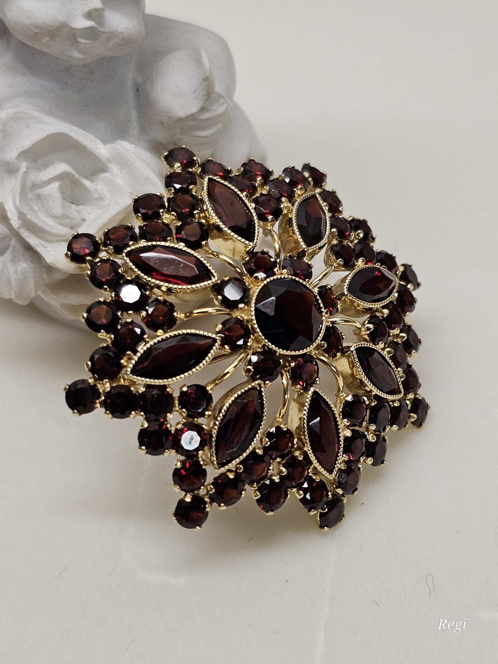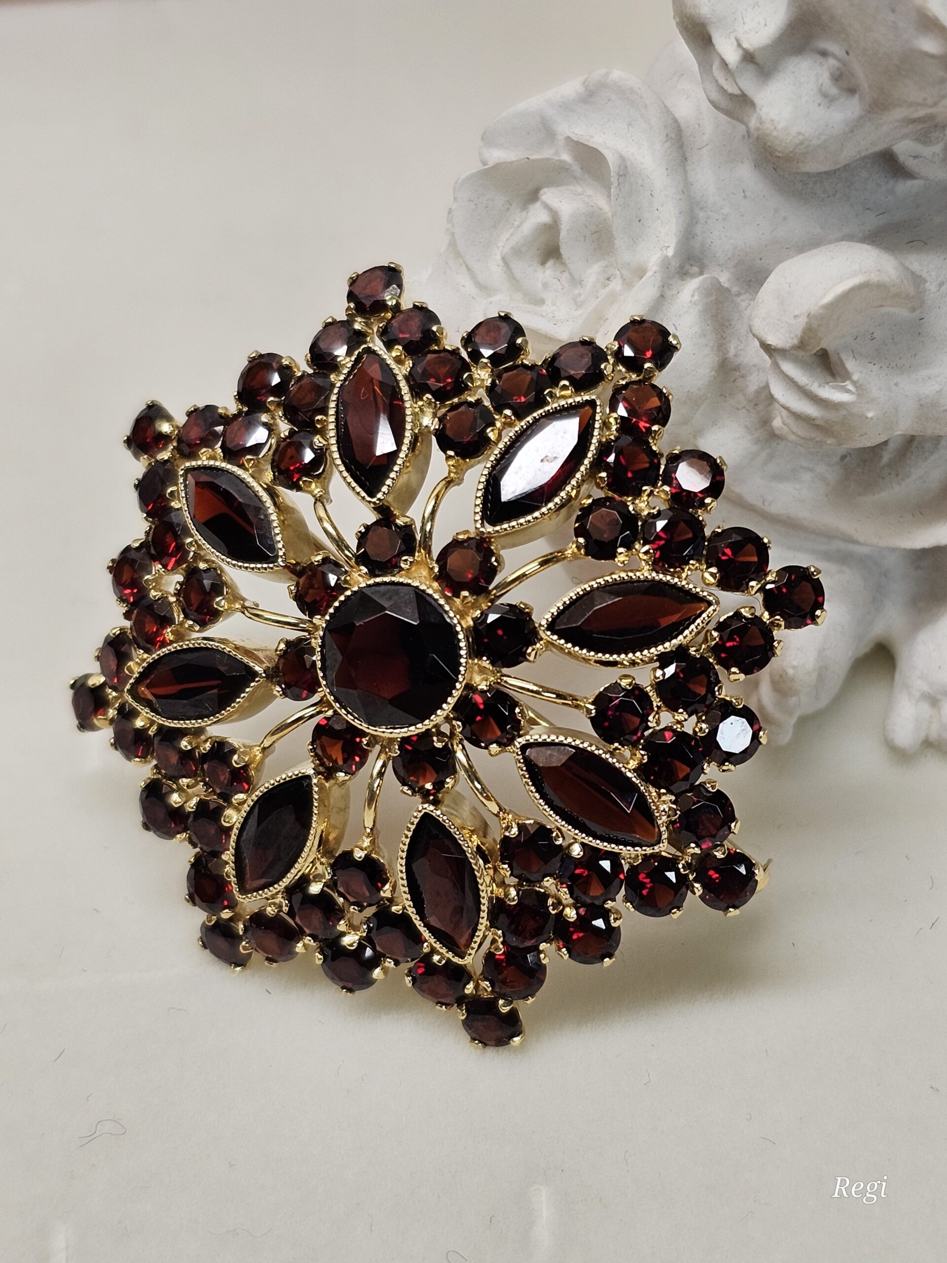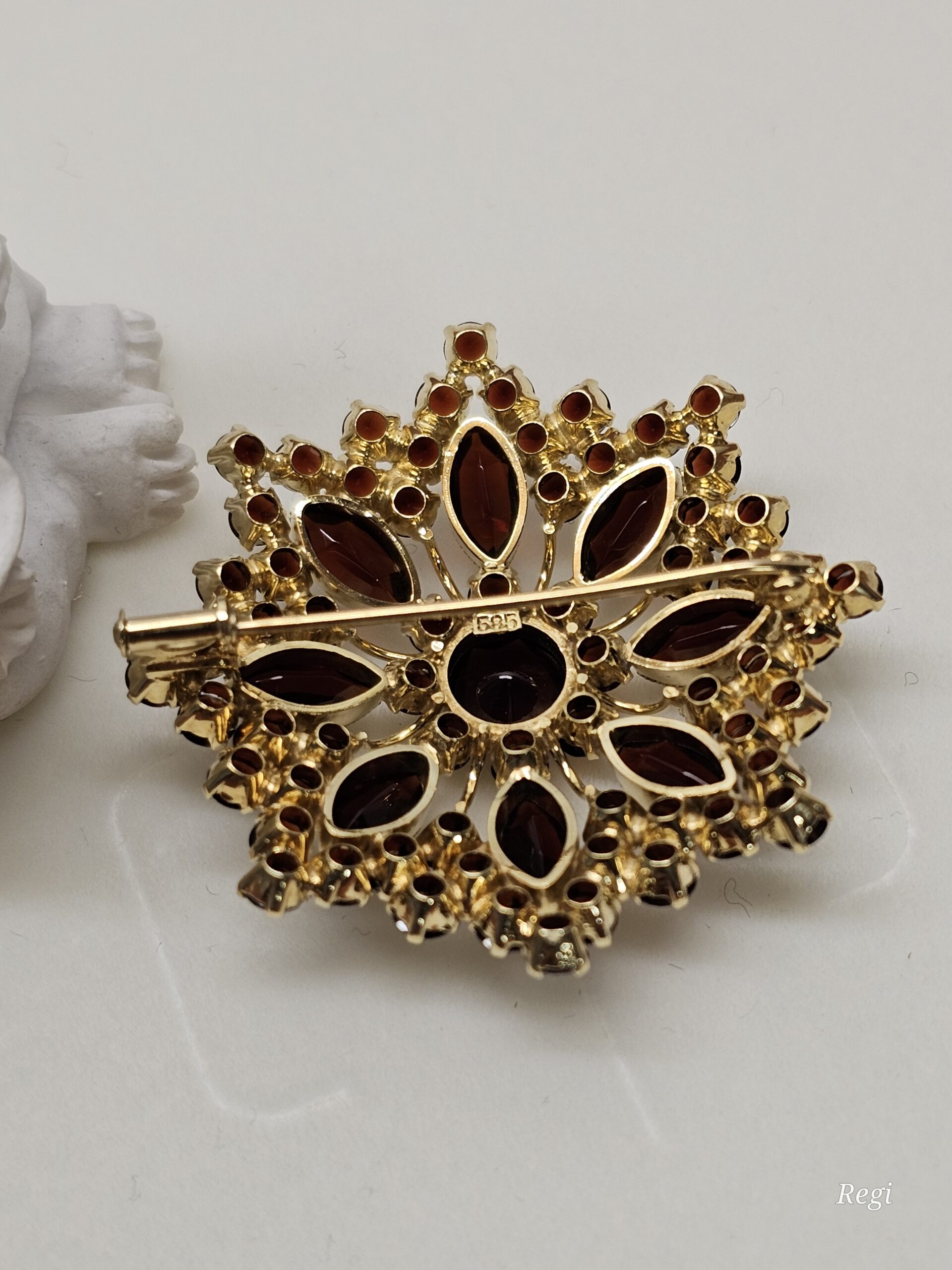Tolle Brosche mit Granat-Steinen besetzt. Gefertigt ist das schöne Shabby Vintage Schmuckstück aus Gold 585.