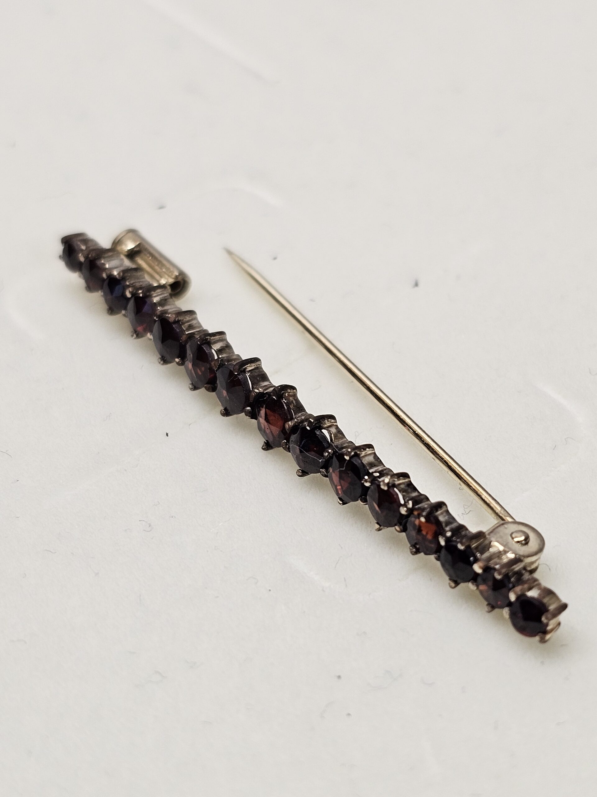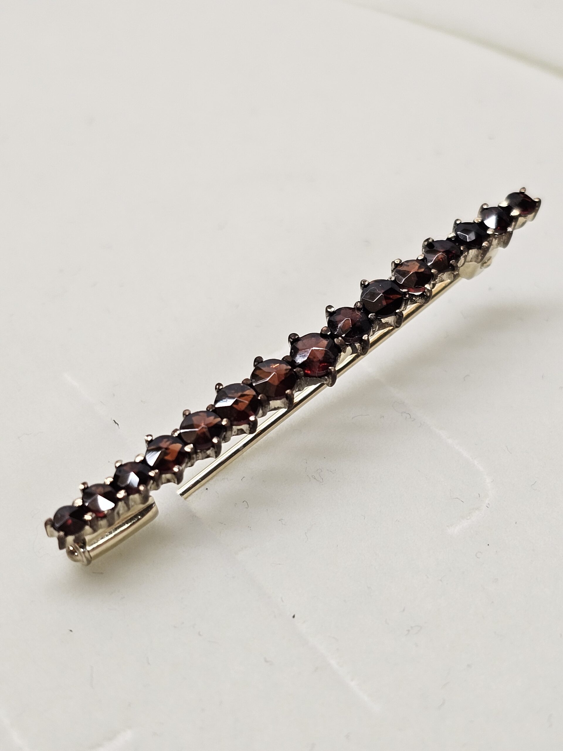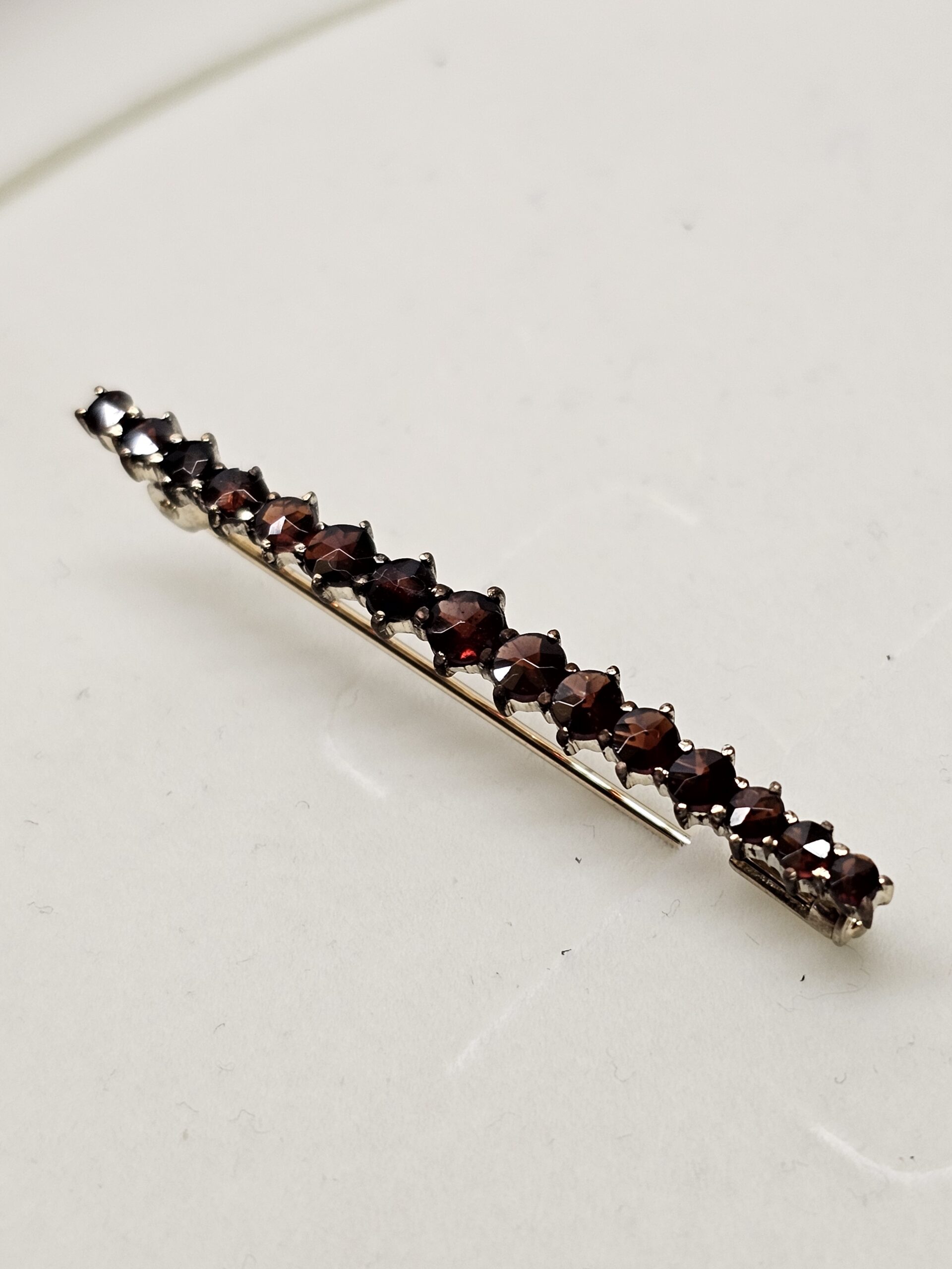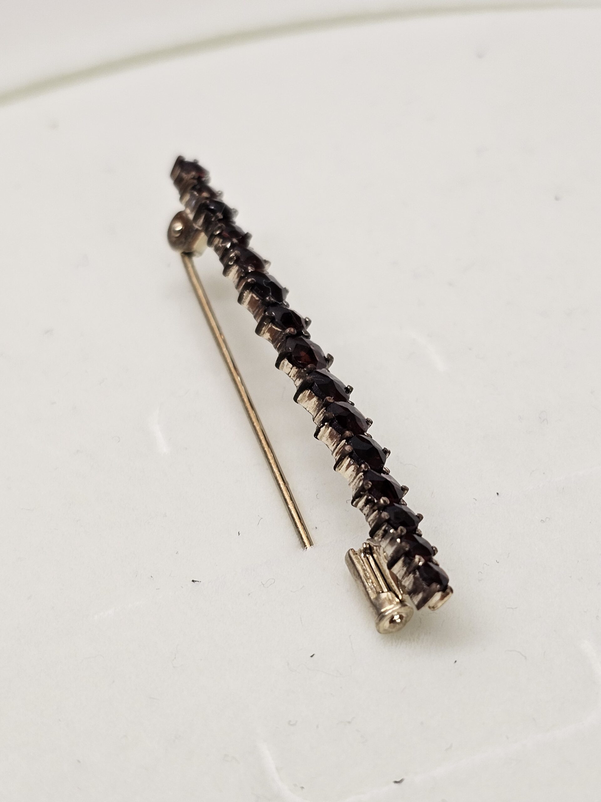 Antike silberne Anstecknadel / Stabbrosche besetzt mit Granatsteinchen.