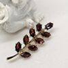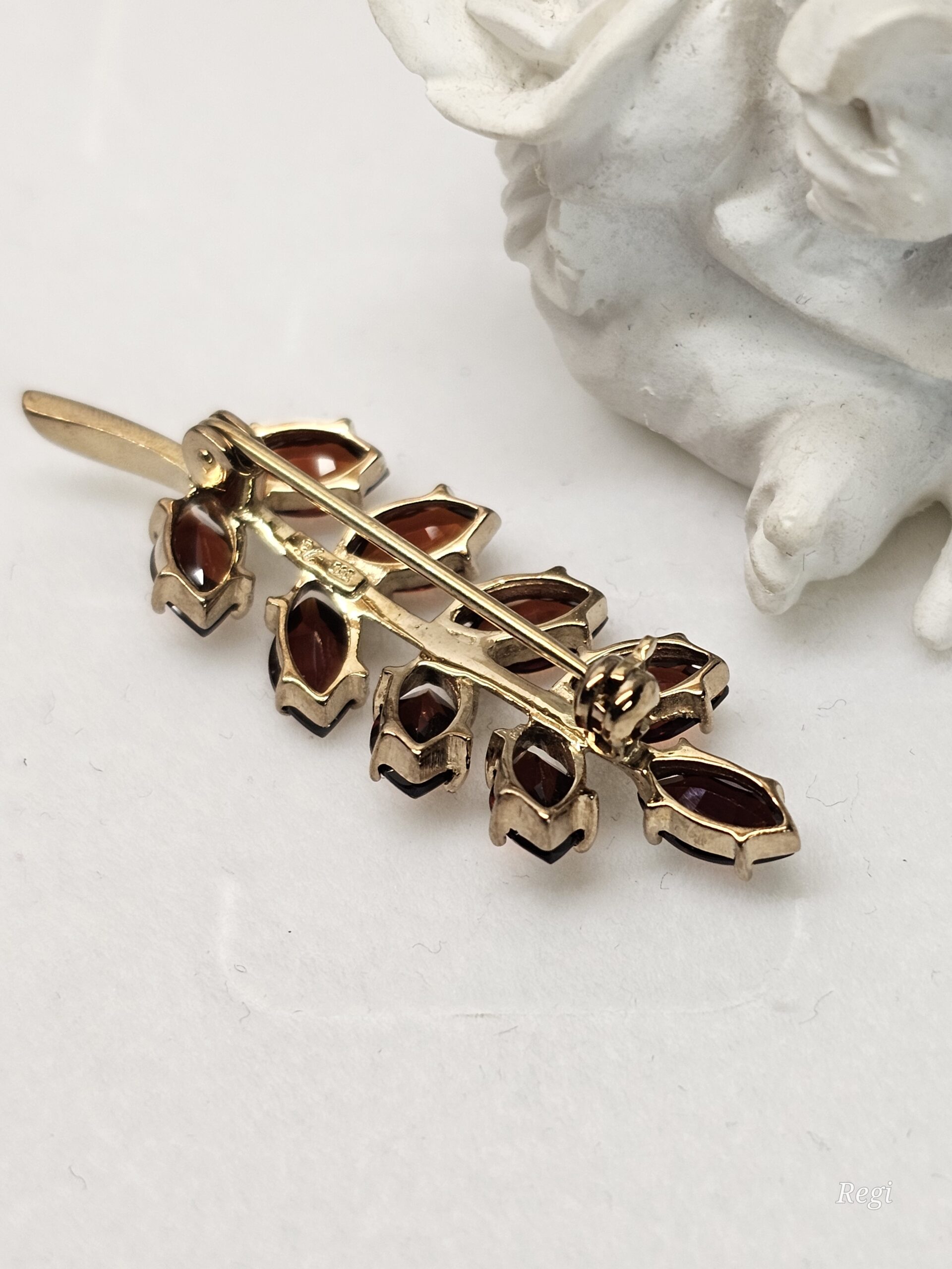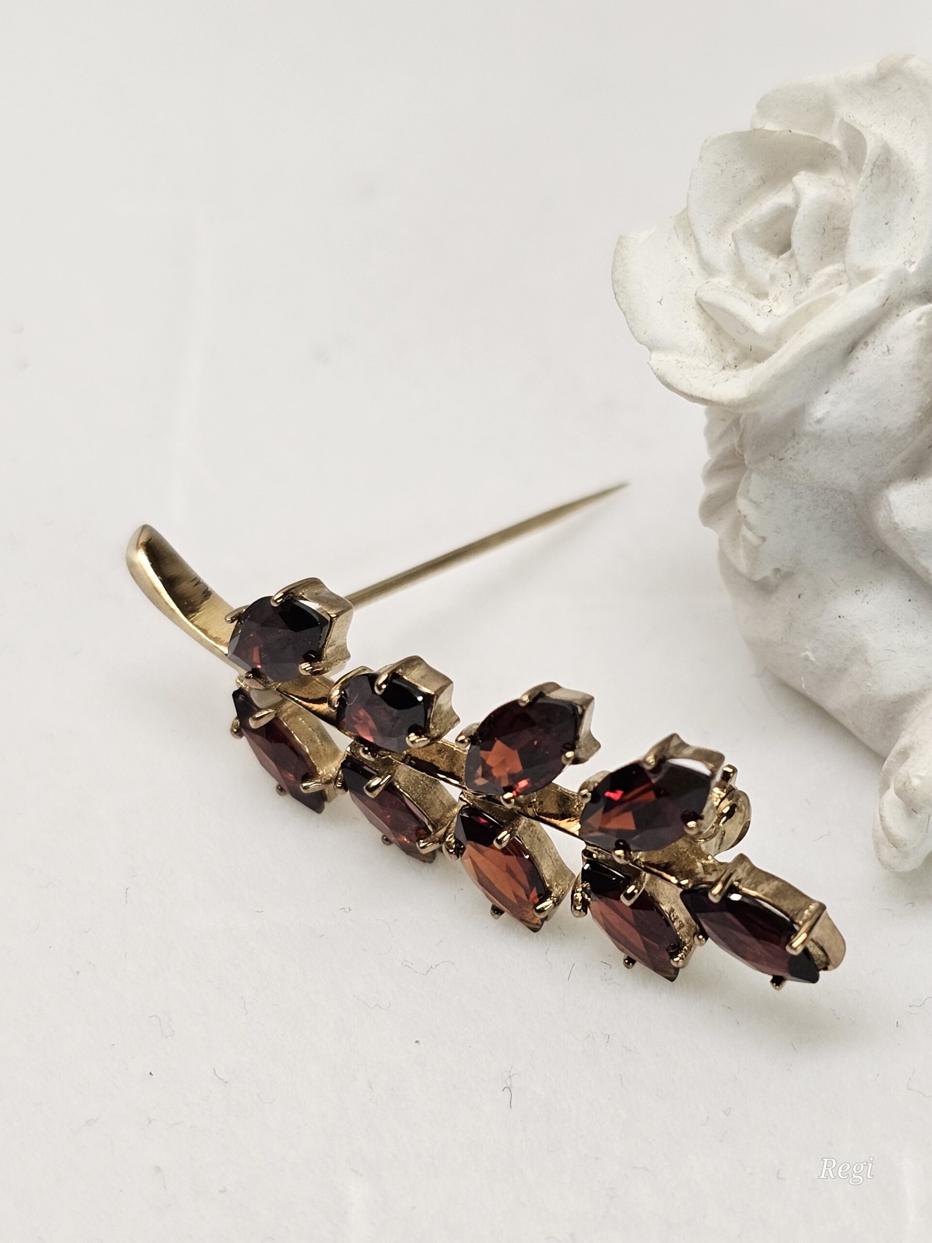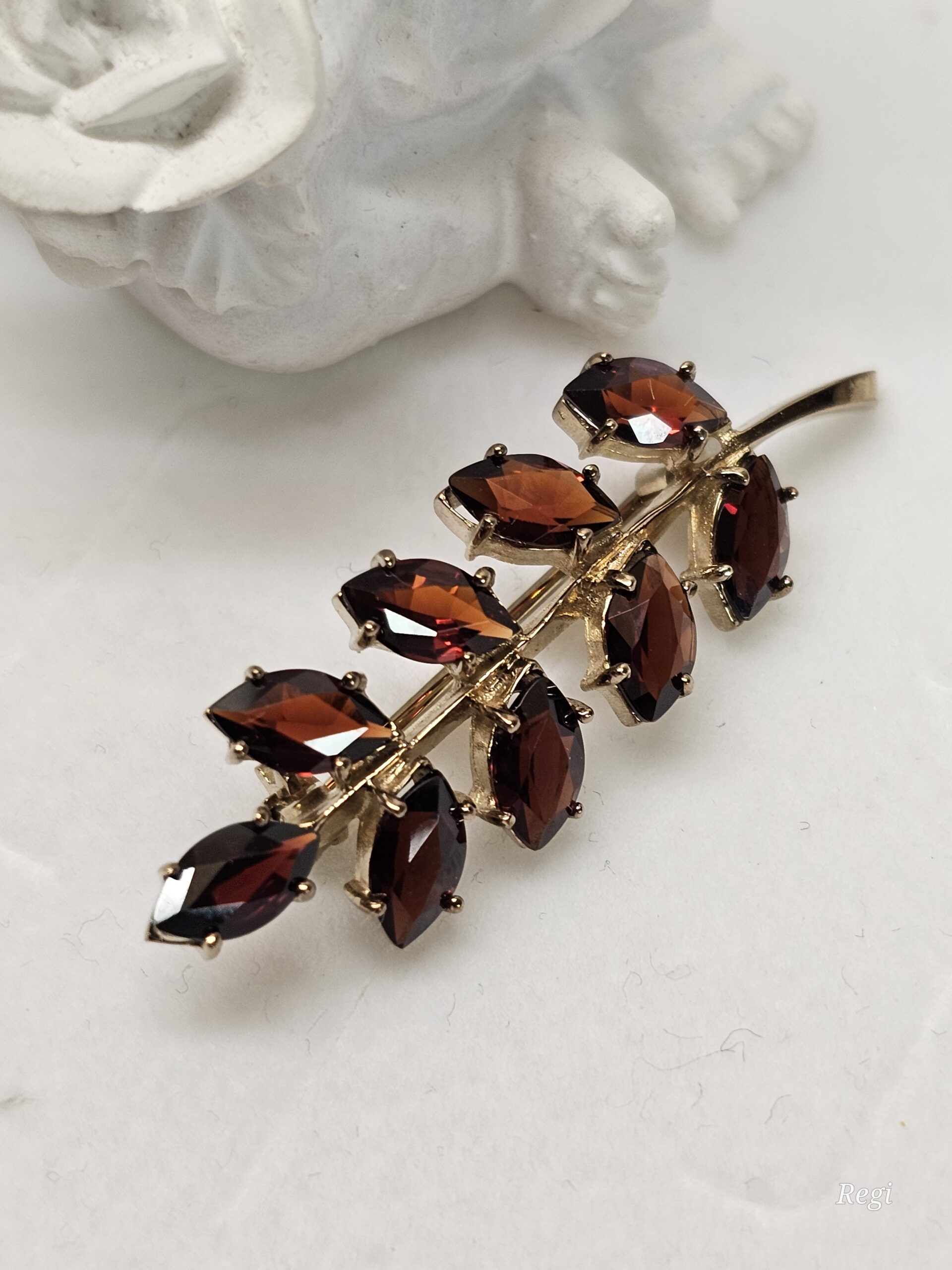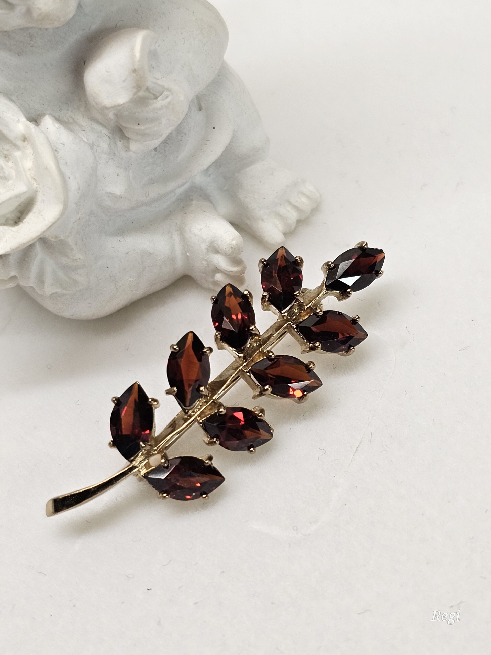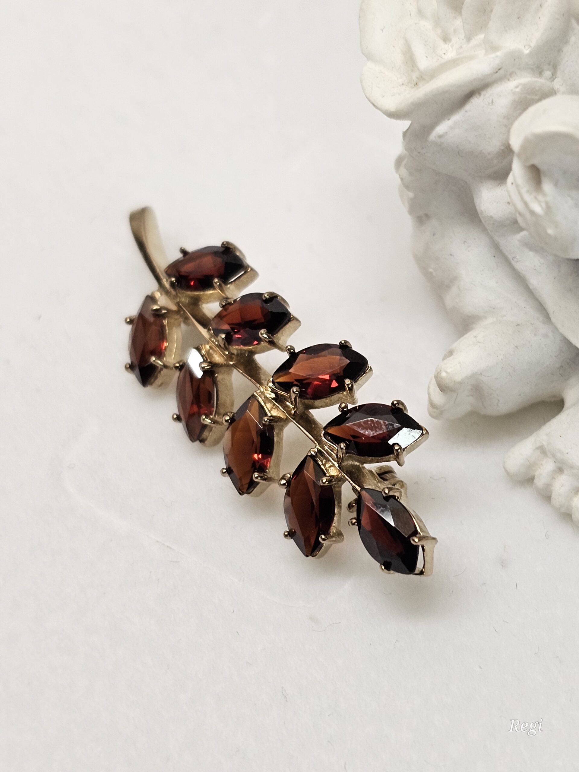 Hübsche Brosche mit Granat-Steinen besetzt. Die Form eines Zweiges mit Blättern ist dargestellt.