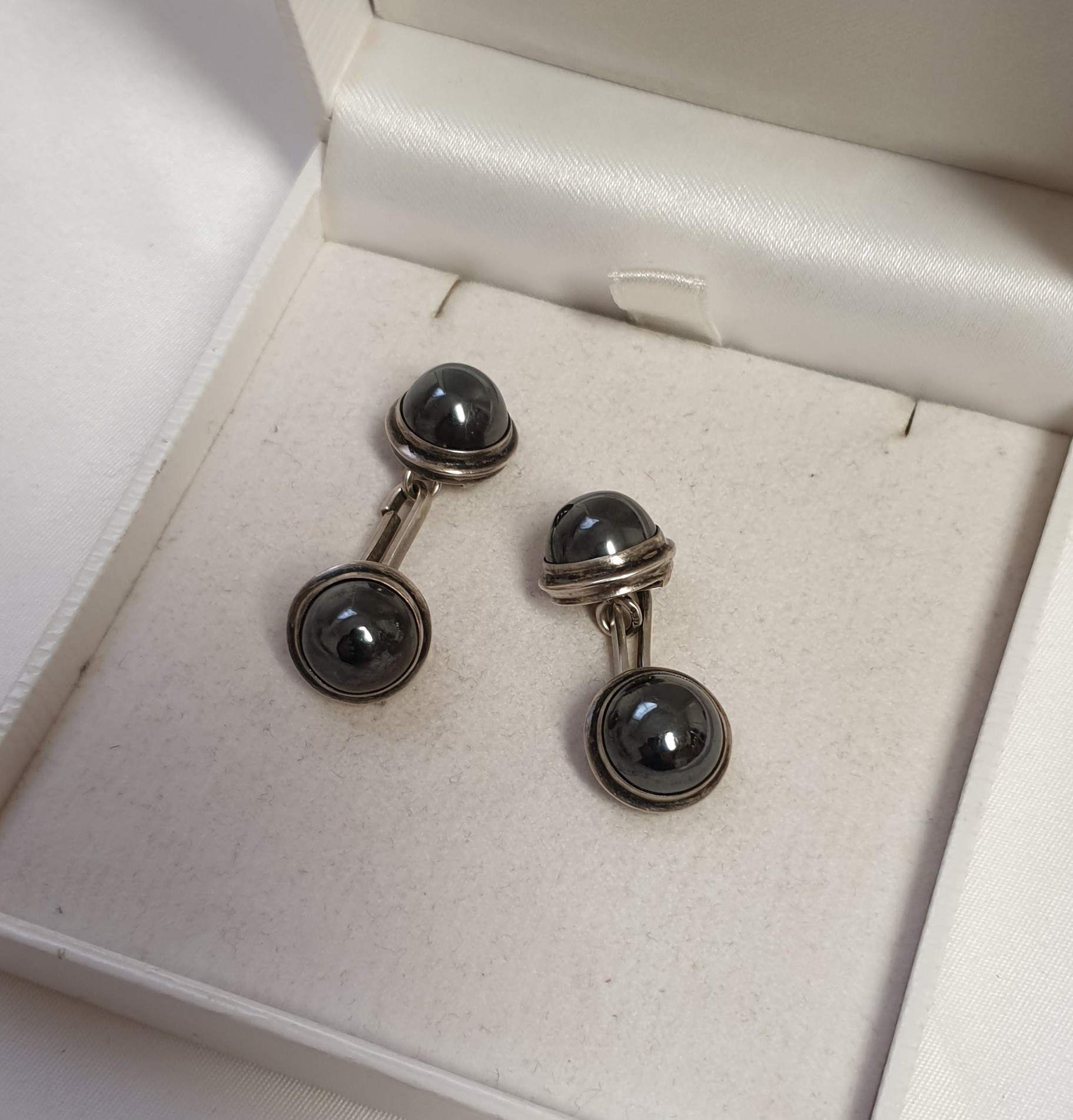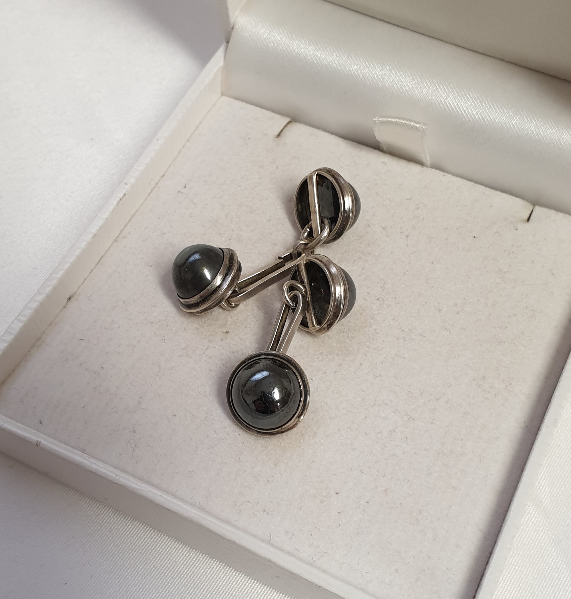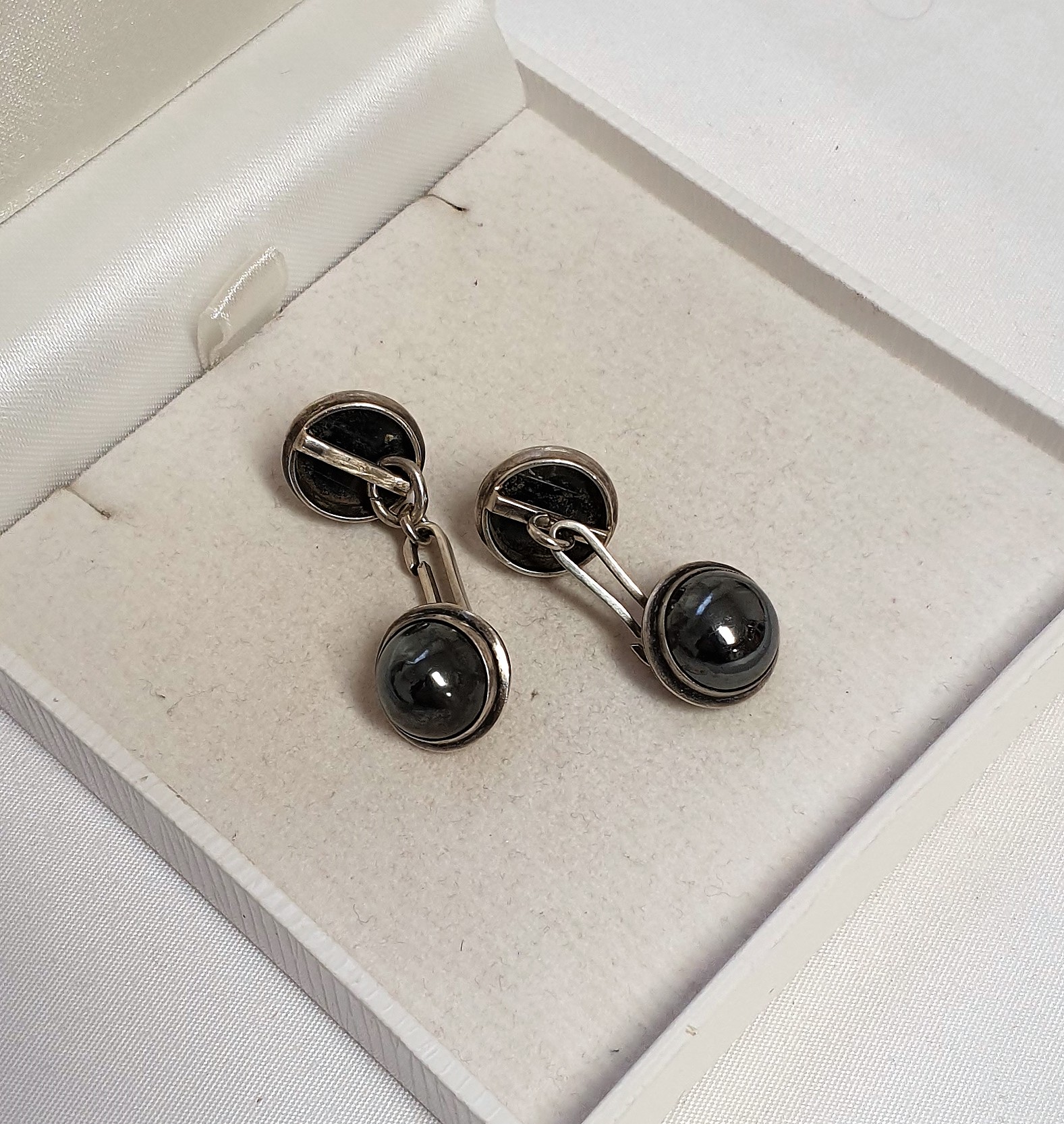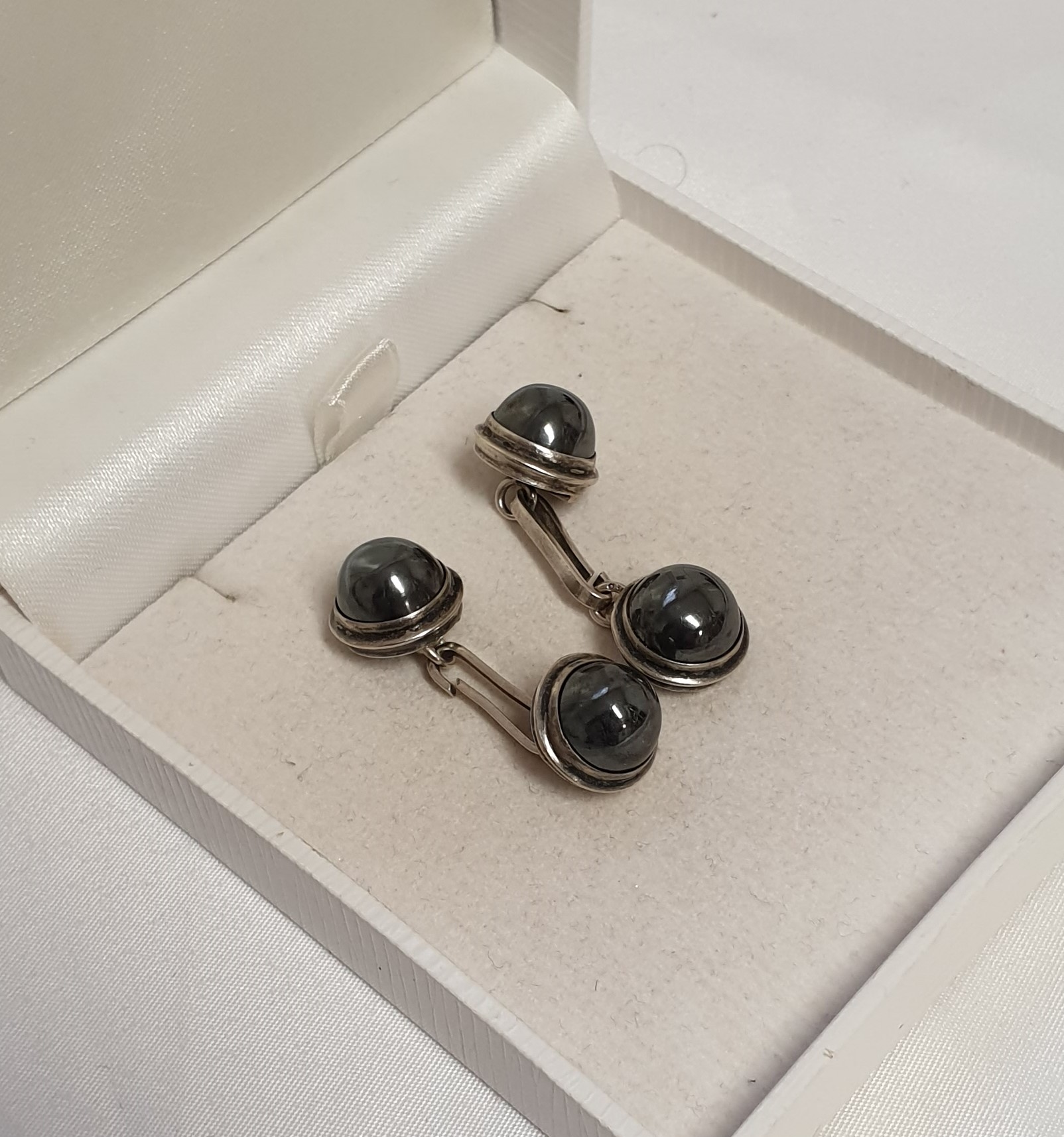 Nostalgische Manschettenknöpfe / Cufflinks aus Silber 830, mit je einem Hämatit auf jeder Seite besetzt.