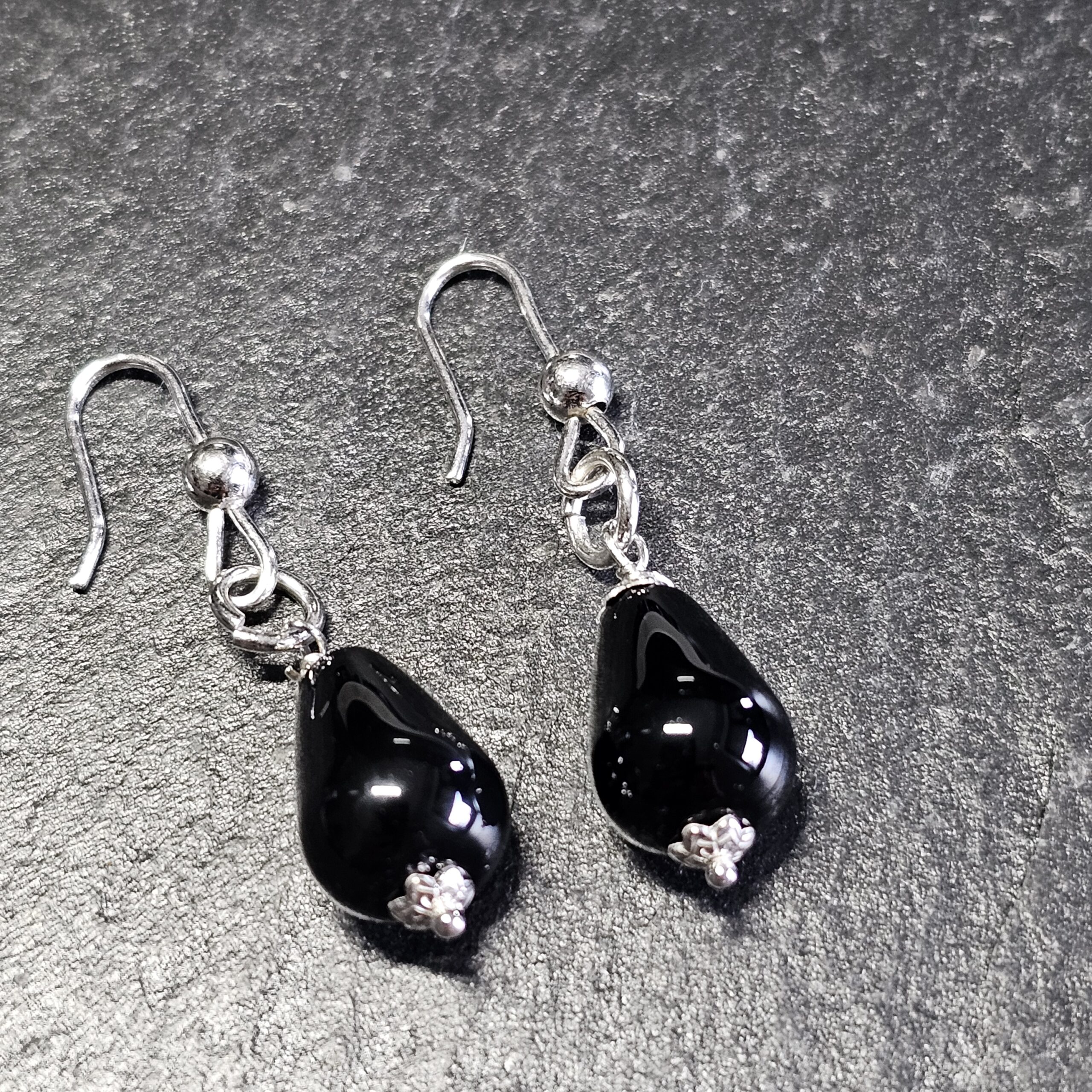 Wunderschöne Ohrringe / Ohrhänger mit je einer schwarzen Perle geschmückt.