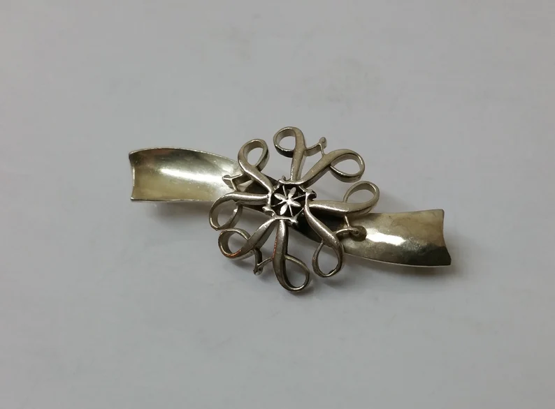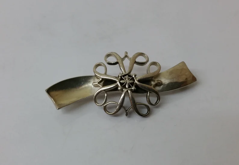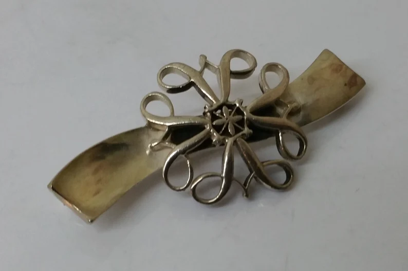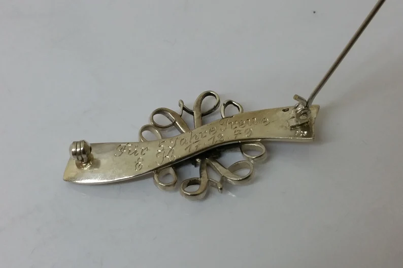 Sehr schöne Vintage Brosche in nostalgischem Design. Sie trägt auf der Rückseite eine Gravur: „Für 5 Jahre Treue E. K. 17.12.79“. Ein seltenes Stück.