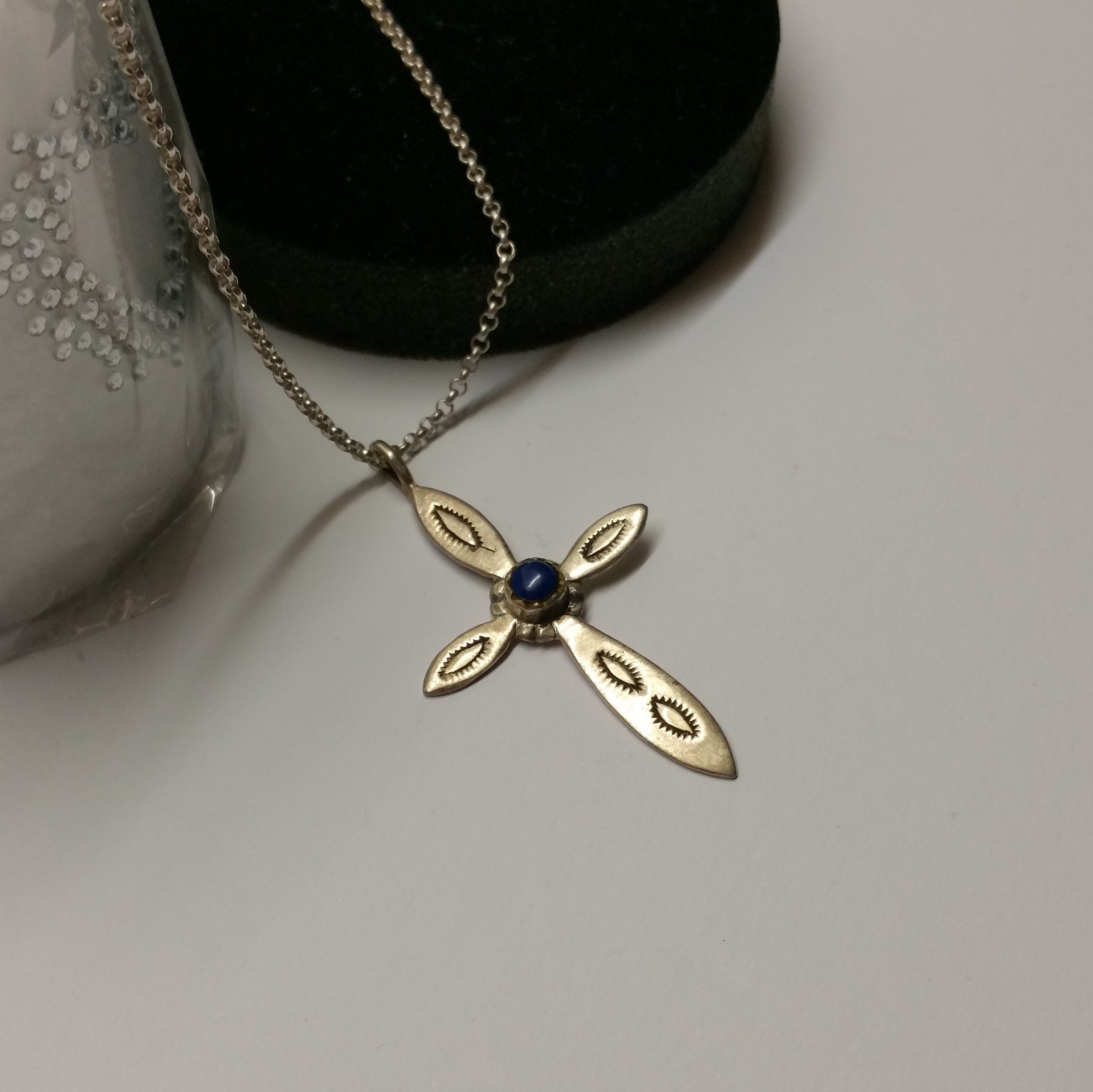 Schöne Silberschmiedearbeit – nostalgischer Kreuzanhänger mit Lapislazuli-Stein.