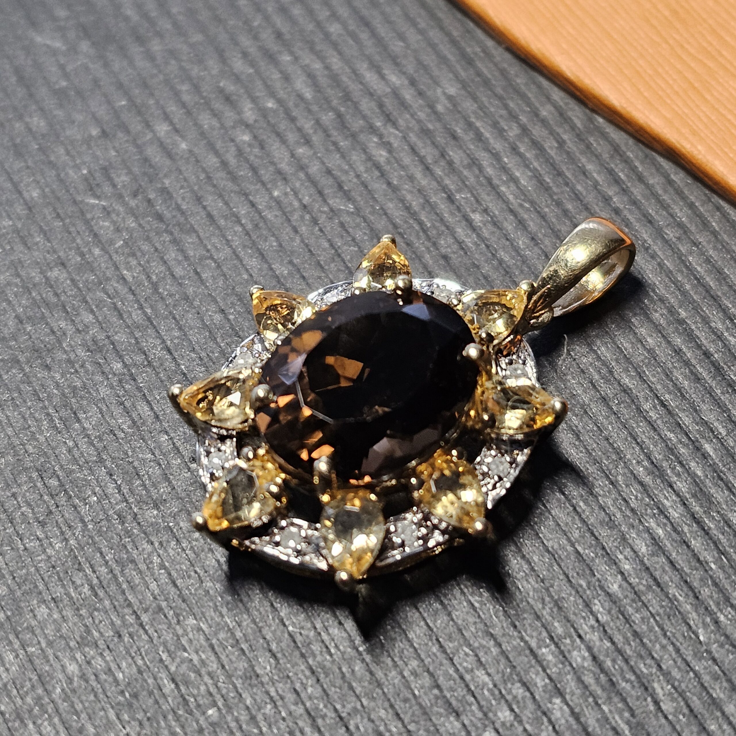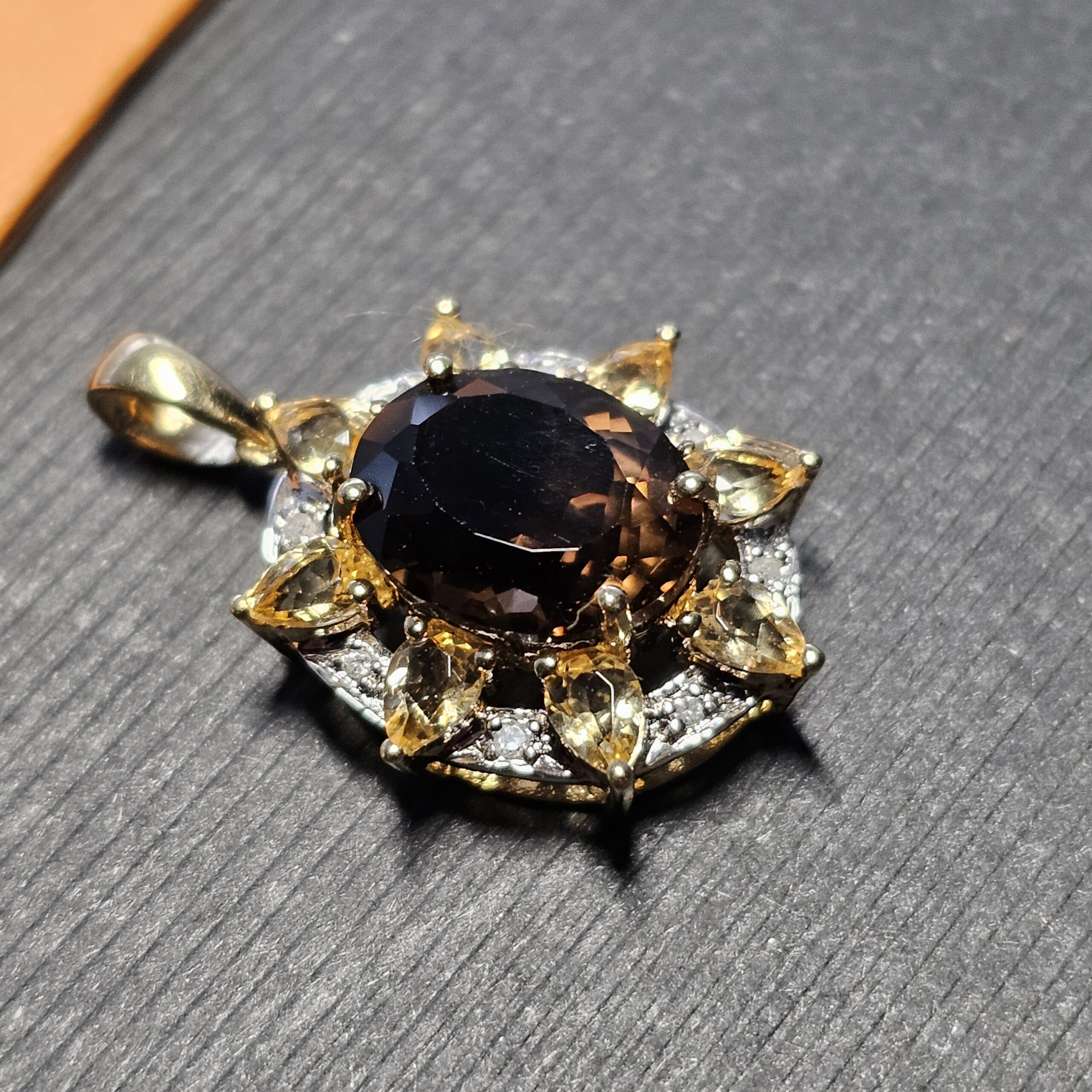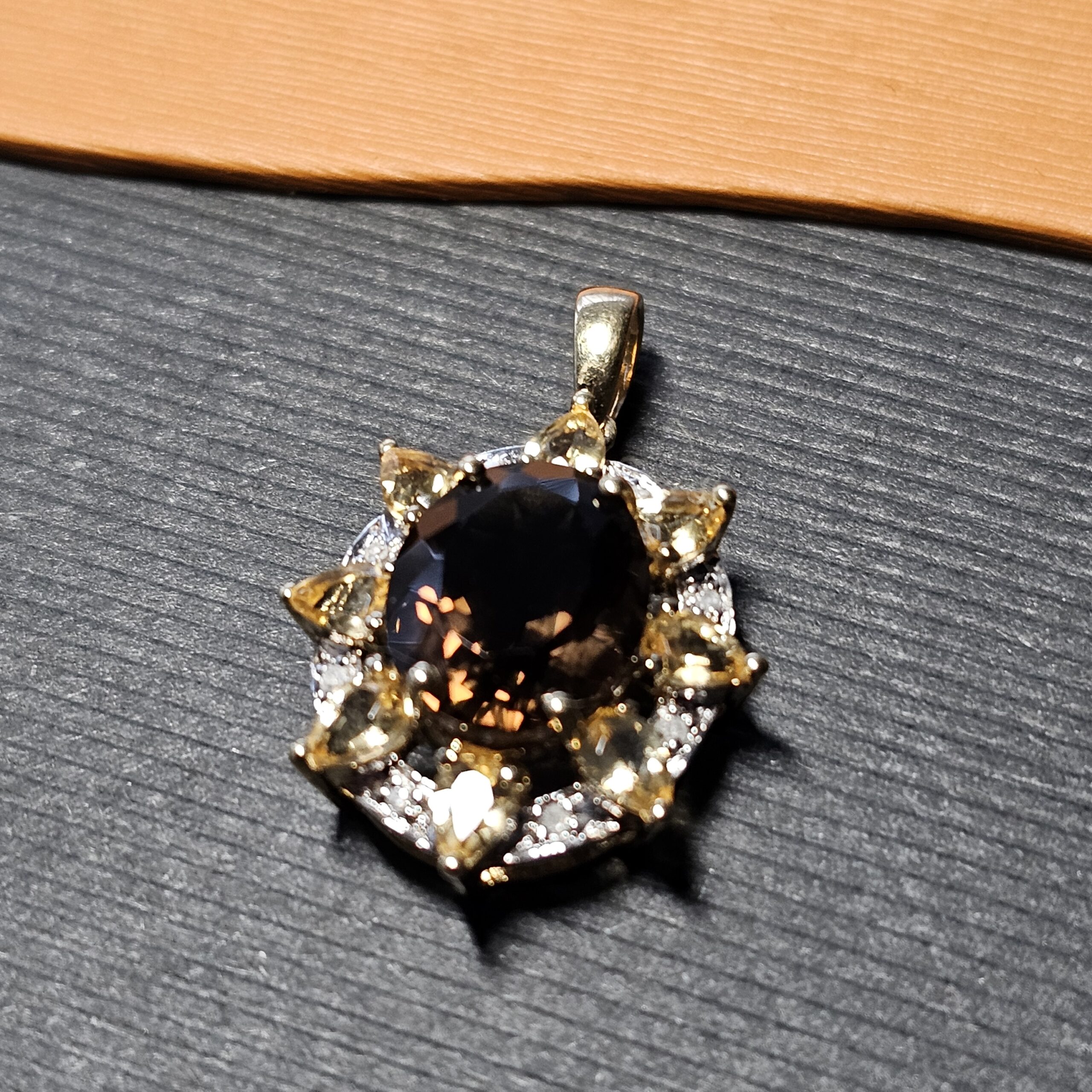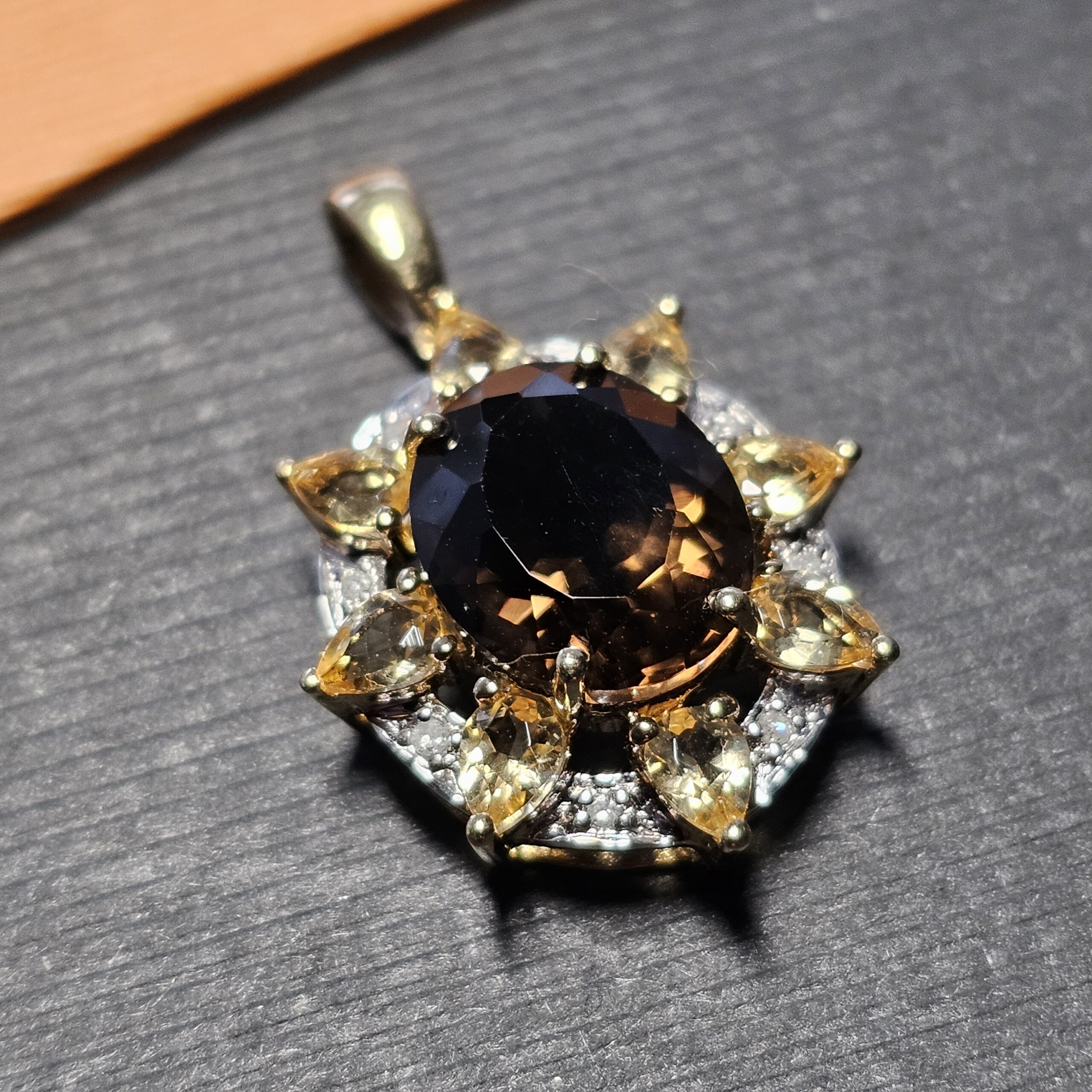 Hübscher Anhänger aus Gold 375. Ein toller Rauchquarz umrandet mit tropfenförmigen Citrinsteinchen und kleinesten Diamantsteinchen auf platiniertem Untergrund schmücken das schöne Stück.