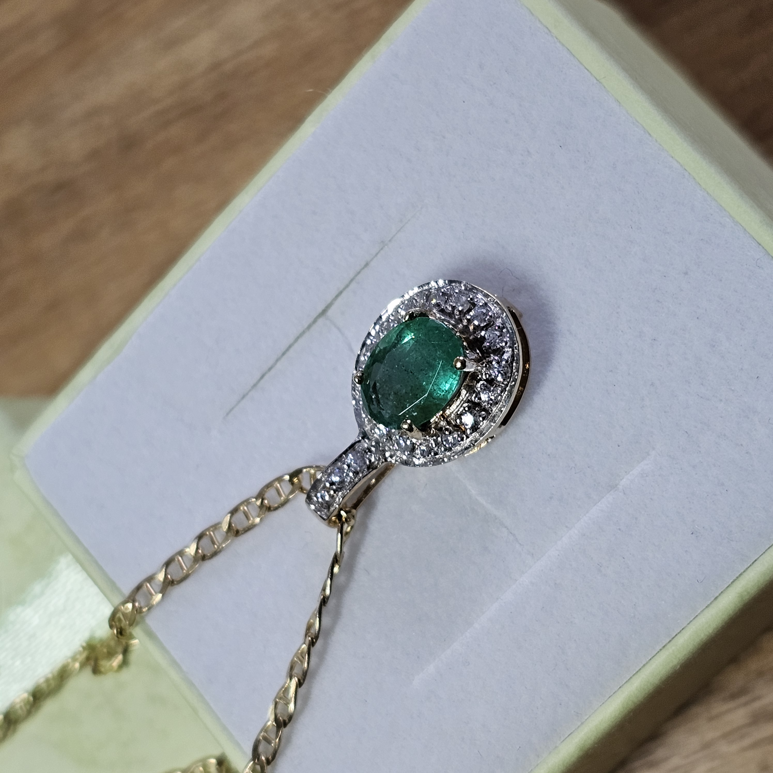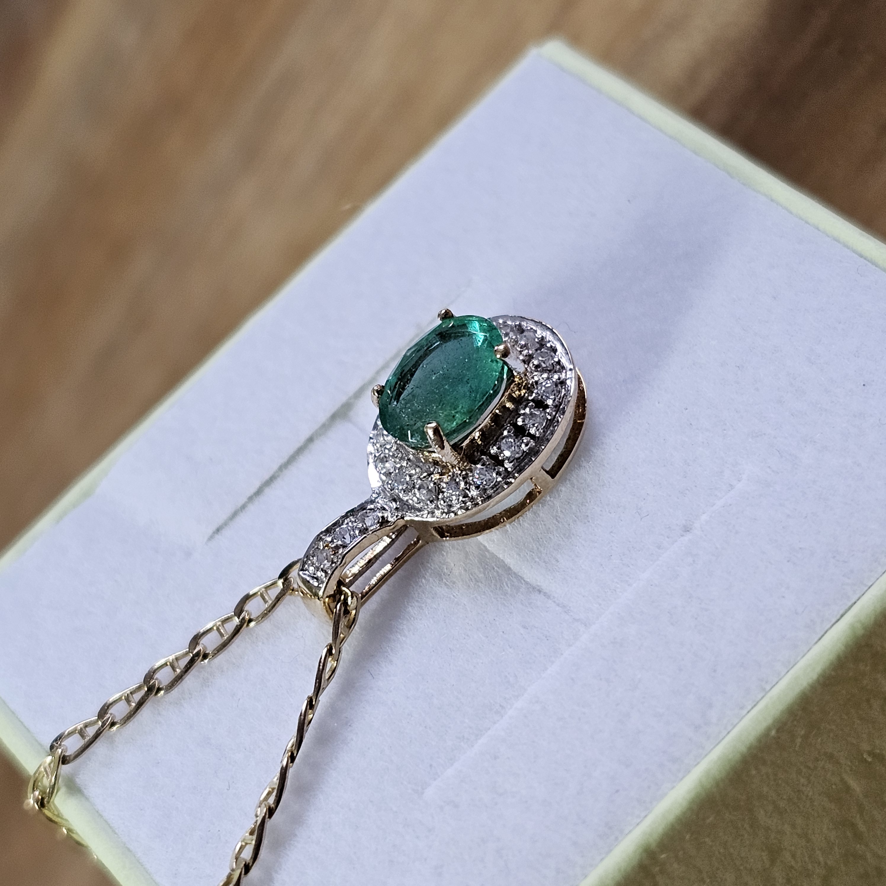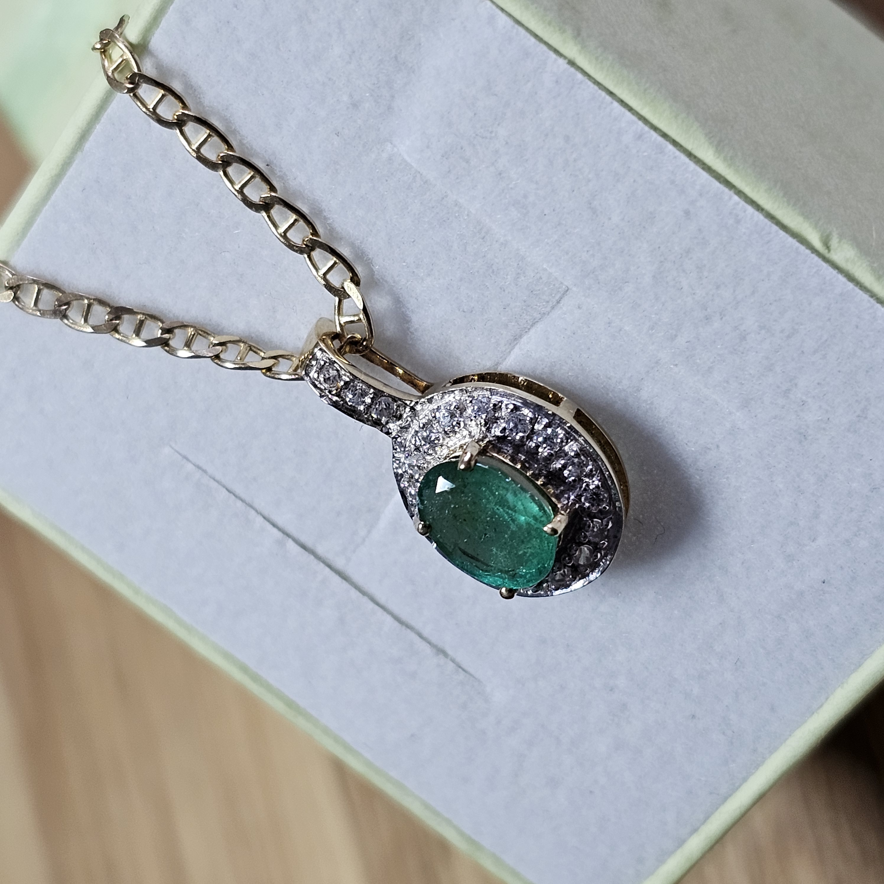 Hübscher Anhänger Gold 375 mit je einem Smaragd besetzt. Das Design um den Stein herum ist teilplatiniert und mit kleinen klaren Kristallsteinchen geschmückt.