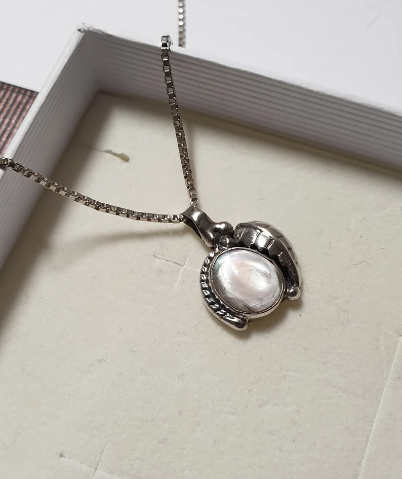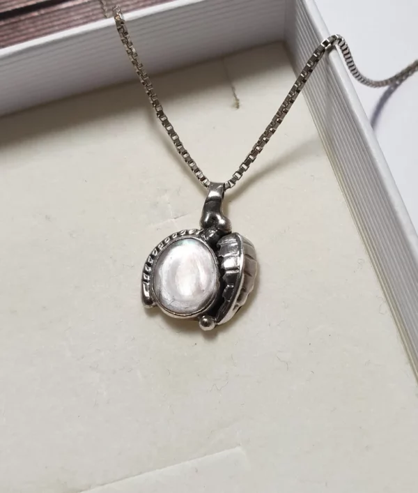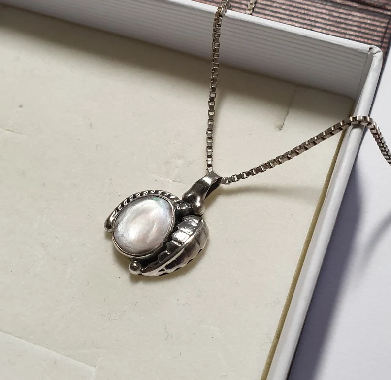 Anhänger Silber 900 (geprüft, nicht gepunzt). Verziert ist das schöne Stück mit einem nostalgischen Design, mittig sitzt eine Perlmutt-Einlage. Eine wunderschöne Silberschmiedekunst! Ein echtes Unikat!