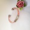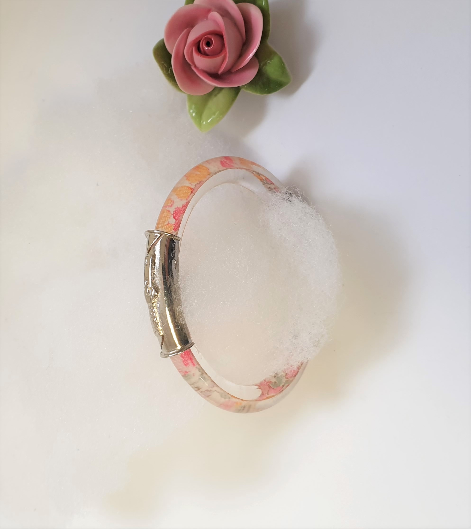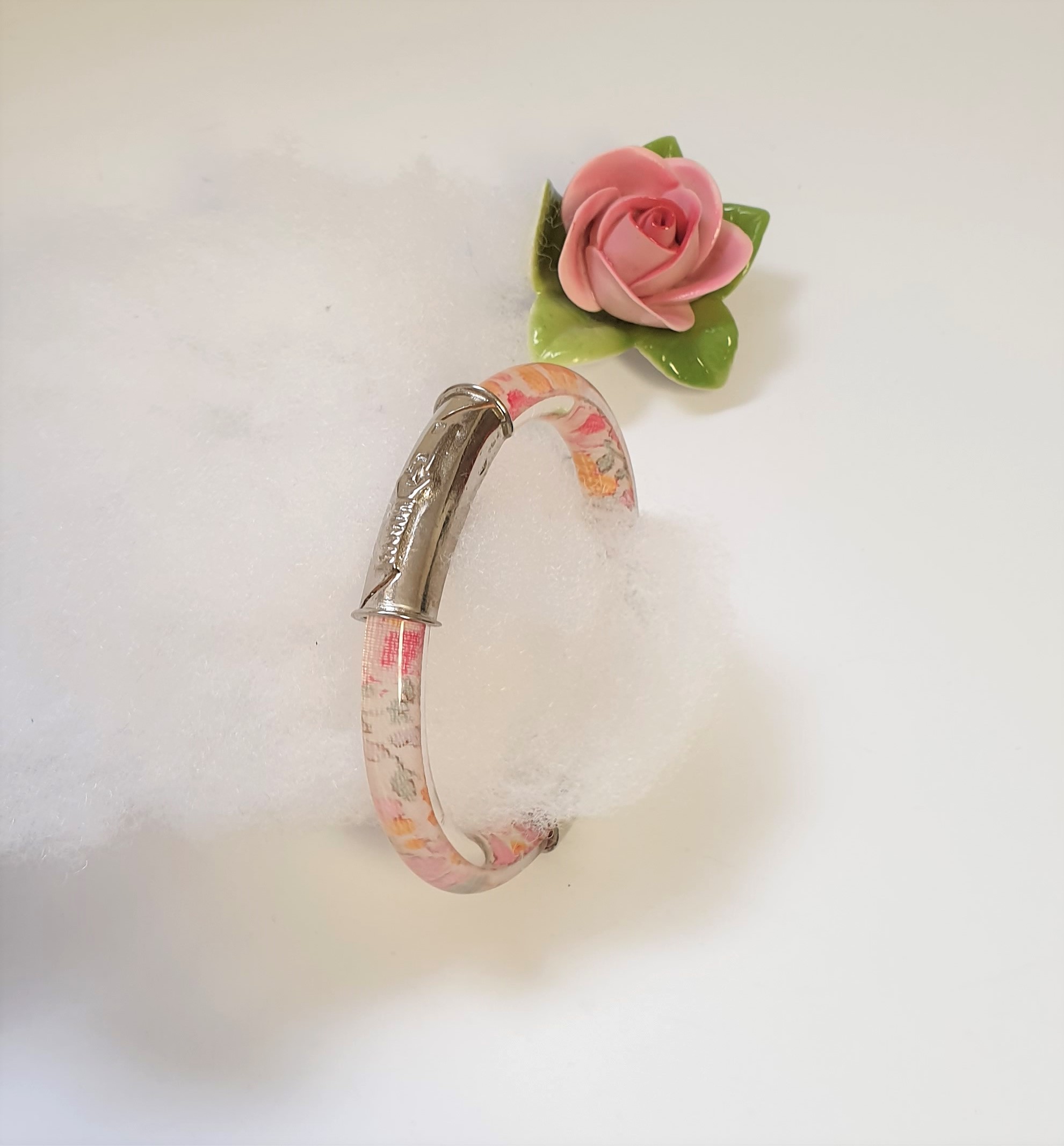 Toller nostalgischer Armreif aus Resin Harz. Im Inneren des Armreifs ist ein Textilstück mit einem bunten Blumendesign eingelegt. Oben auf dem Armreif ist ein Silberelement mit einem Reißverschluss abgebildet. Zum Abschluss ist an jedem Ende des Armreifs ein Silberelement angebracht. Eine wunderschöne kunstvolle Arbeit!