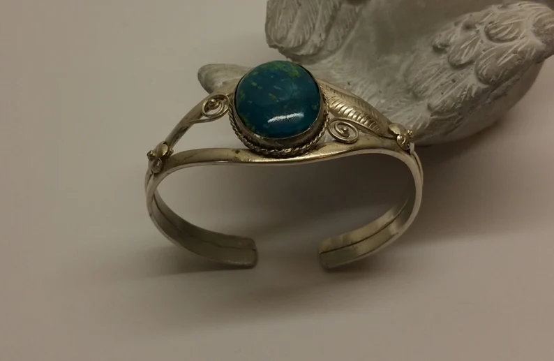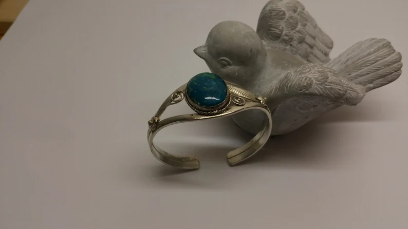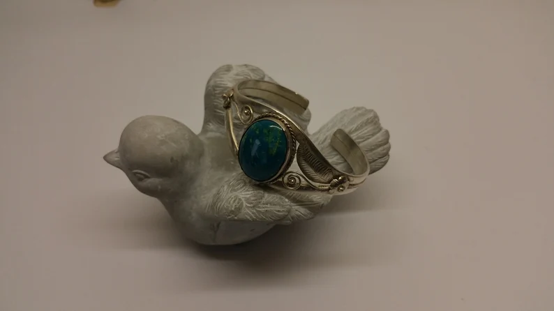 Handgefertigter nostalgischer Armreif mit einem Chrysokoll-Stein und mit einer schönen Silberschmiedeverzierung gearbeitet.