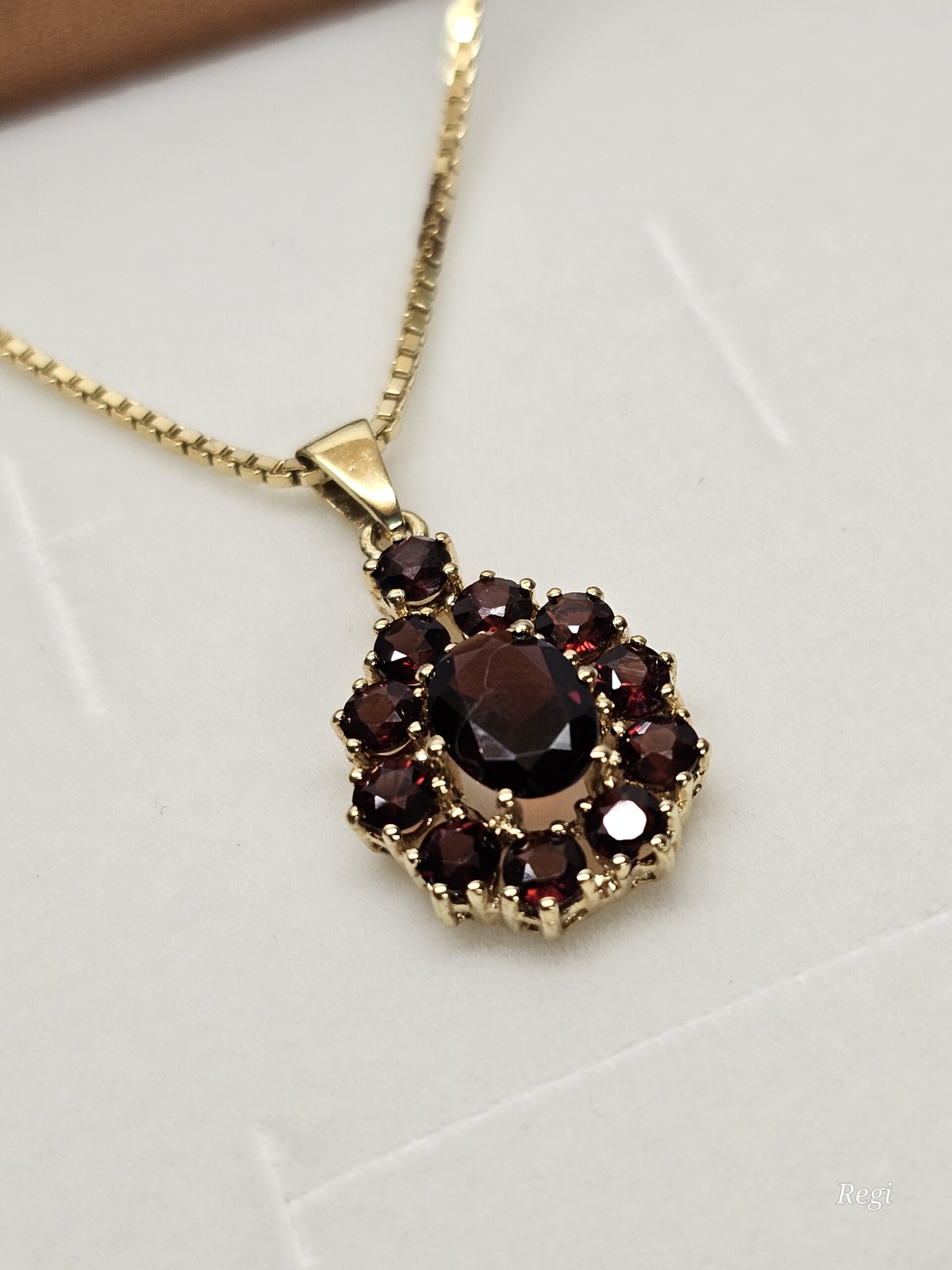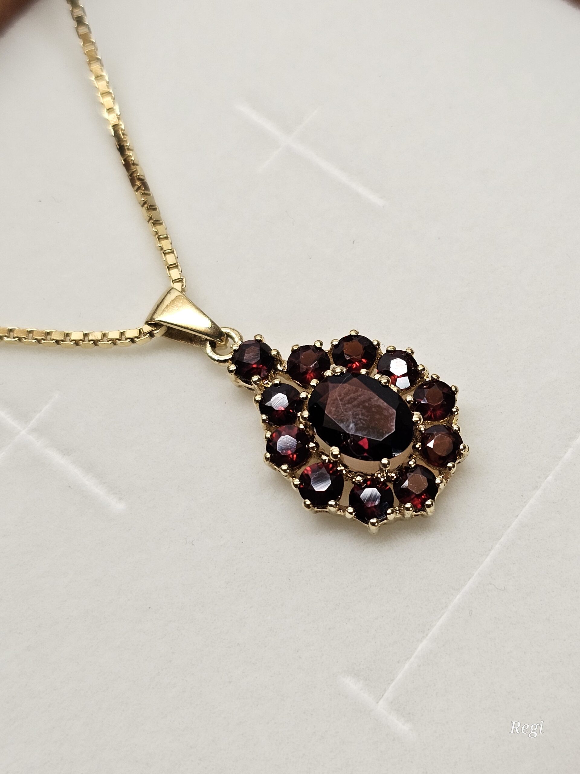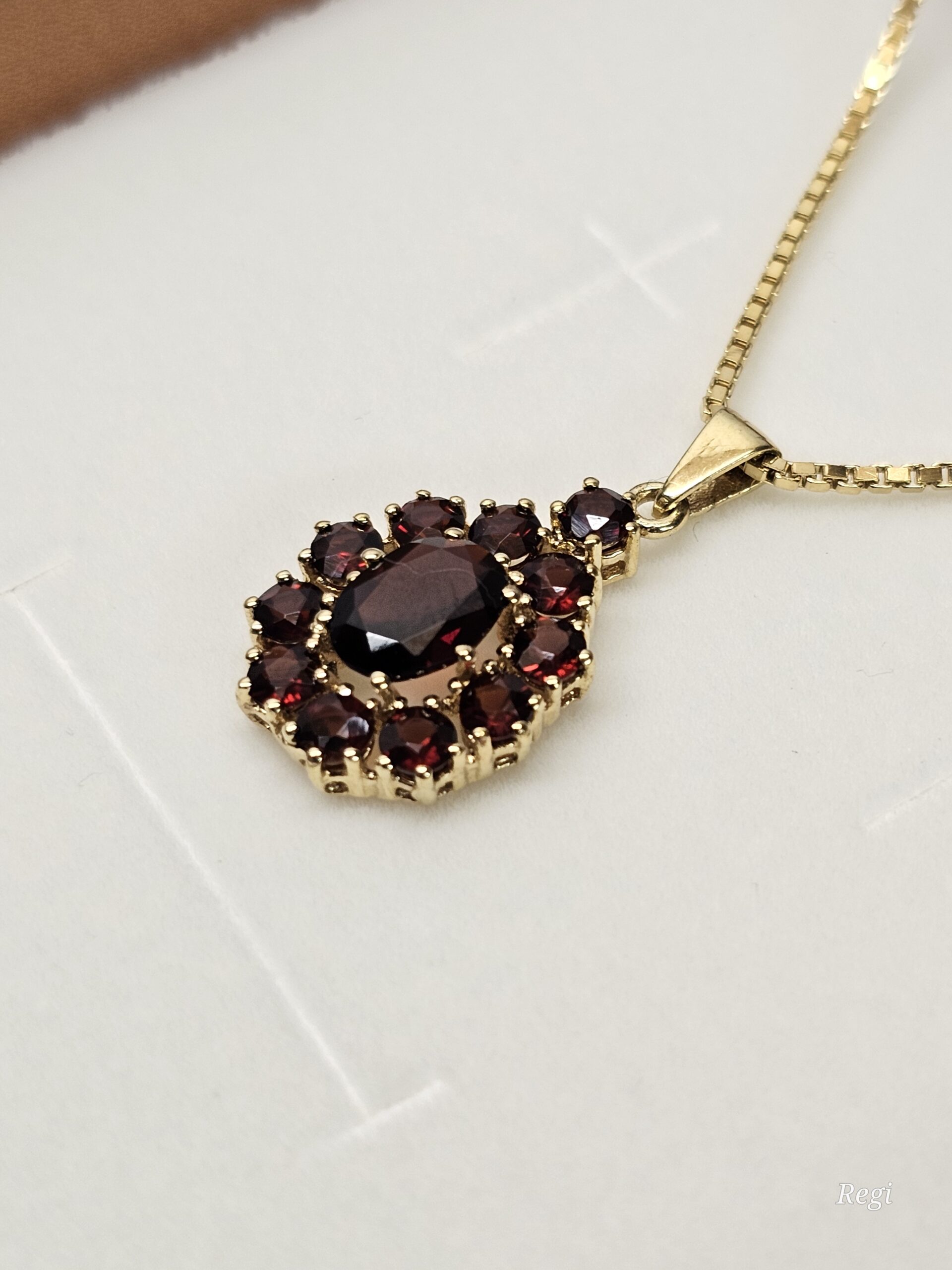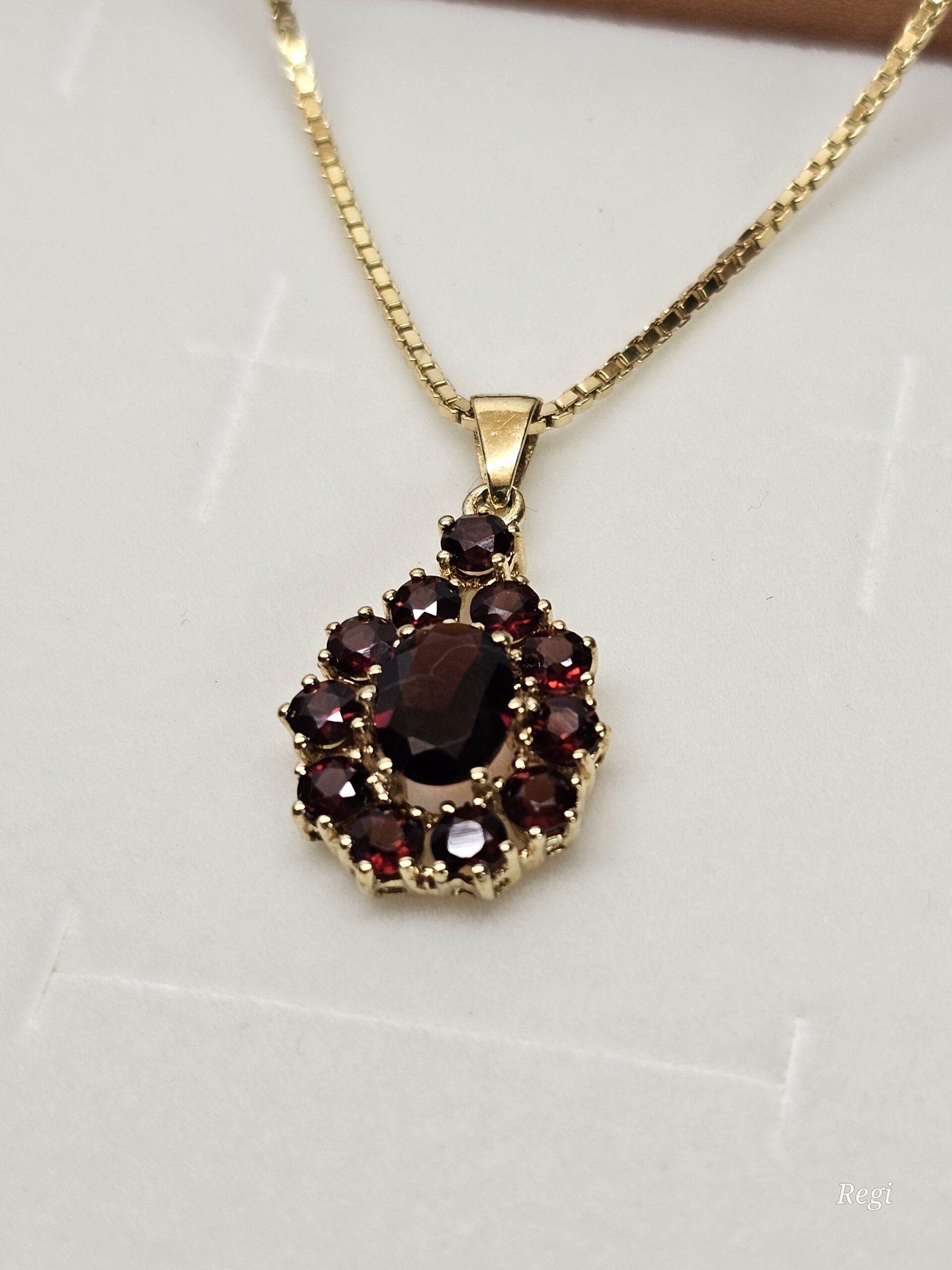 Nostalgischer Shabby Vintage Anhänger Gold 333 mit Granatsteinen verziert.