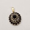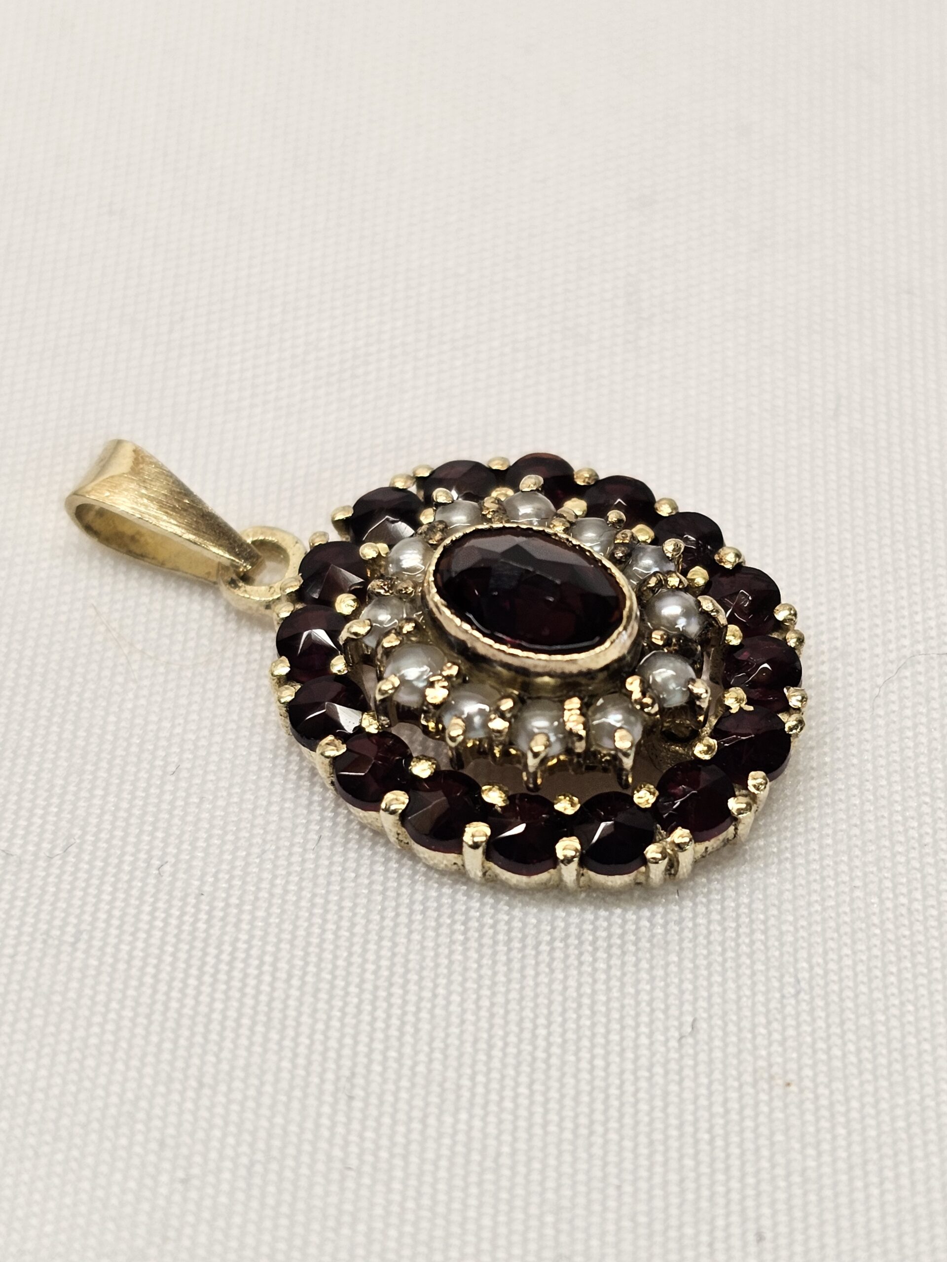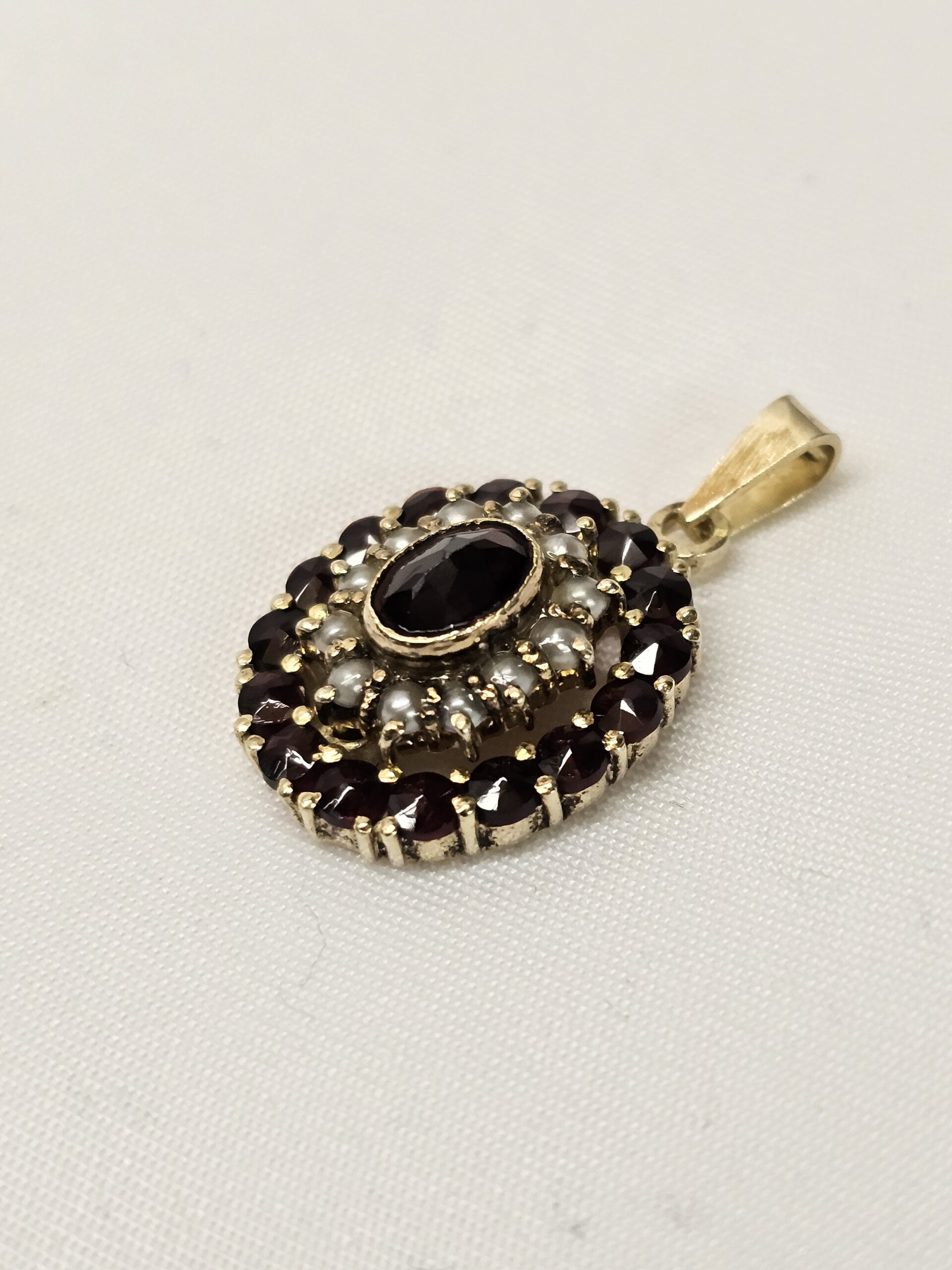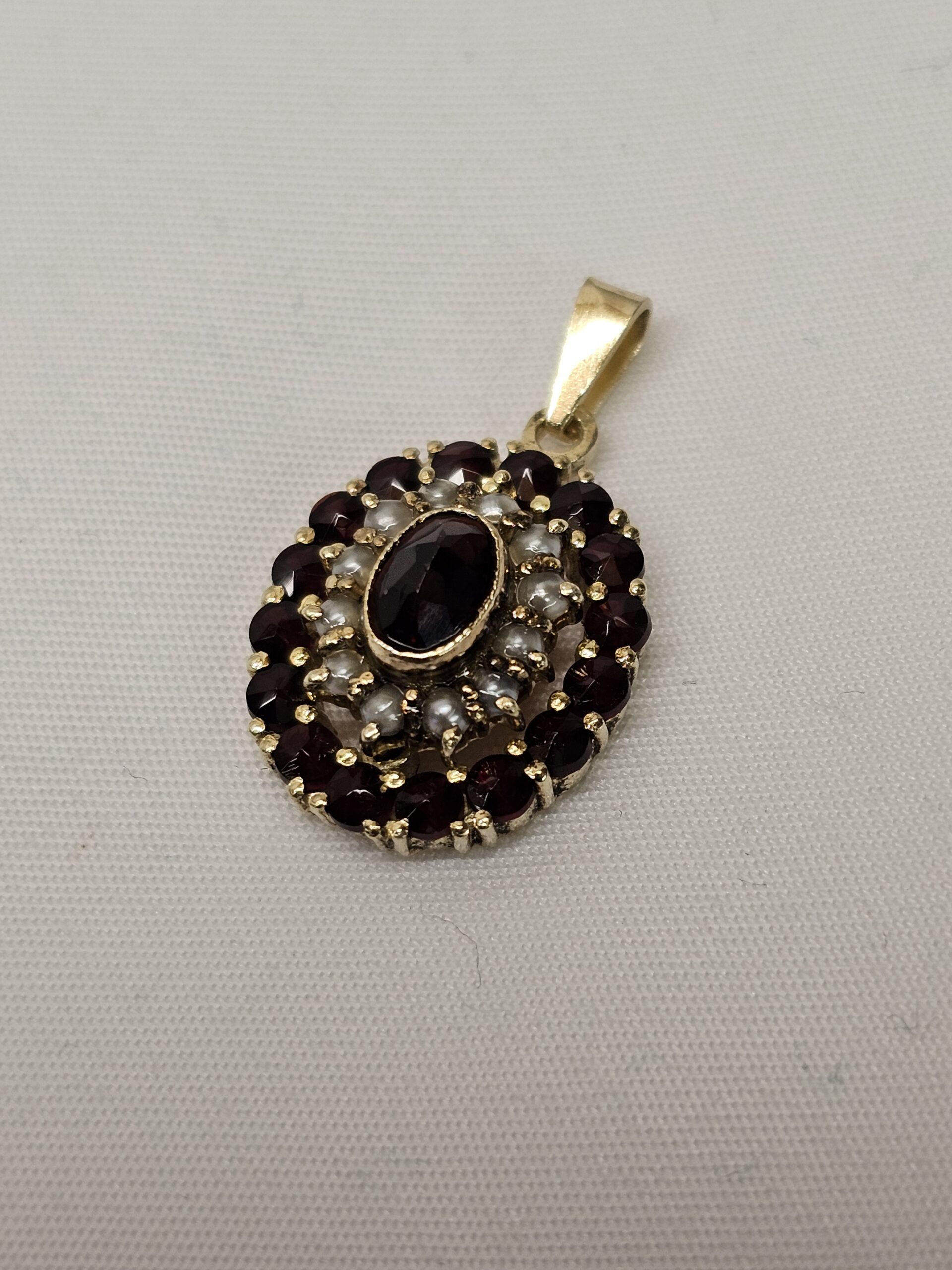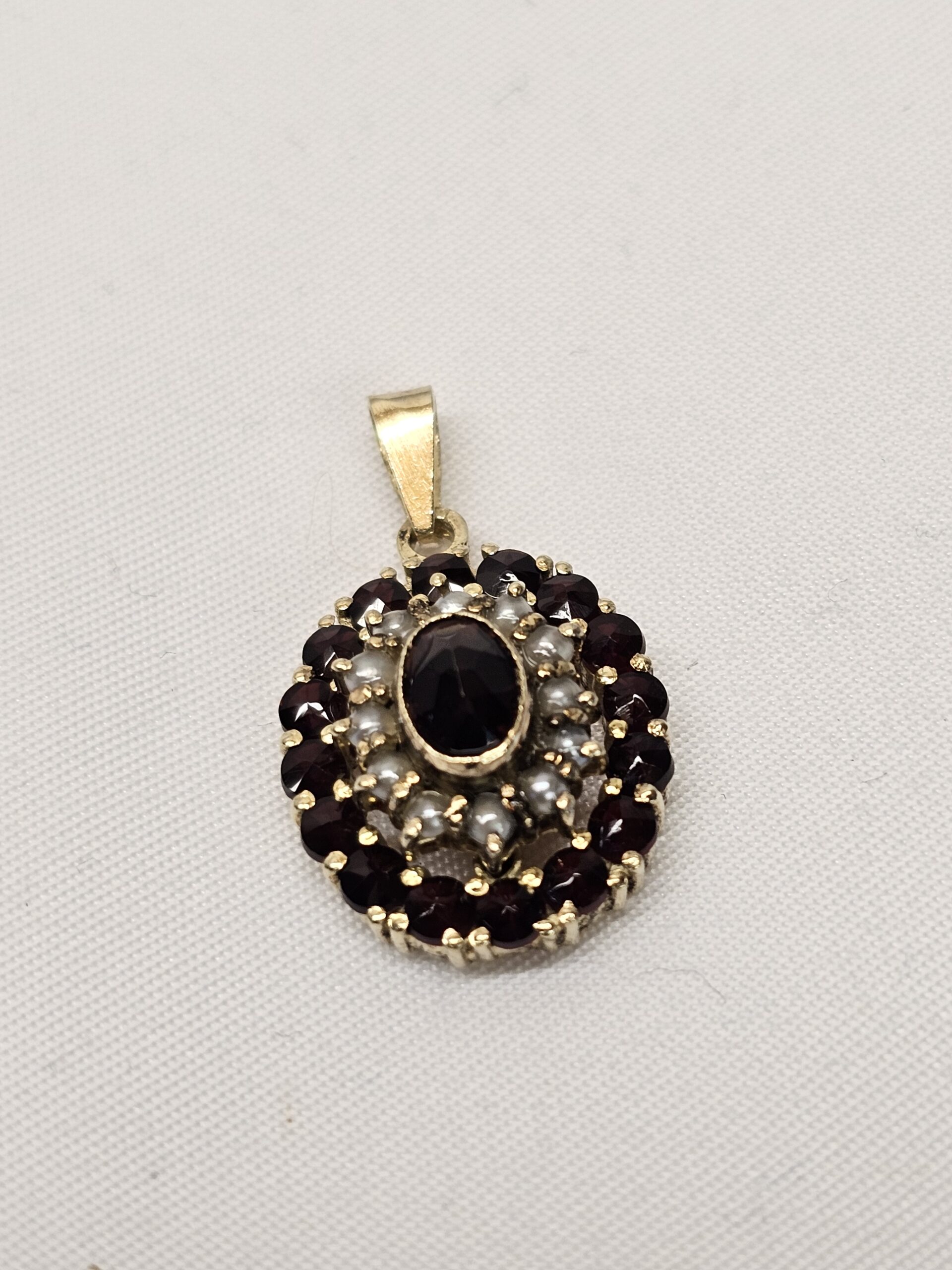 Wunderschöner Vintage-Anhänger Silber 900 vergoldet und mit kleinen weißen Perlen und Granat-Steinchen besetzt.