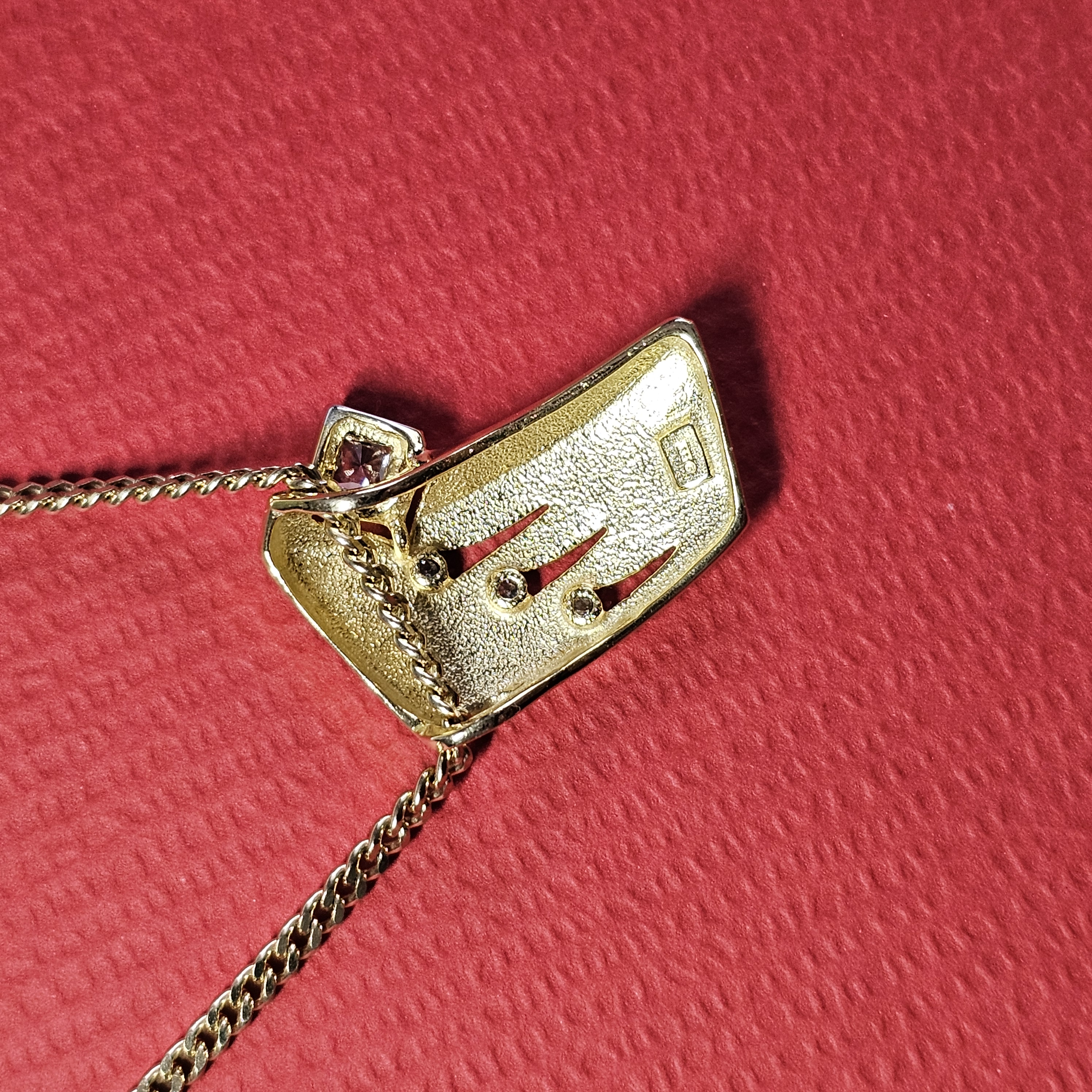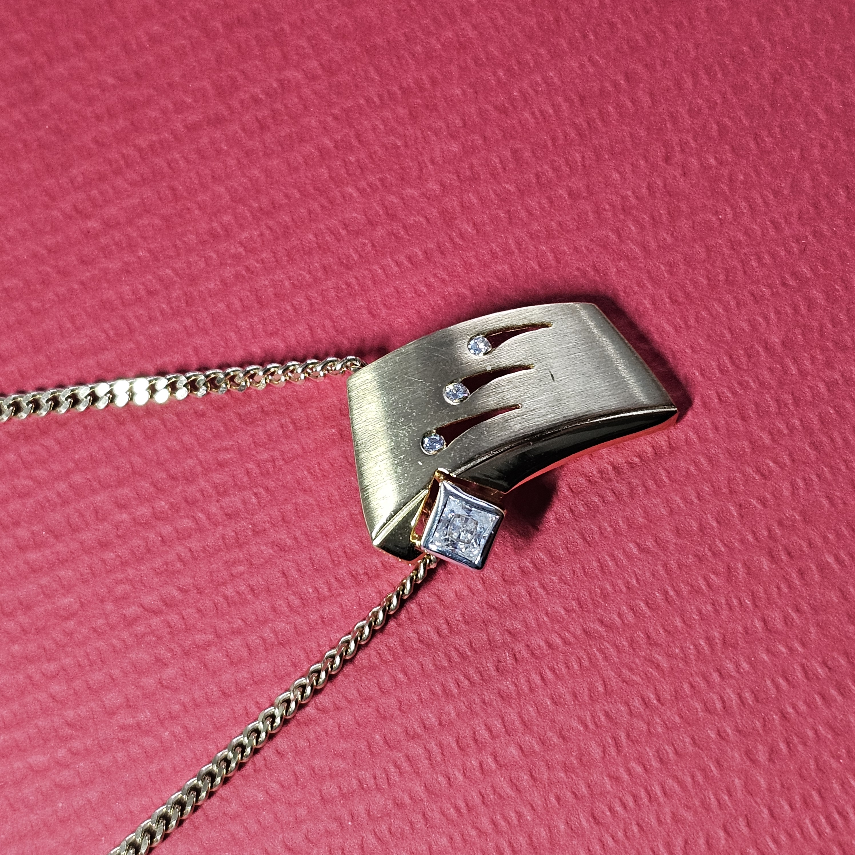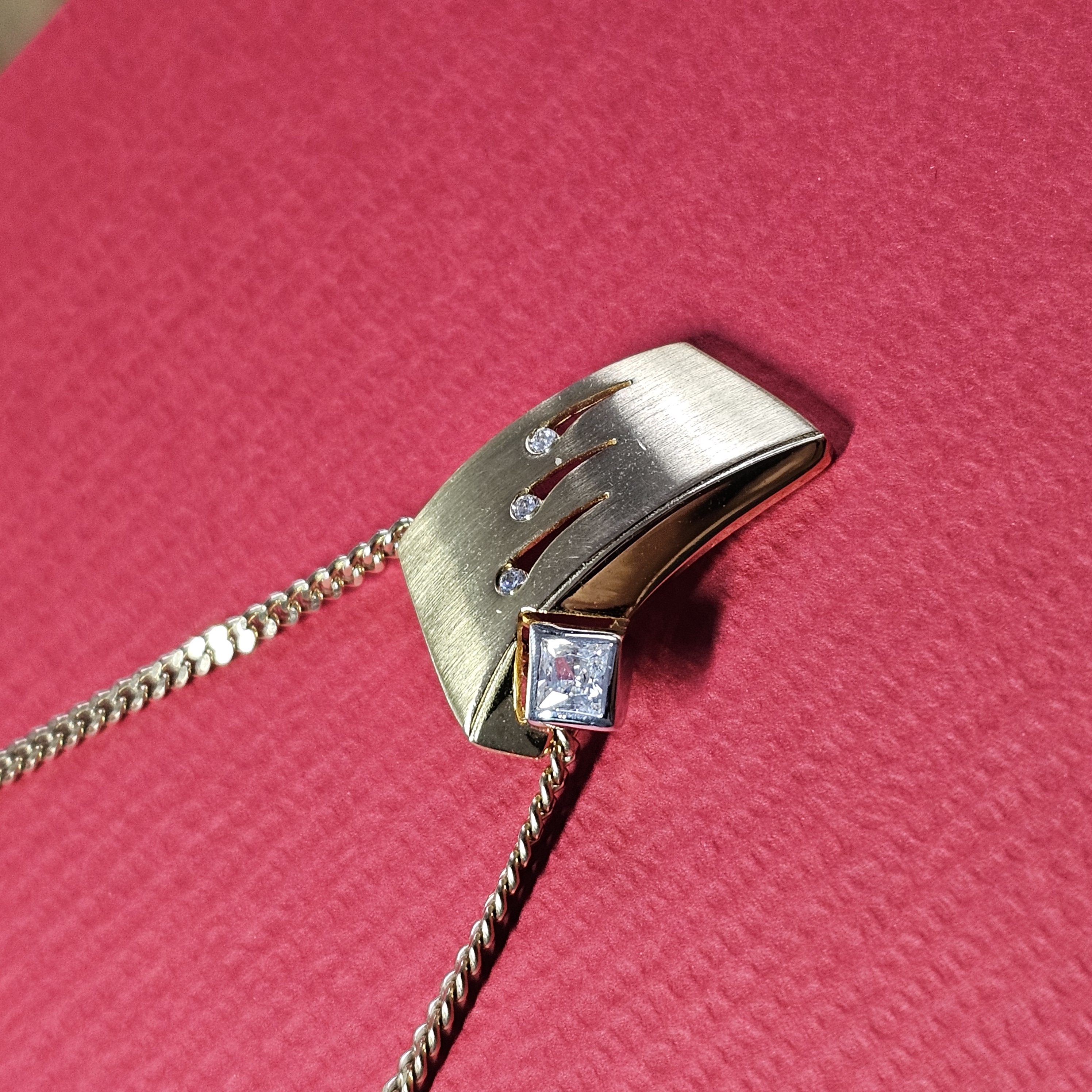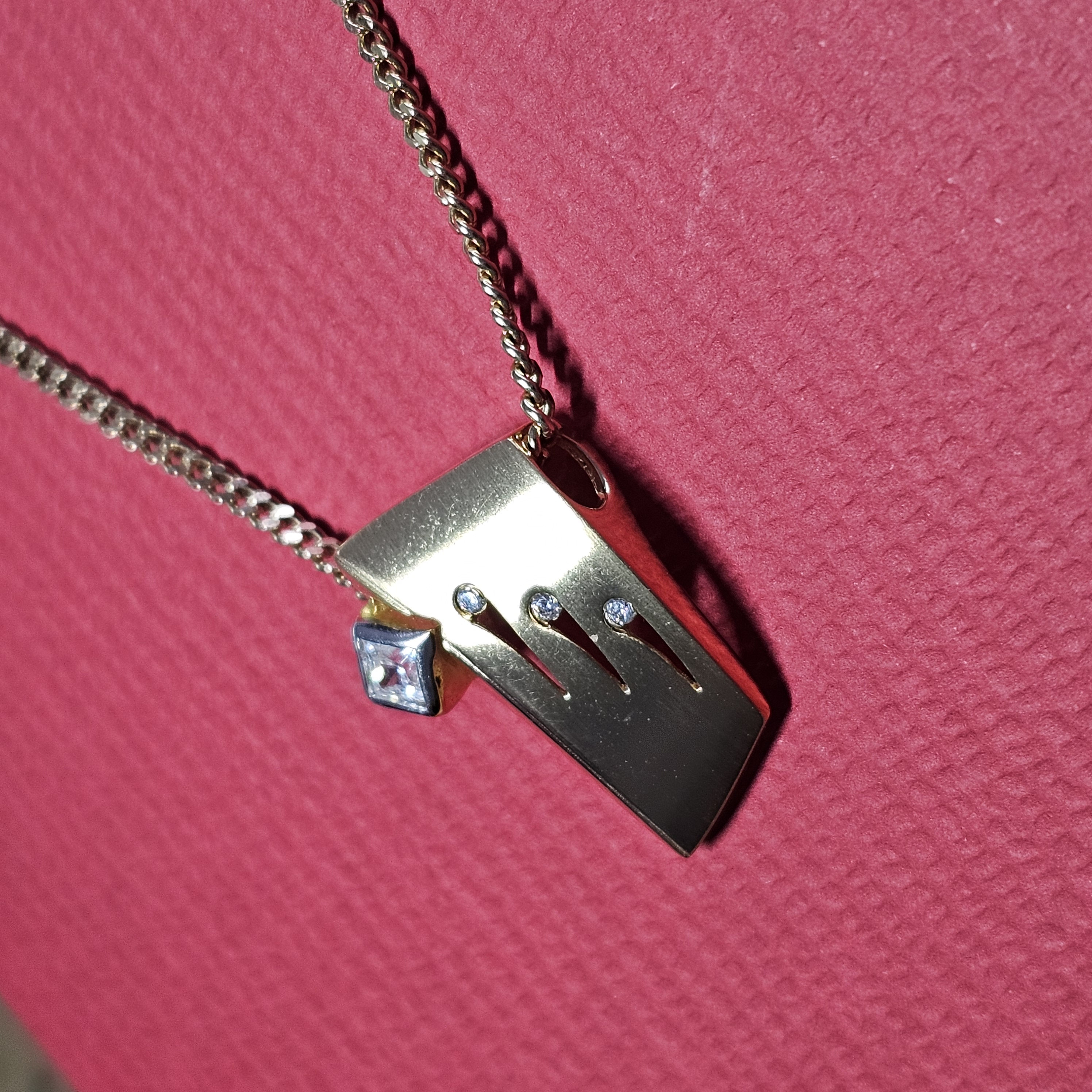 Stylischer Vintage-Anhänger Gold 333 matt/glänzend. Ein sehr schönes und modisches, teils durchbrochen gefertigtes, Design mit einem rechteckigen klaren Kristallsteinchen besetzt. Leichte Platiniertung an der Steinumrandung. das durchbrochene Design ist mit 3 Stck. kleinen runden klaren Kristallsteinchen geschmückt. Die Ösen sind an der Rückseite angebracht. Wunderschön!