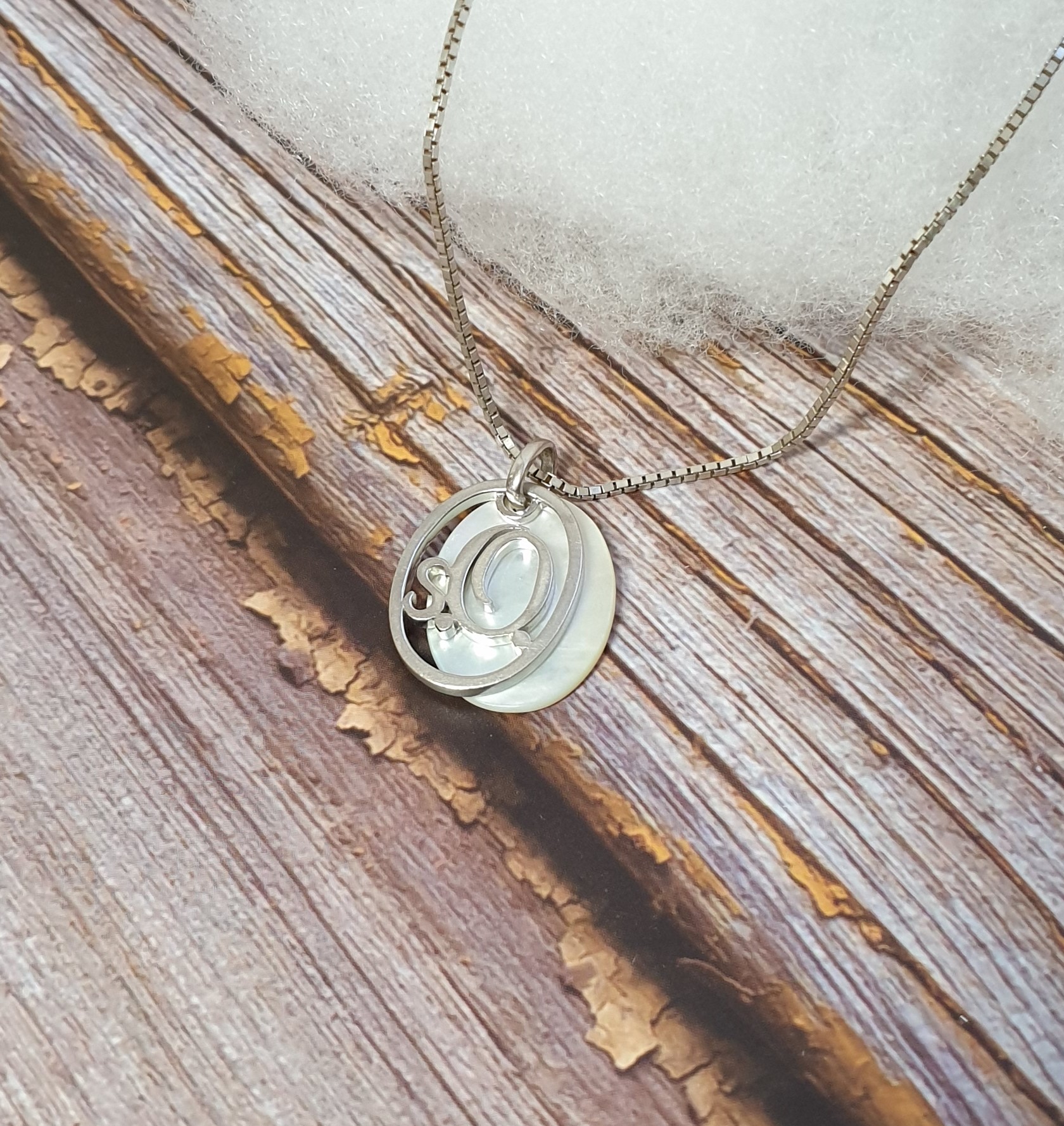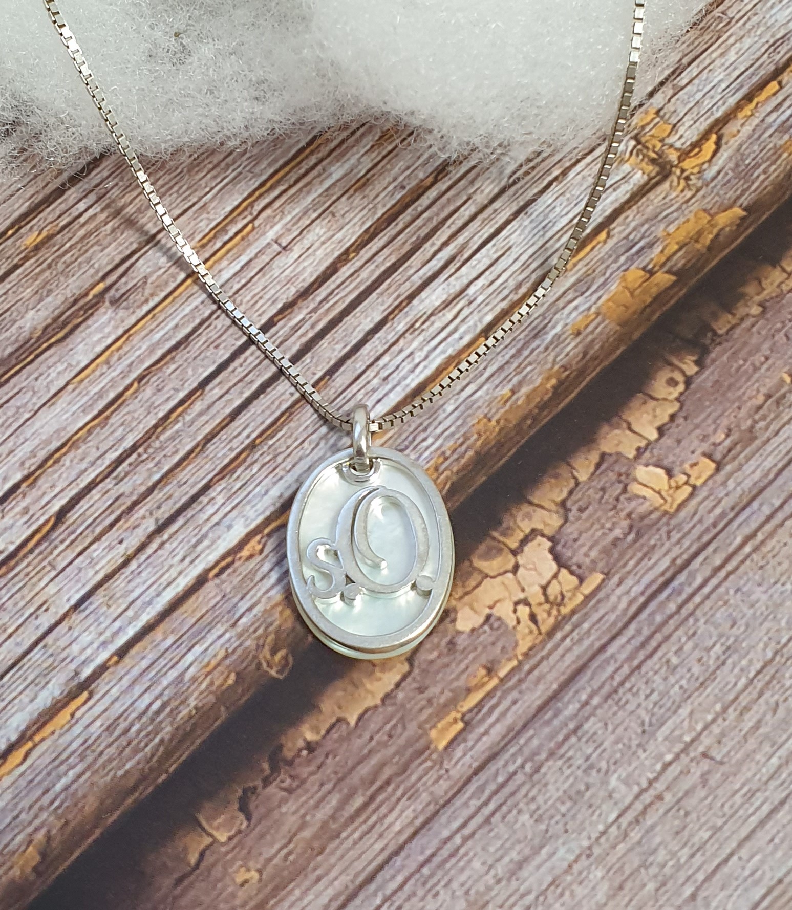 Stylischer Silber-Anhänger Silber 925 mit dem Buchstaben/Initialen O.S. und einer Perlmuttplatte. Das Design ist als Doppelanhänger gestaltet und die beiden Anhänger sind beweglich.